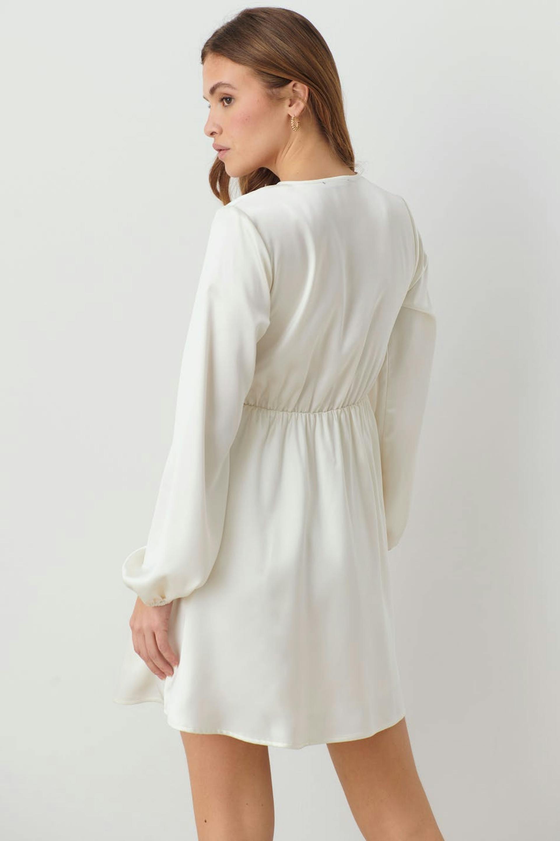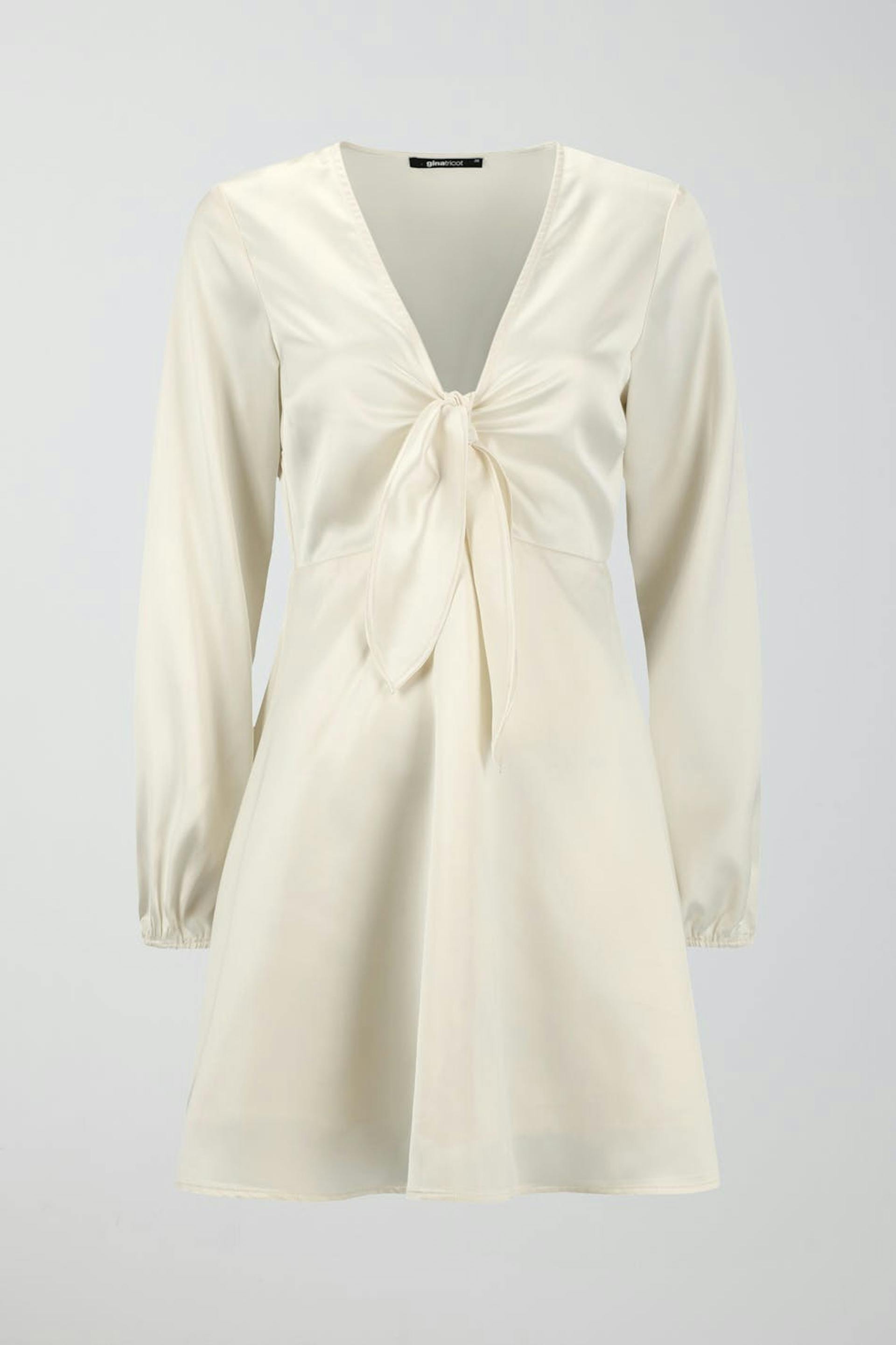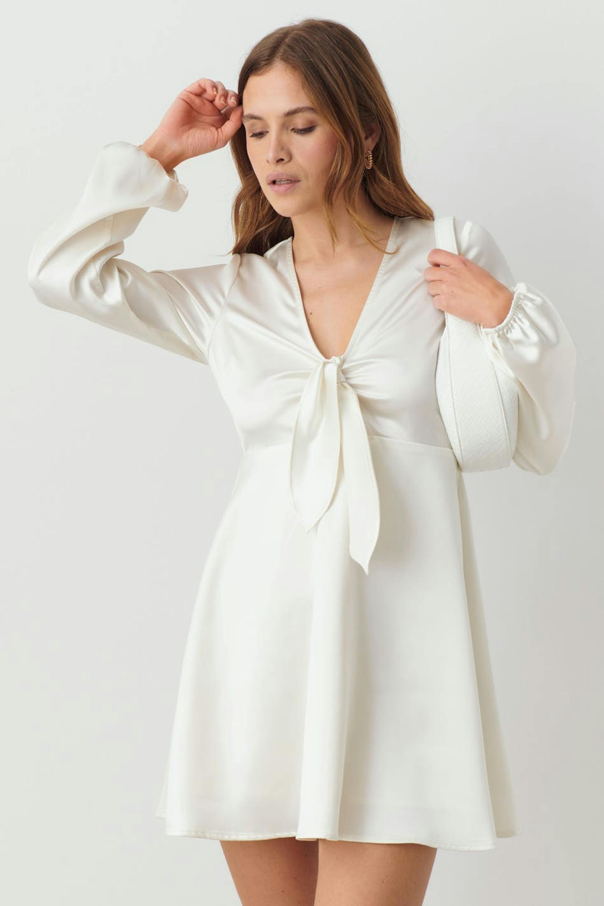 Mini jurk met lange mouwen van satijn met zelfbinder aan de voorzijde. De jurk is wit en heeft normale pasvorm. Het heeft v-hals, cut-out-detail aan de voorkant en elastische manchettes.
