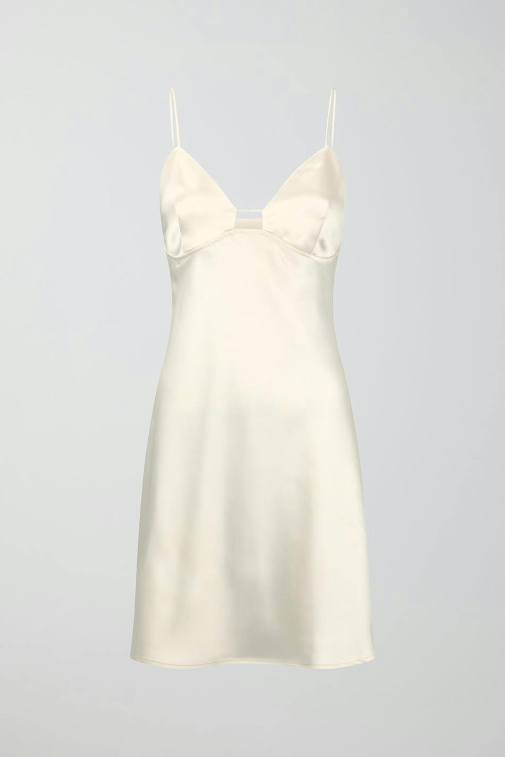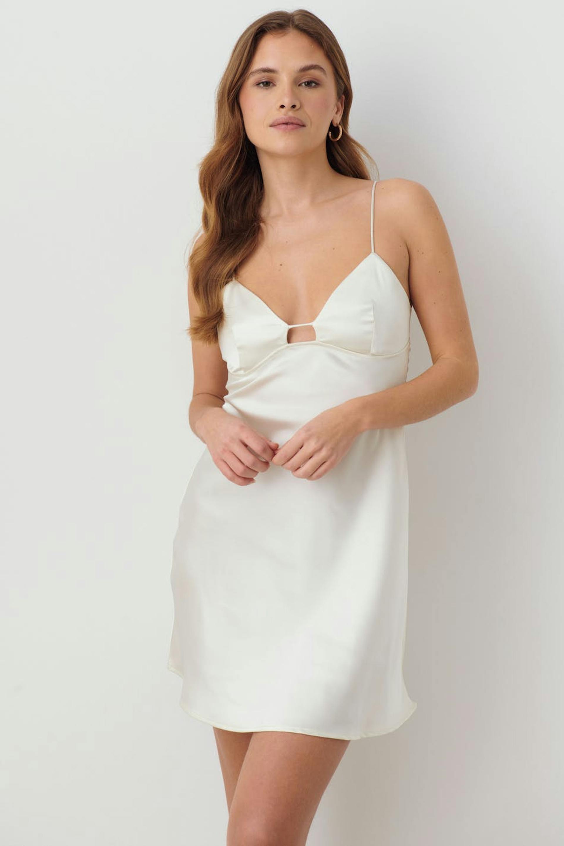 Korte satijnen jurk met cut-out-detail aan de voorkant. De satijnen jurk is wit en heeft dunne en aanpasbare schouderriemen. Het heeft een decoratieve zoom detail onder de boezem en rits op het achterpand.