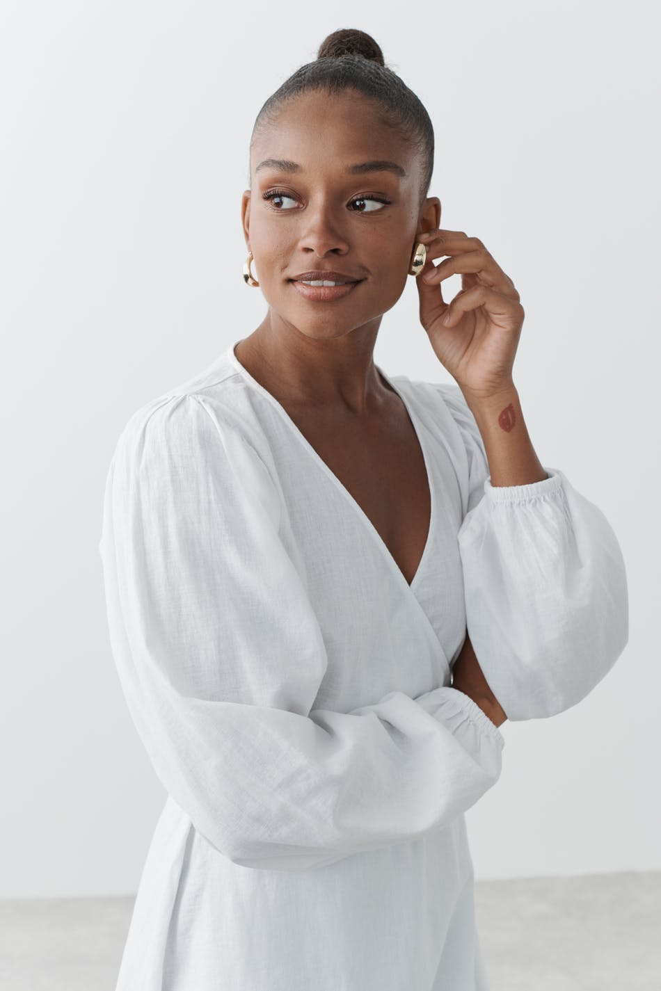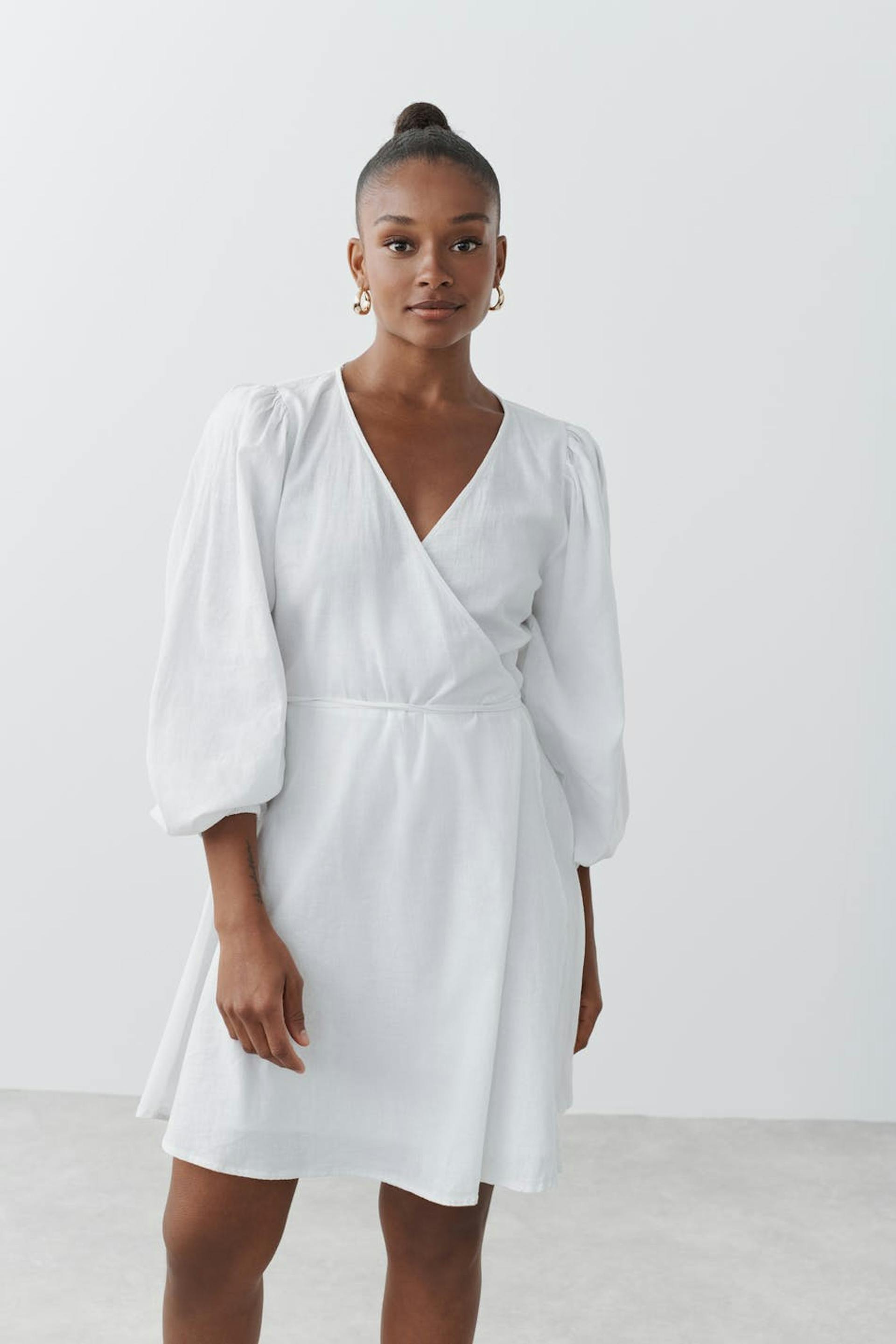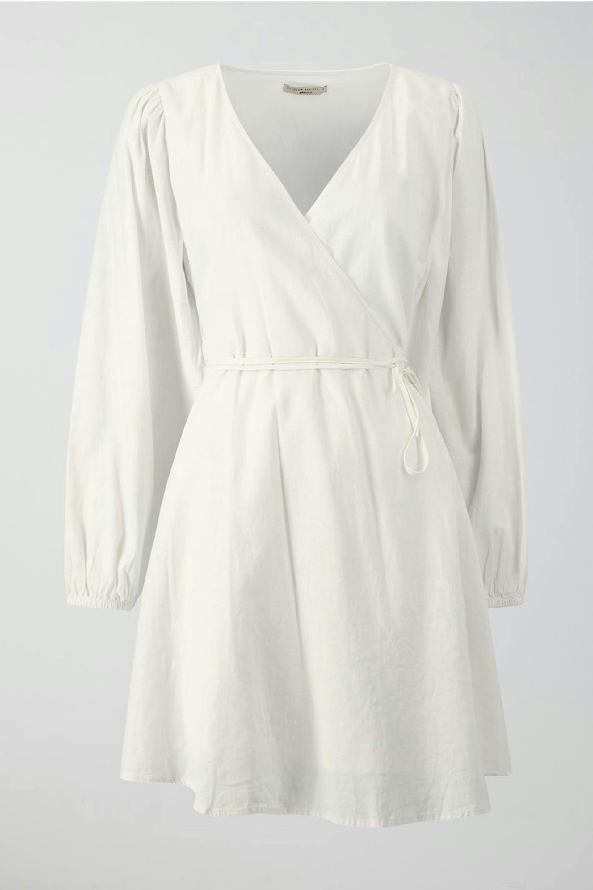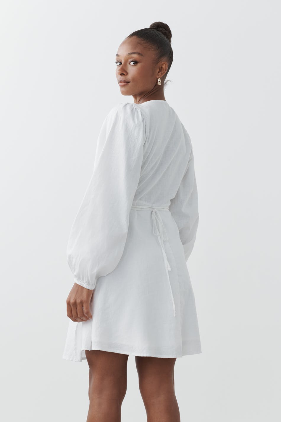 Korte linnen jurk met een lange pofmouw. De linnen jurk is wit en heeft een wikkel-ontwerp met een zelfbinder aan de taille. Het heeft een v-hals.