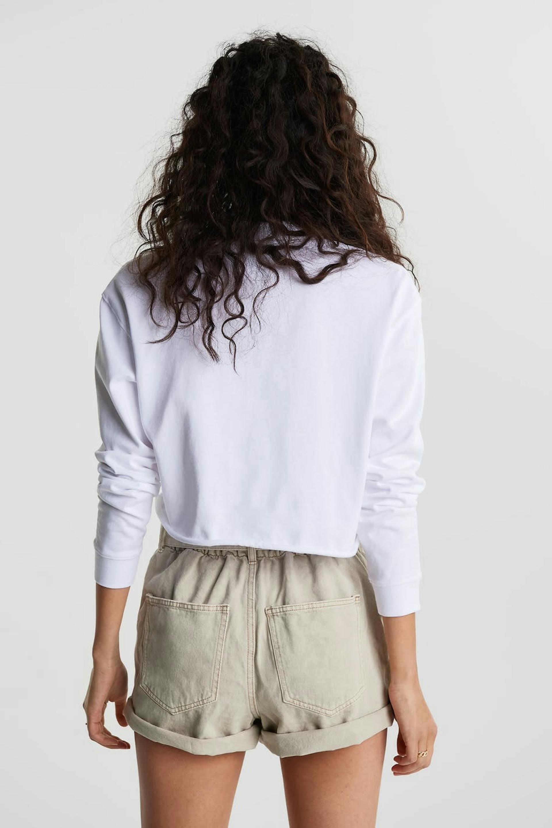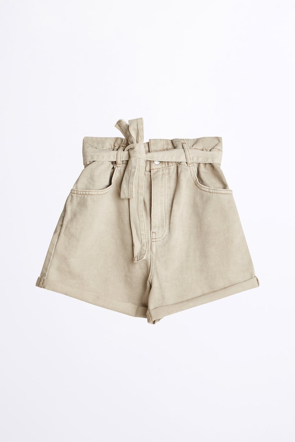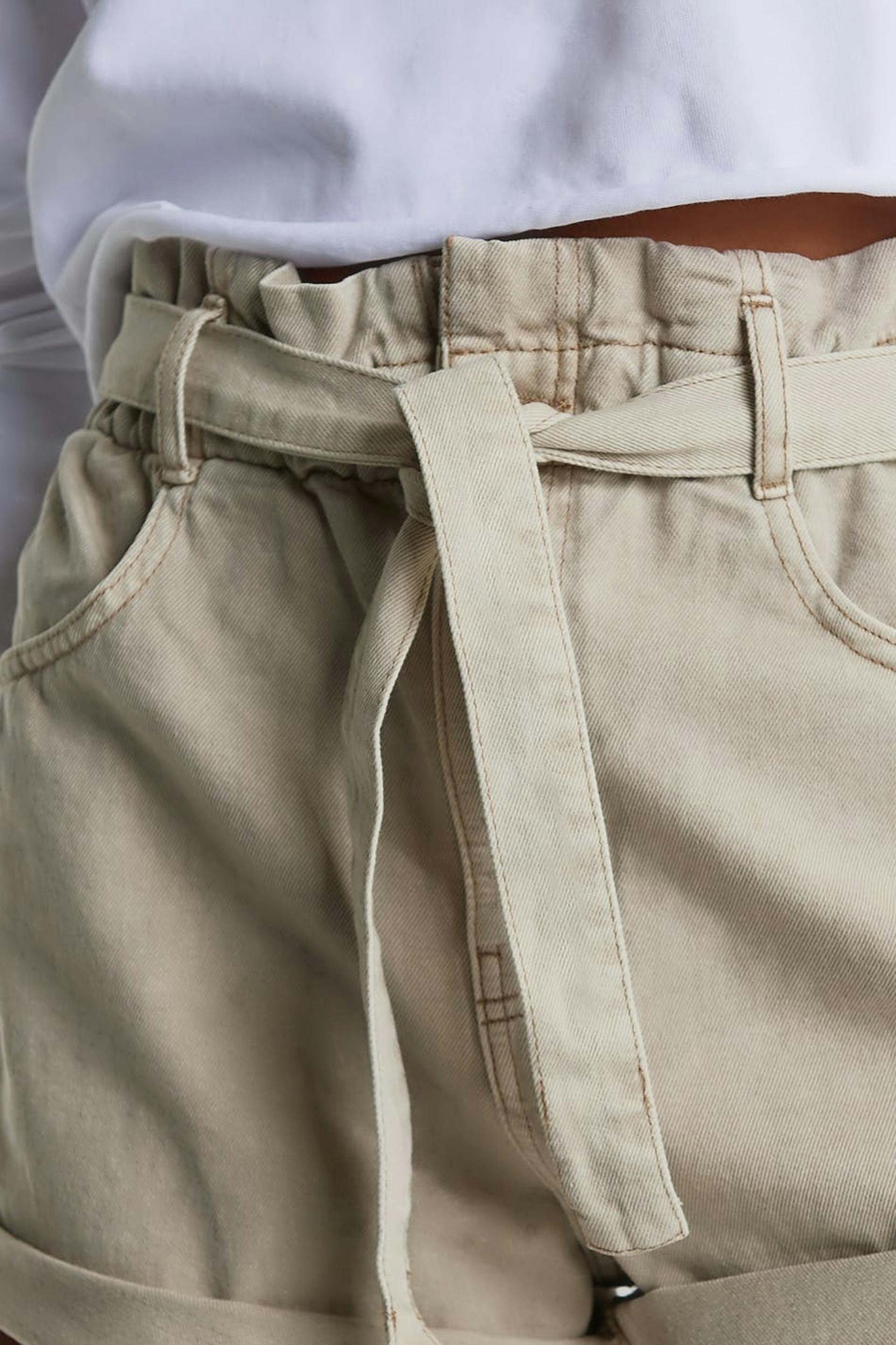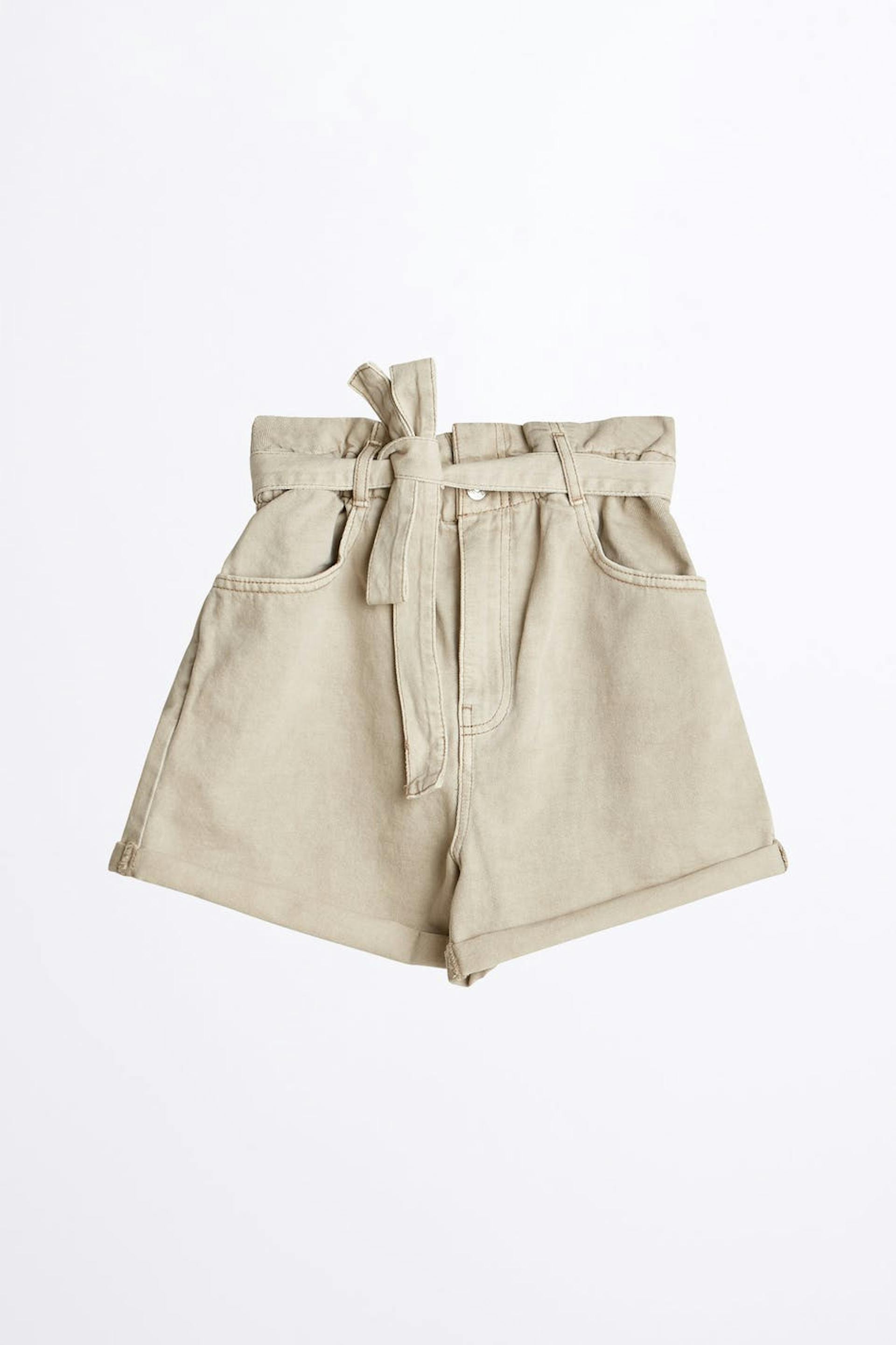 Korte jeansshort met een normale pasvorm. De short is beige en rekvrij en heeft een hoog en paperbag taille van elastiek met een riem stropdas.