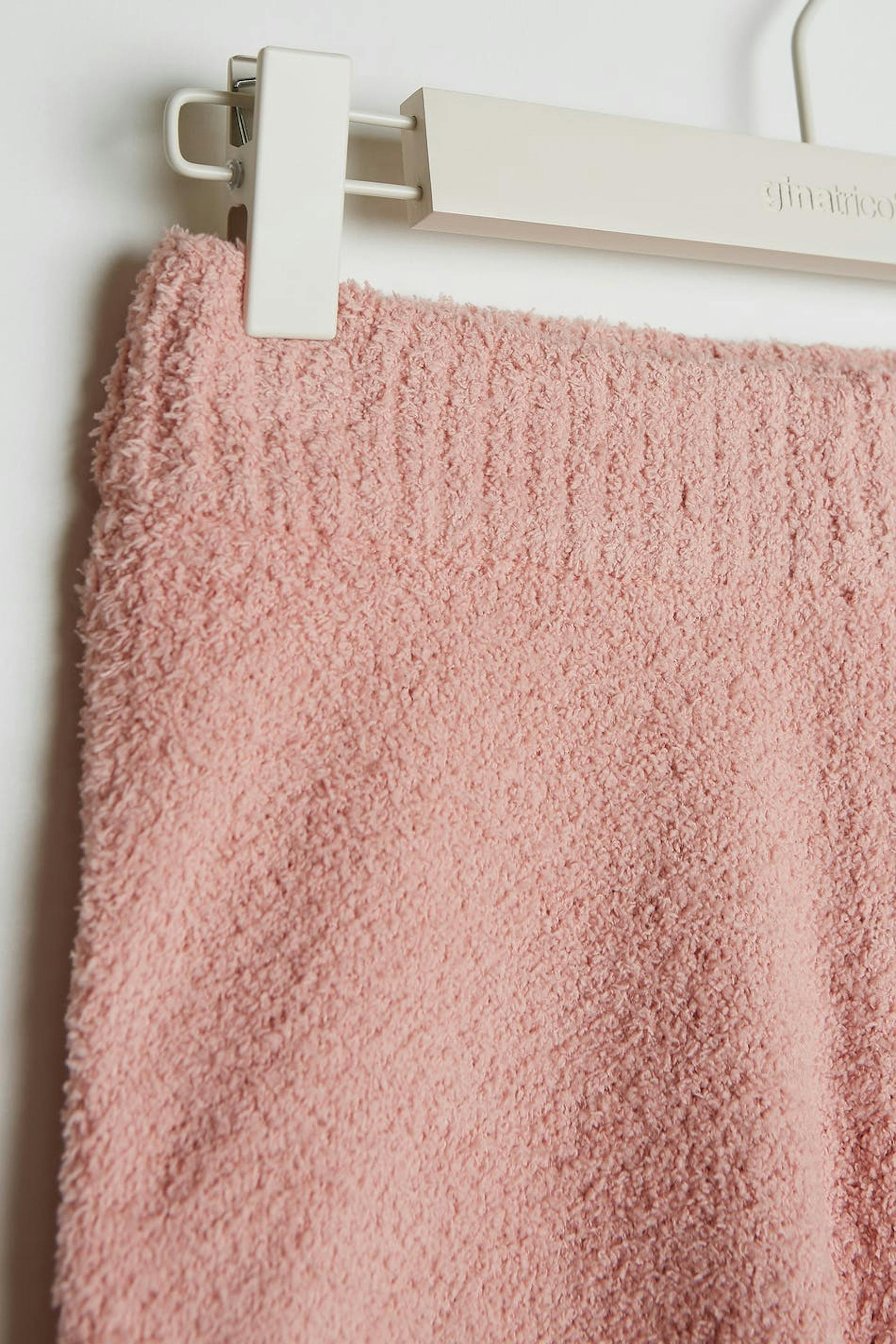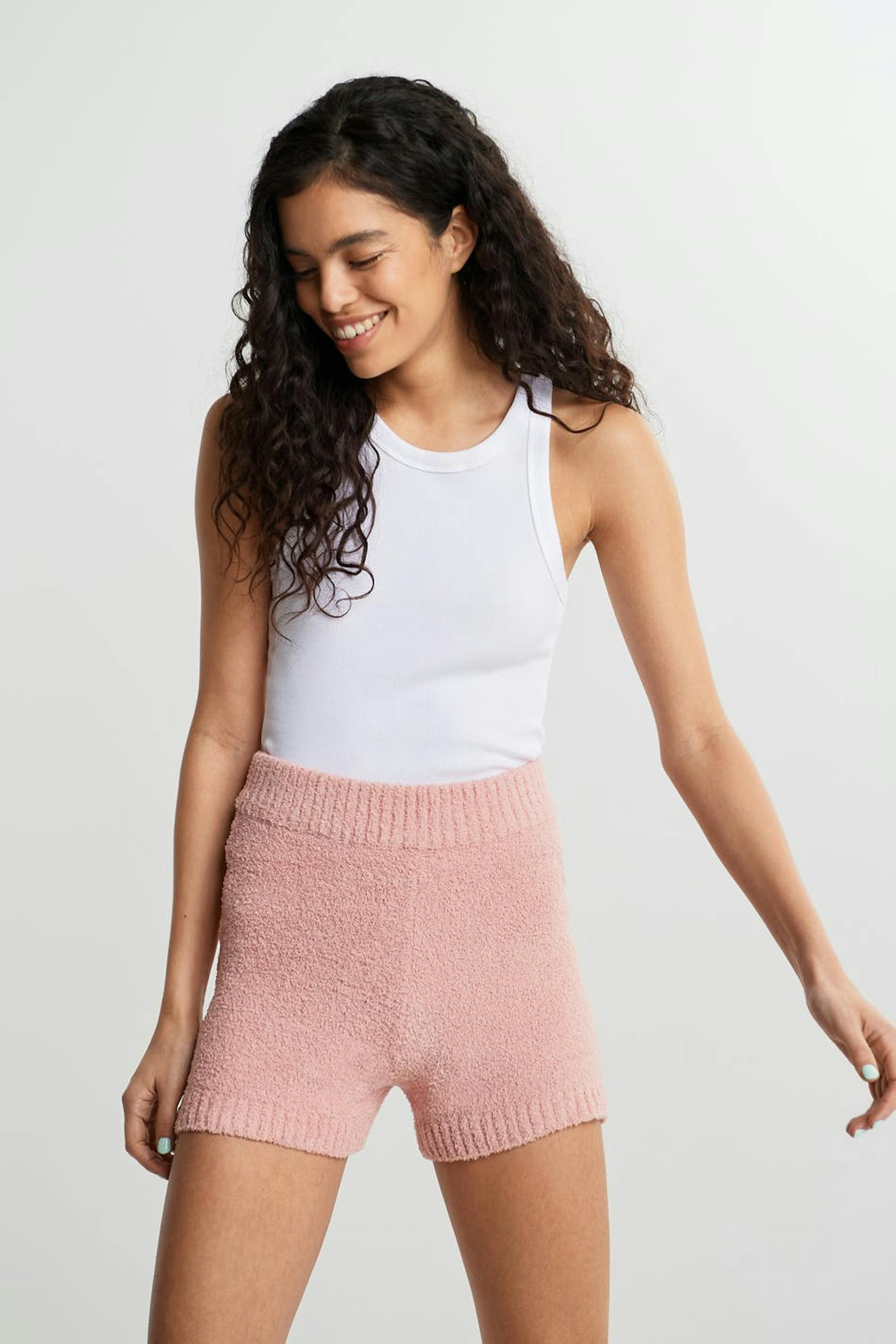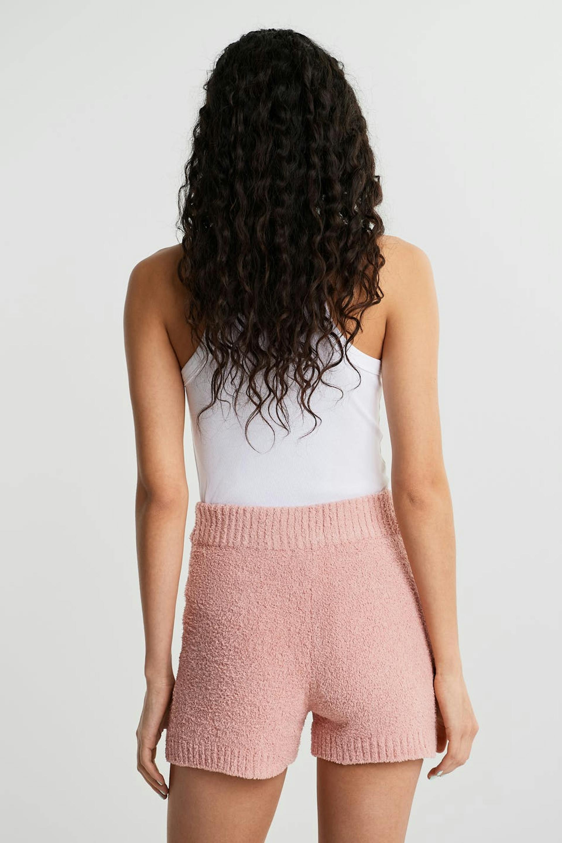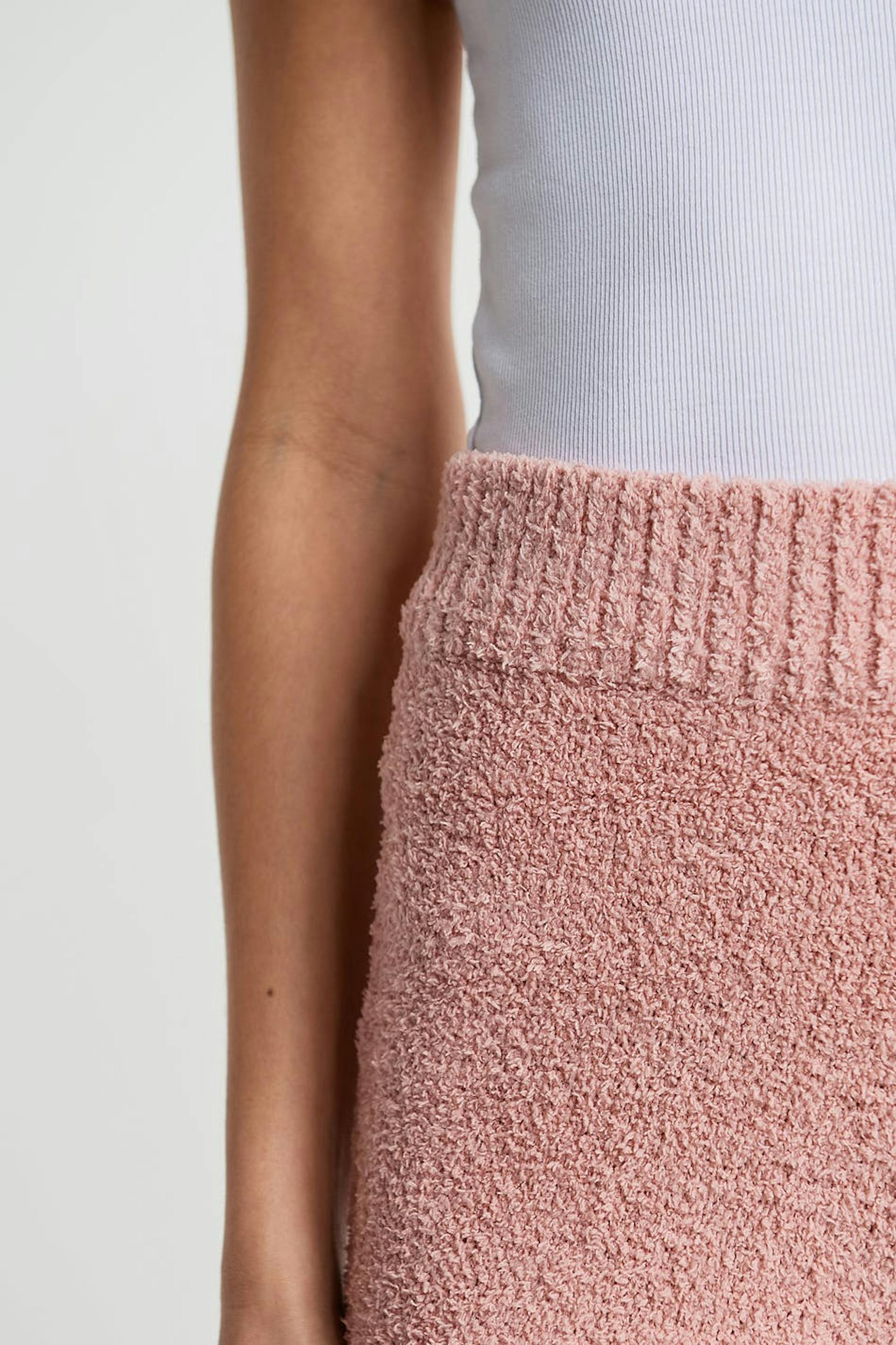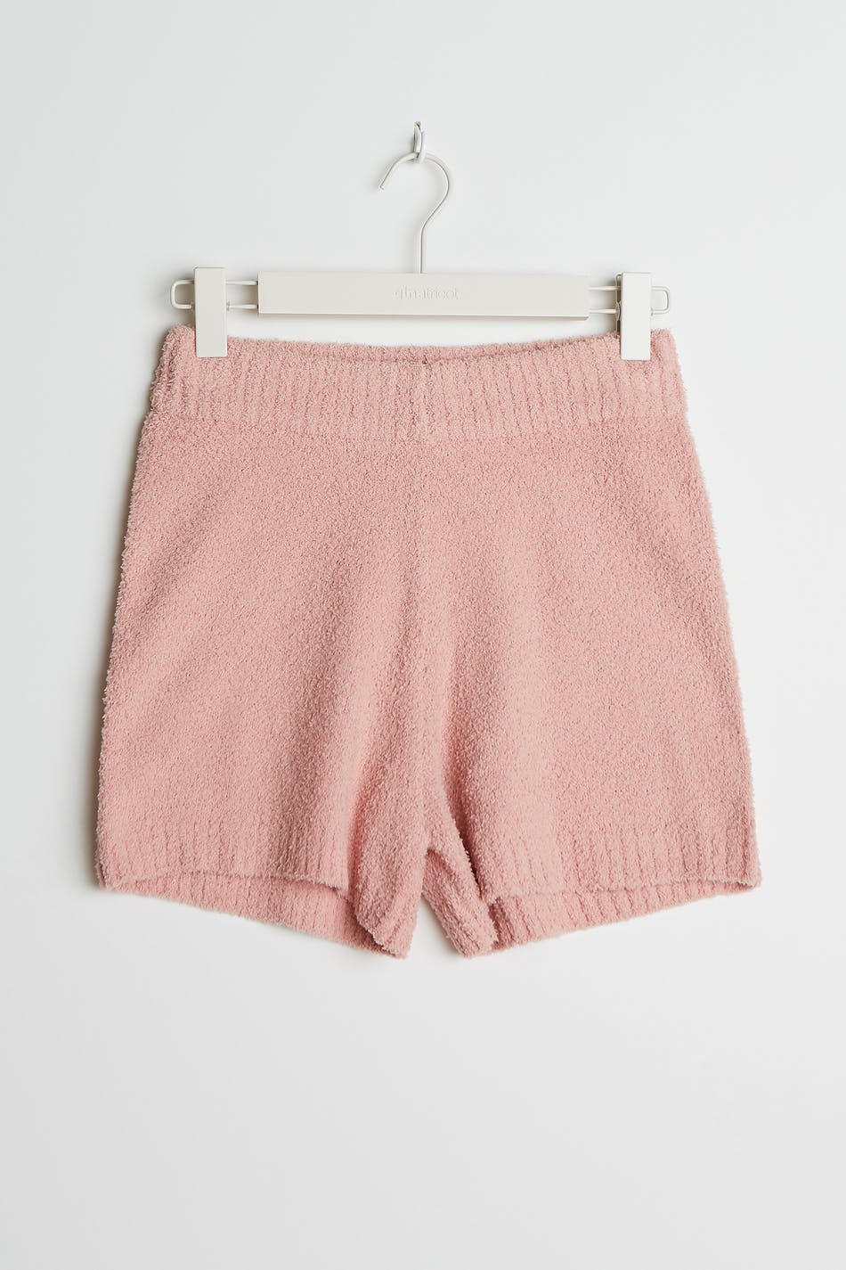 Gebreide short met een geribbelde manchet aan de pijpopening. De short is roze en aangenaam en heeft een elastiek aan de taille.