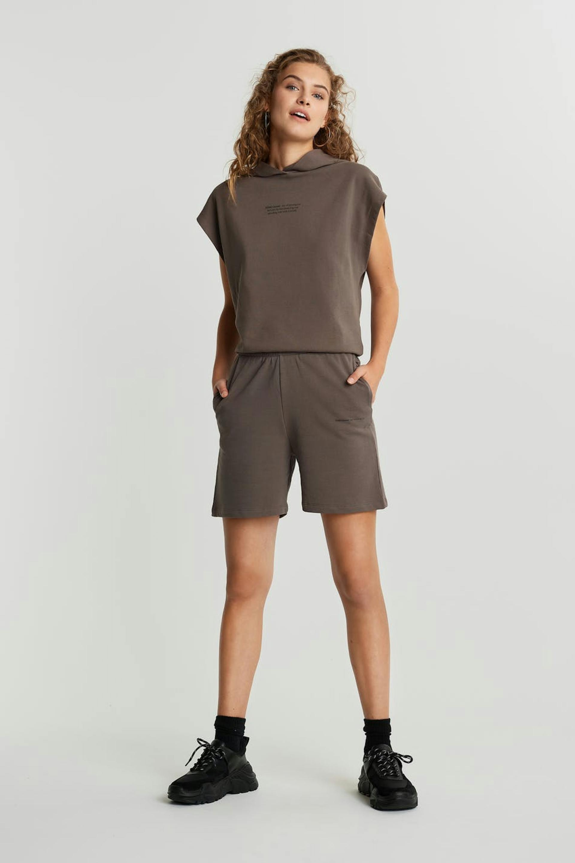 Lange short met een normale pasvorm. De short is bruin en heeft een hoge taille van elastiek. Het is gemaakt uit sweatshirt stof uit katoen.