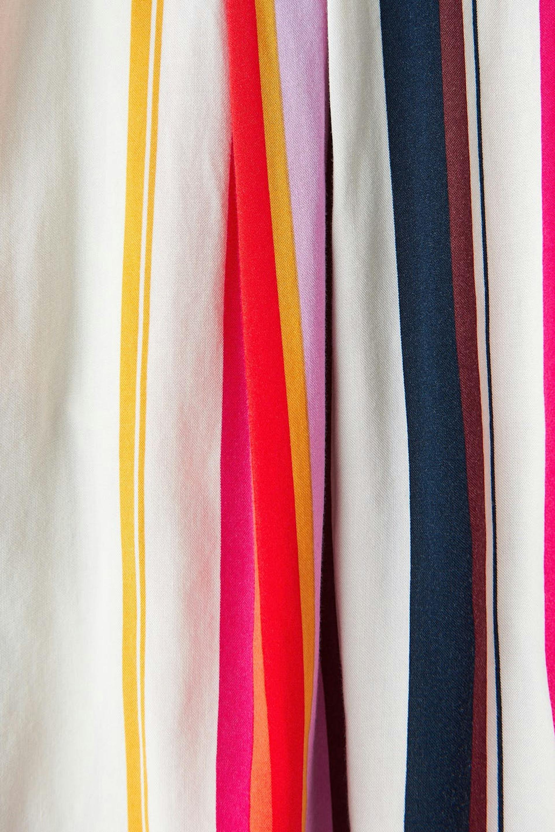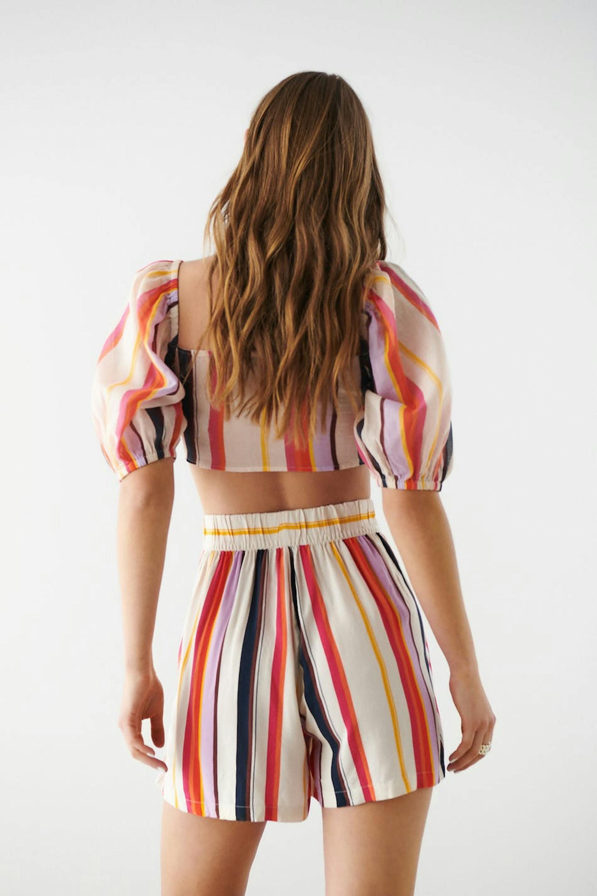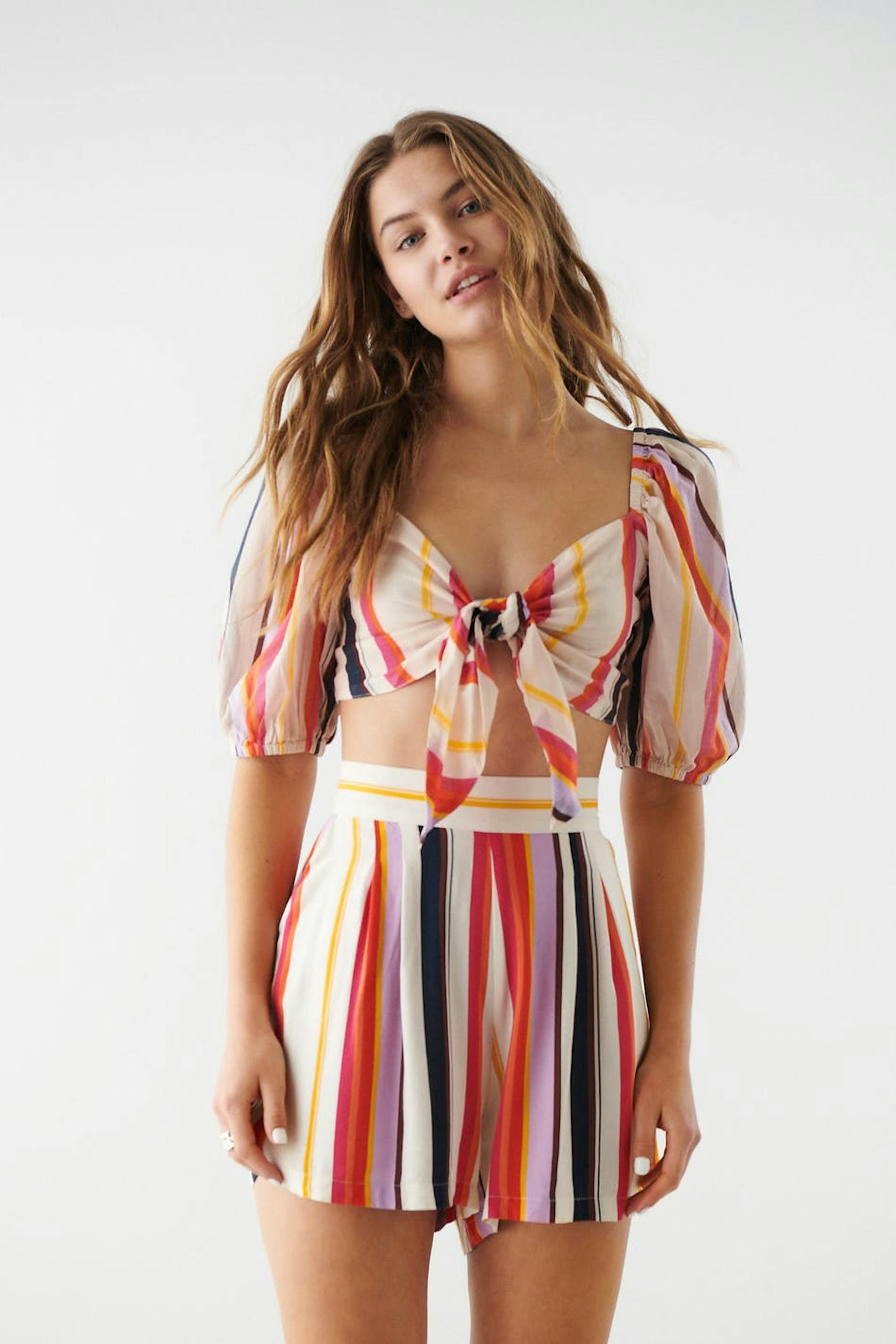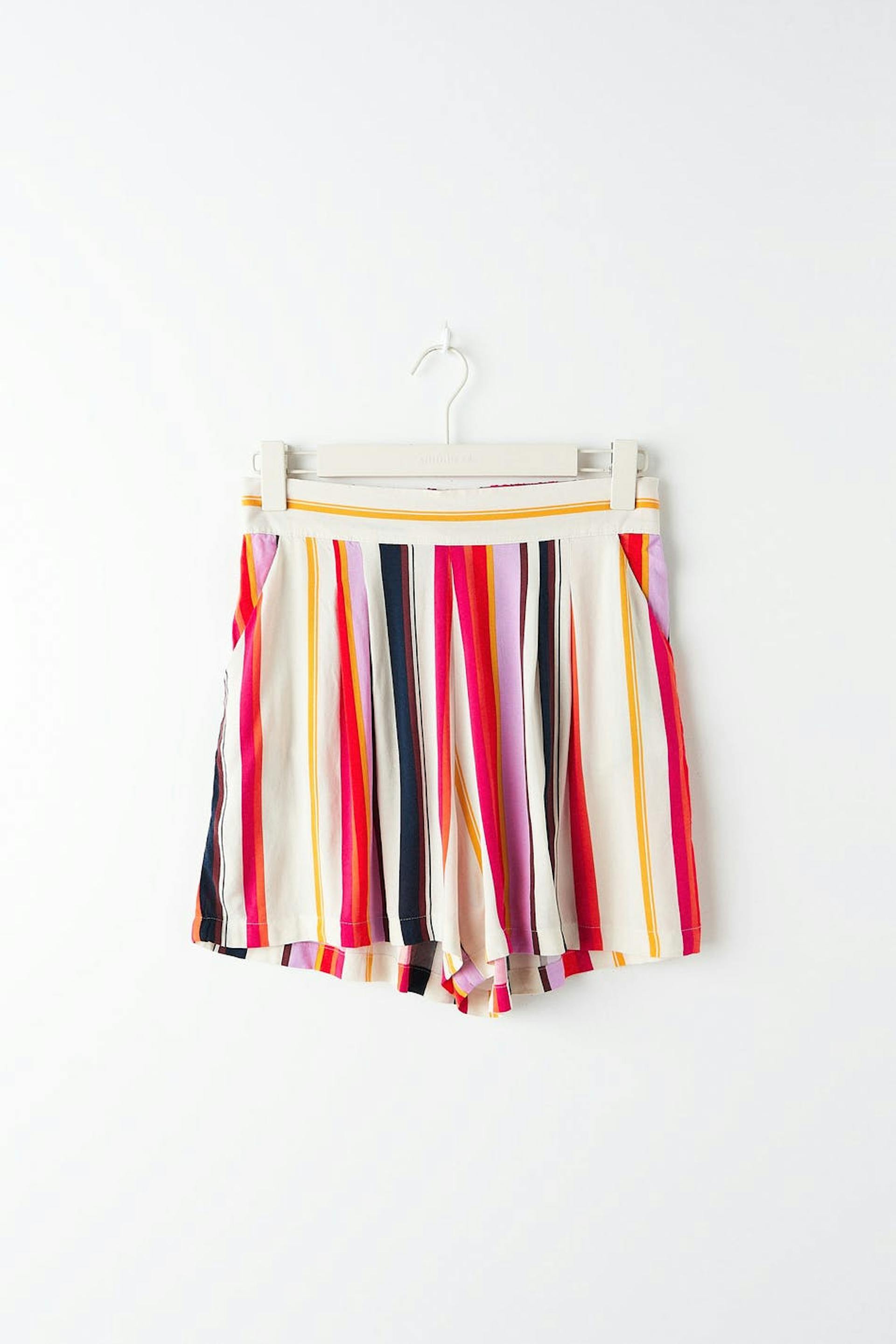 Gestreepte short met plooien aan de voorkant. De short is rood, kort en breed. Het heeft zijzakken en een taille met een elastische band achter.