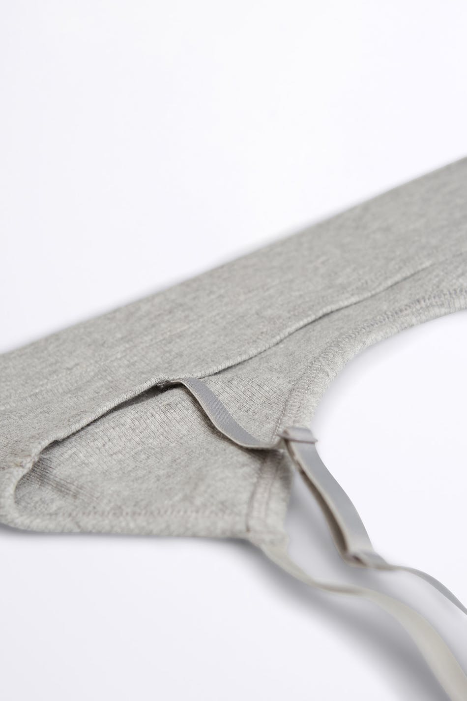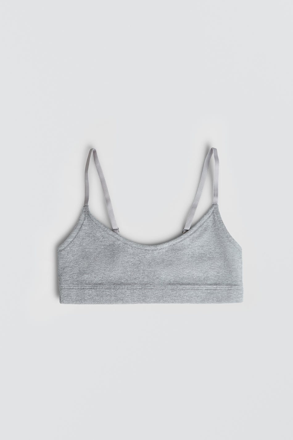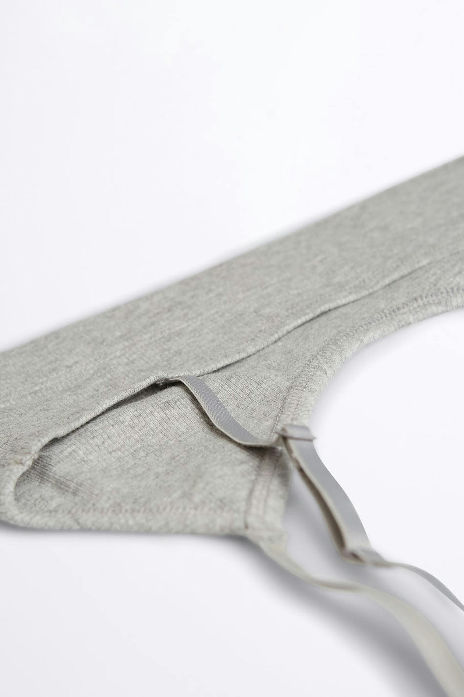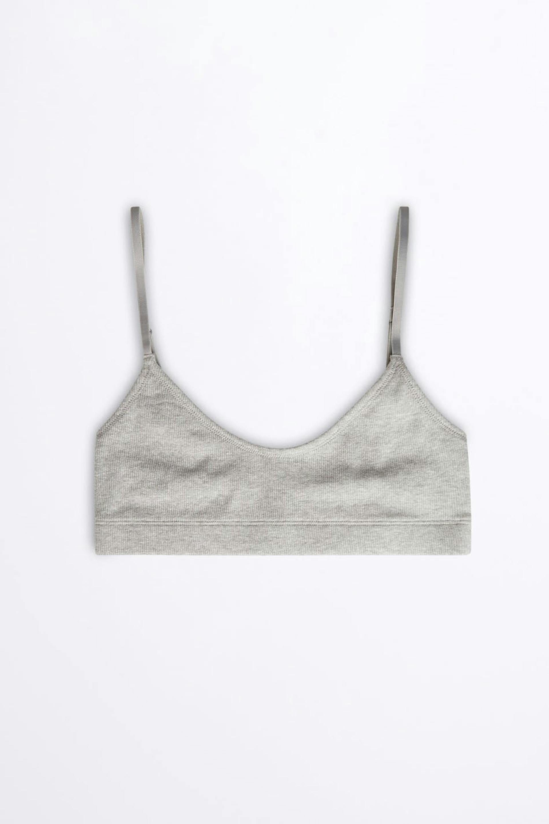 Zachte bh. De bh is grijs en geribbeld. Het is gemaakt uit katoen.