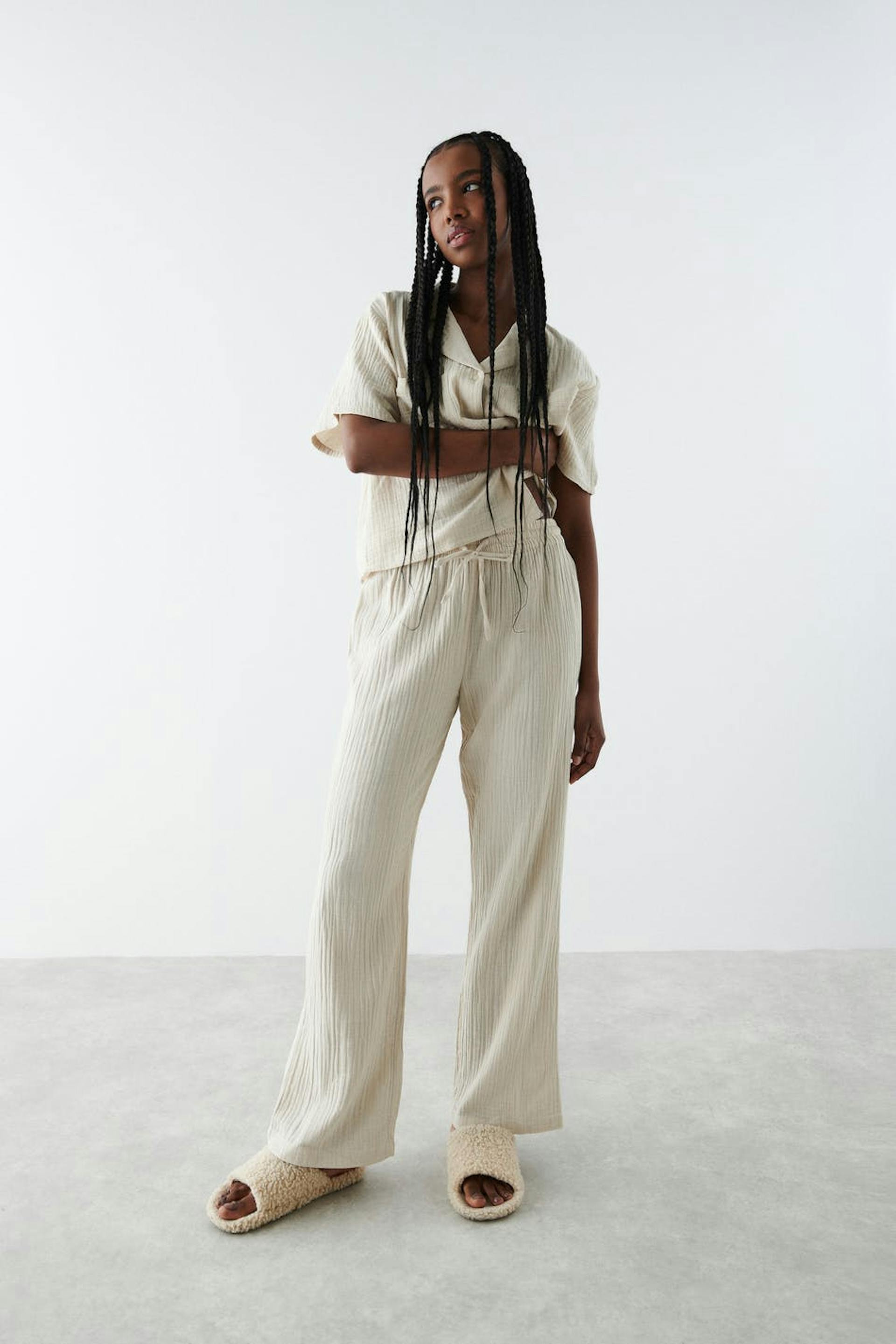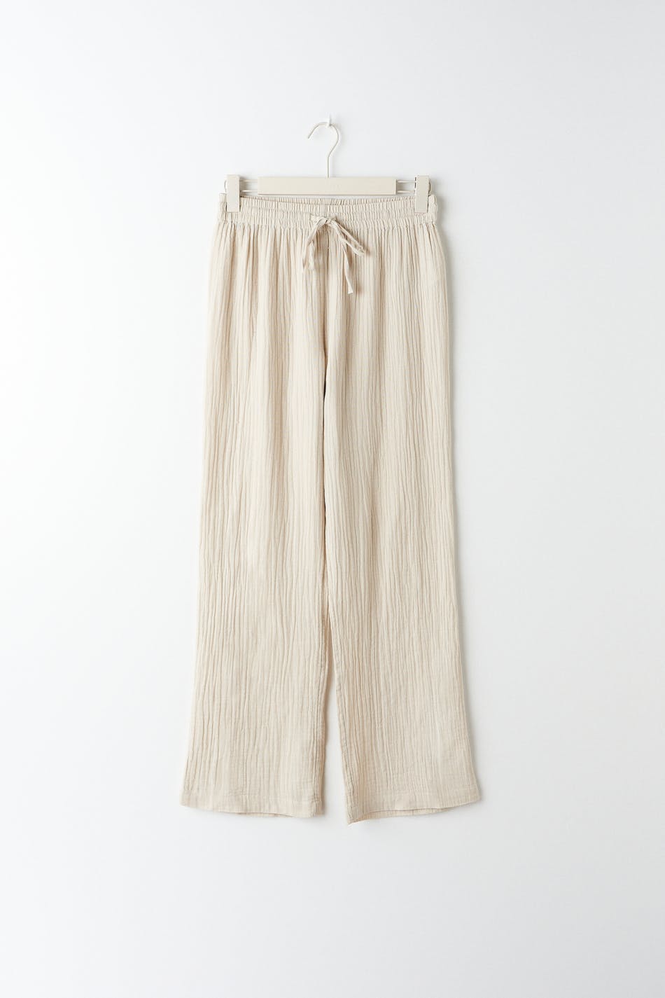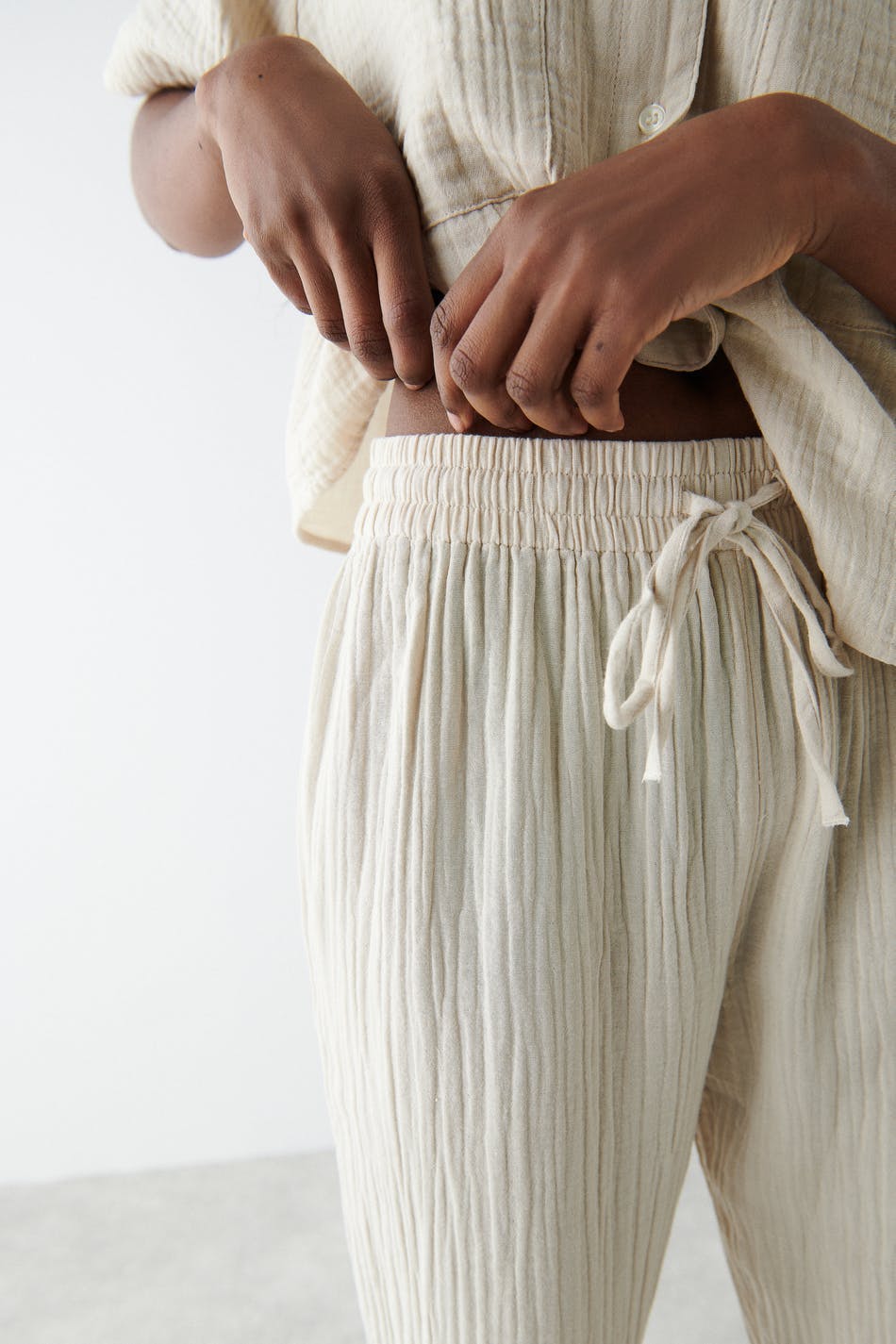 Piyjama trainingsbroeken in katoen met rechte pijpen. De piyjama trainingsbroeken zijn beige en hebben een zachte elastiek aan de taille met dasriem aan de voorzijde.
