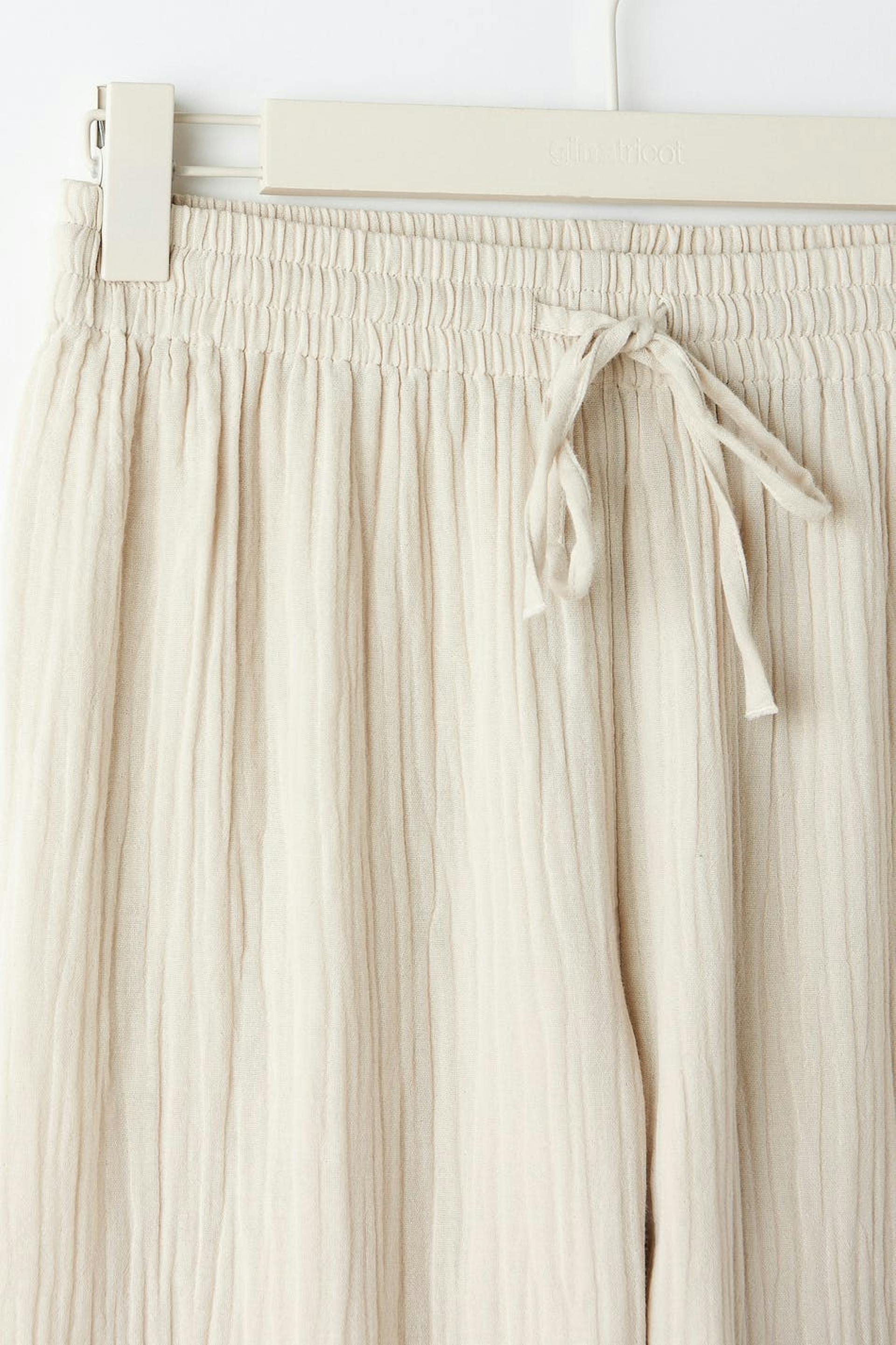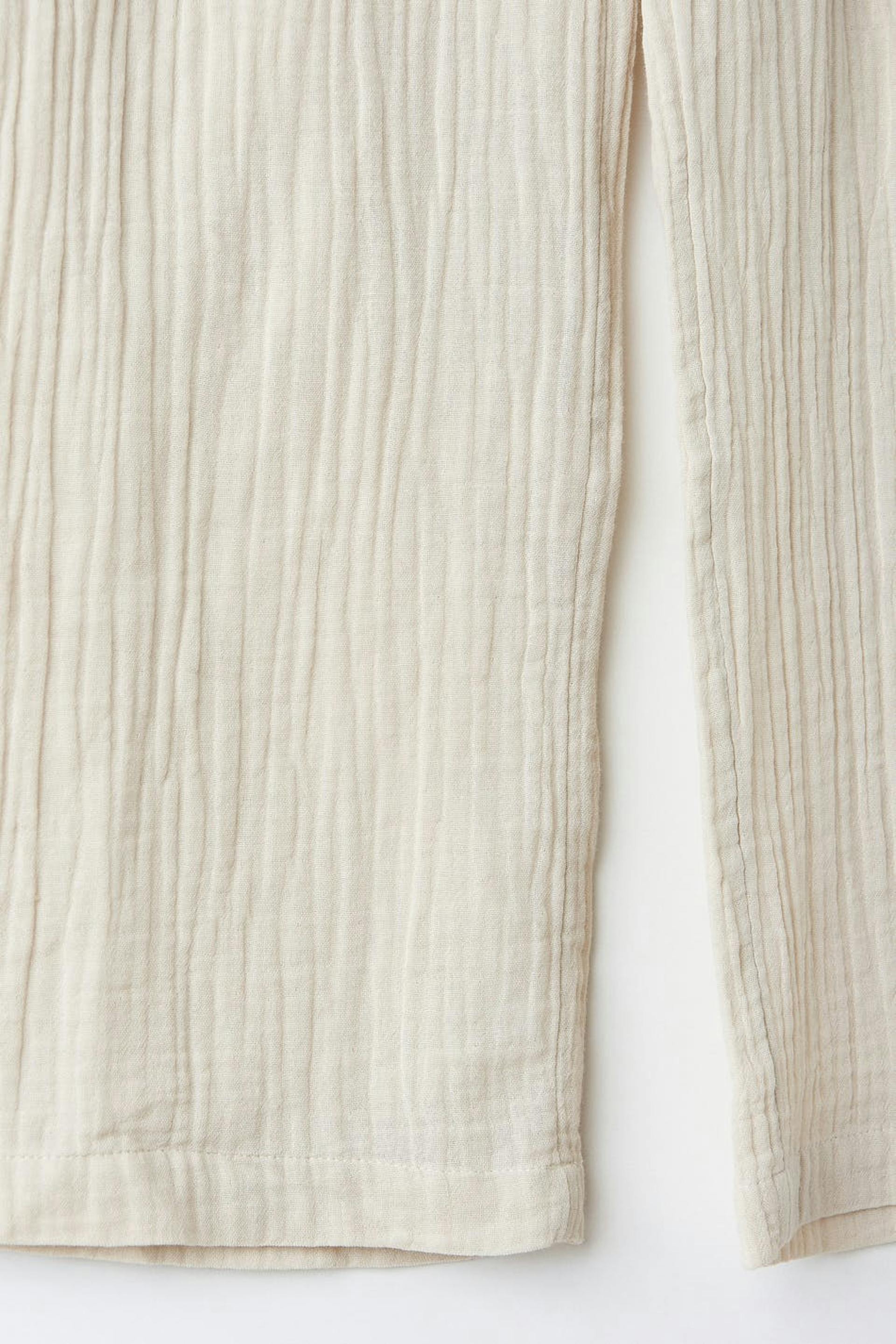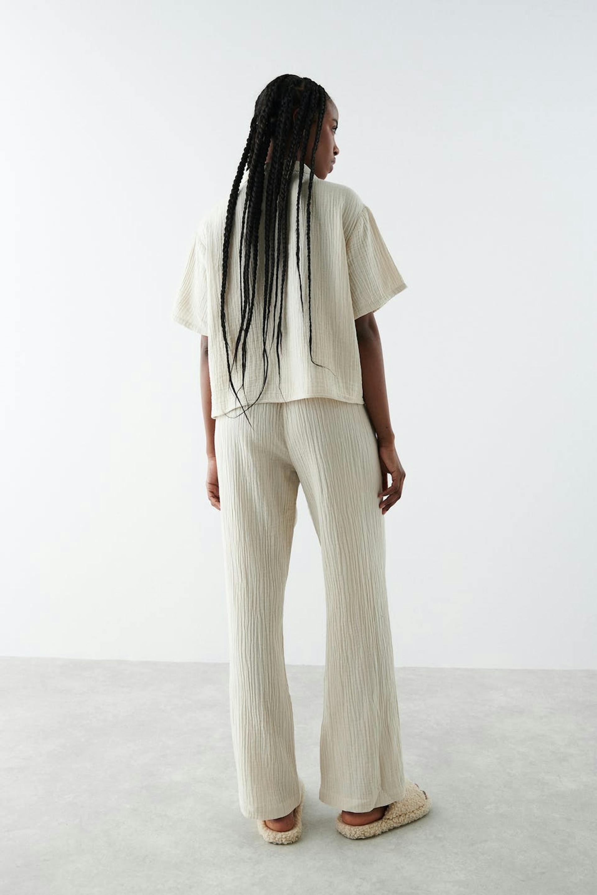 Piyjama trainingsbroeken in katoen met rechte pijpen. De piyjama trainingsbroeken zijn beige en hebben een zachte elastiek aan de taille met dasriem aan de voorzijde.