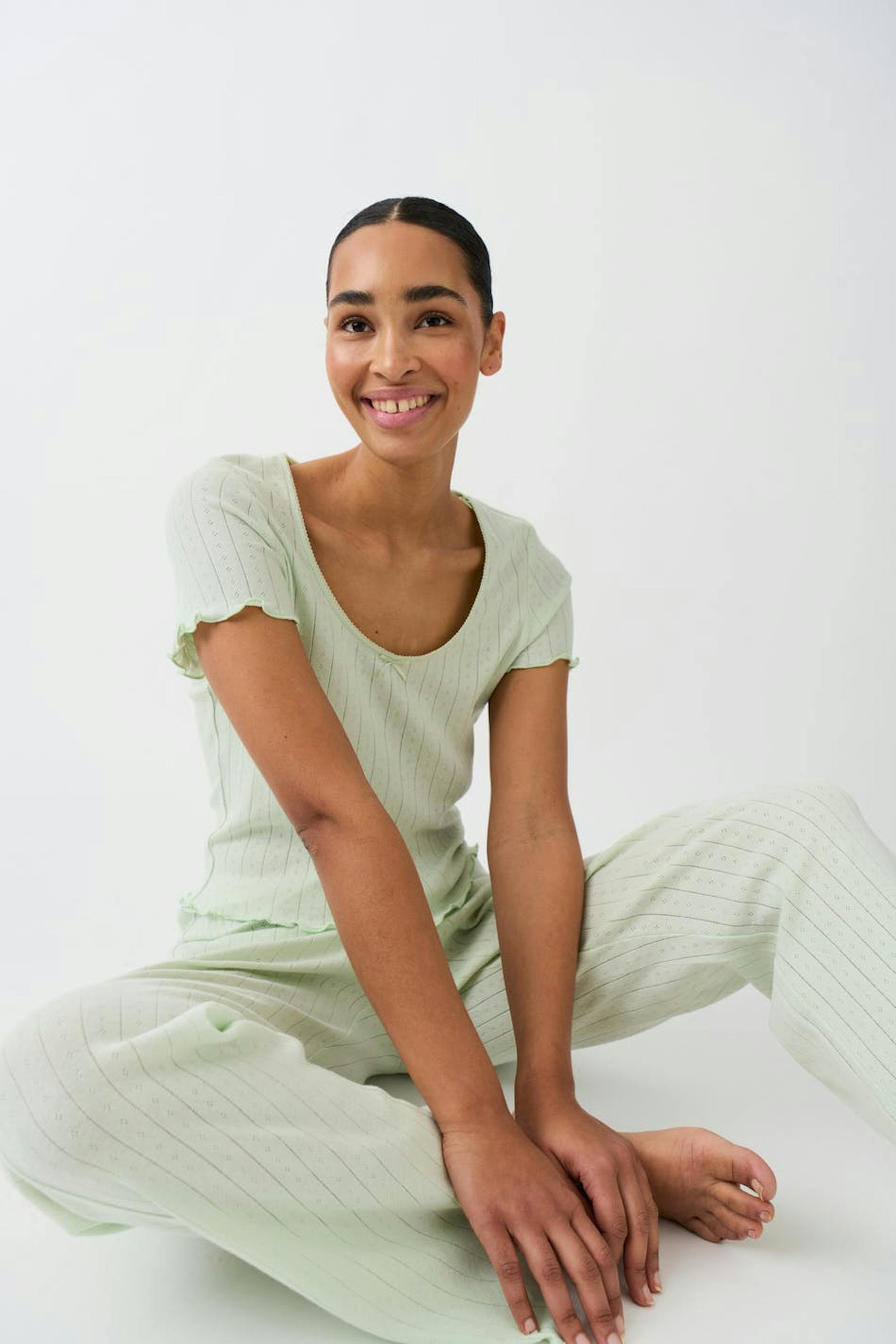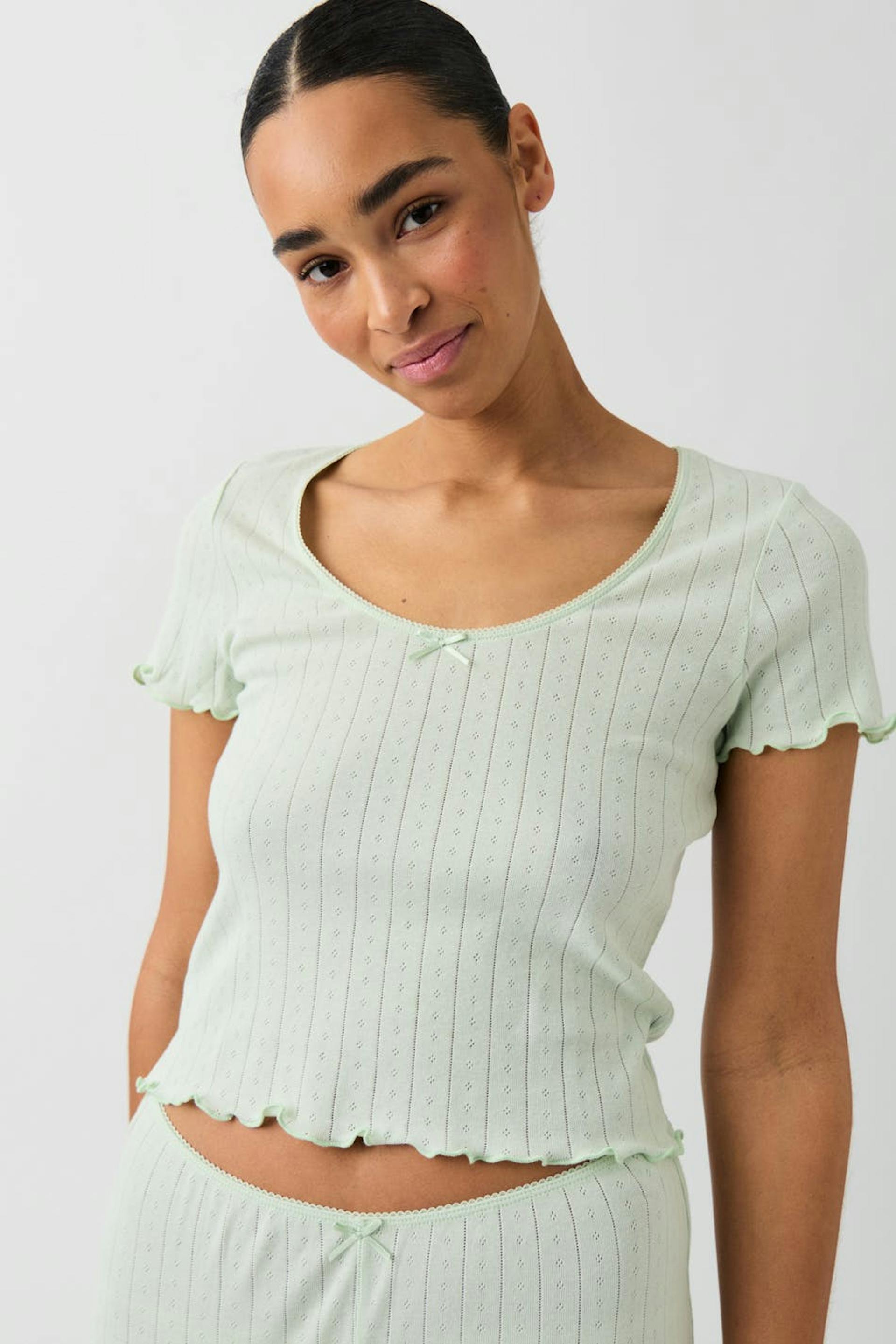 T-shirt met een dun en zacht materiaal. Het t-shirt is groen en heeft een krulling op de mouwen en aan de onderkant. Het heeft een halslijn met een lint in het midden.