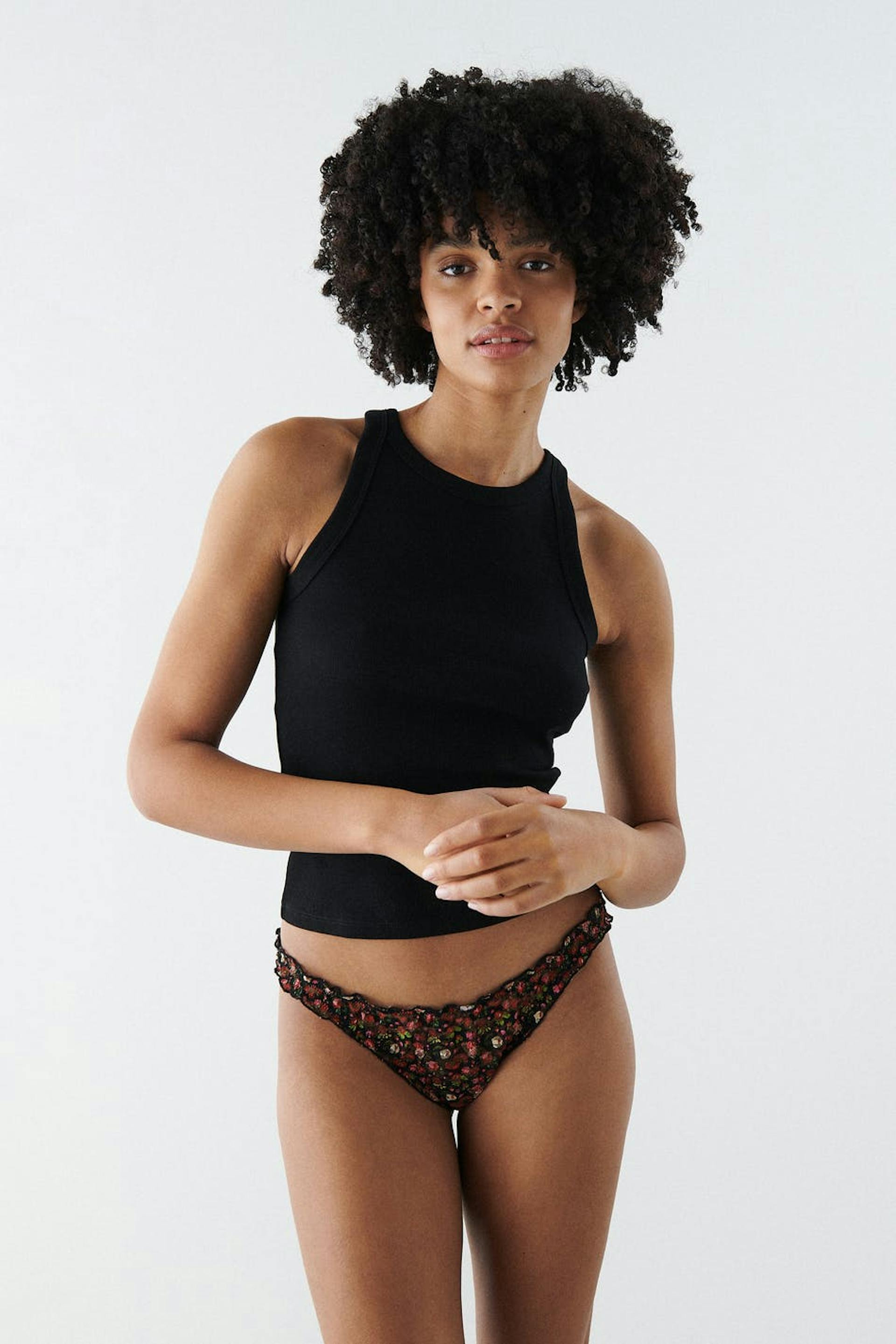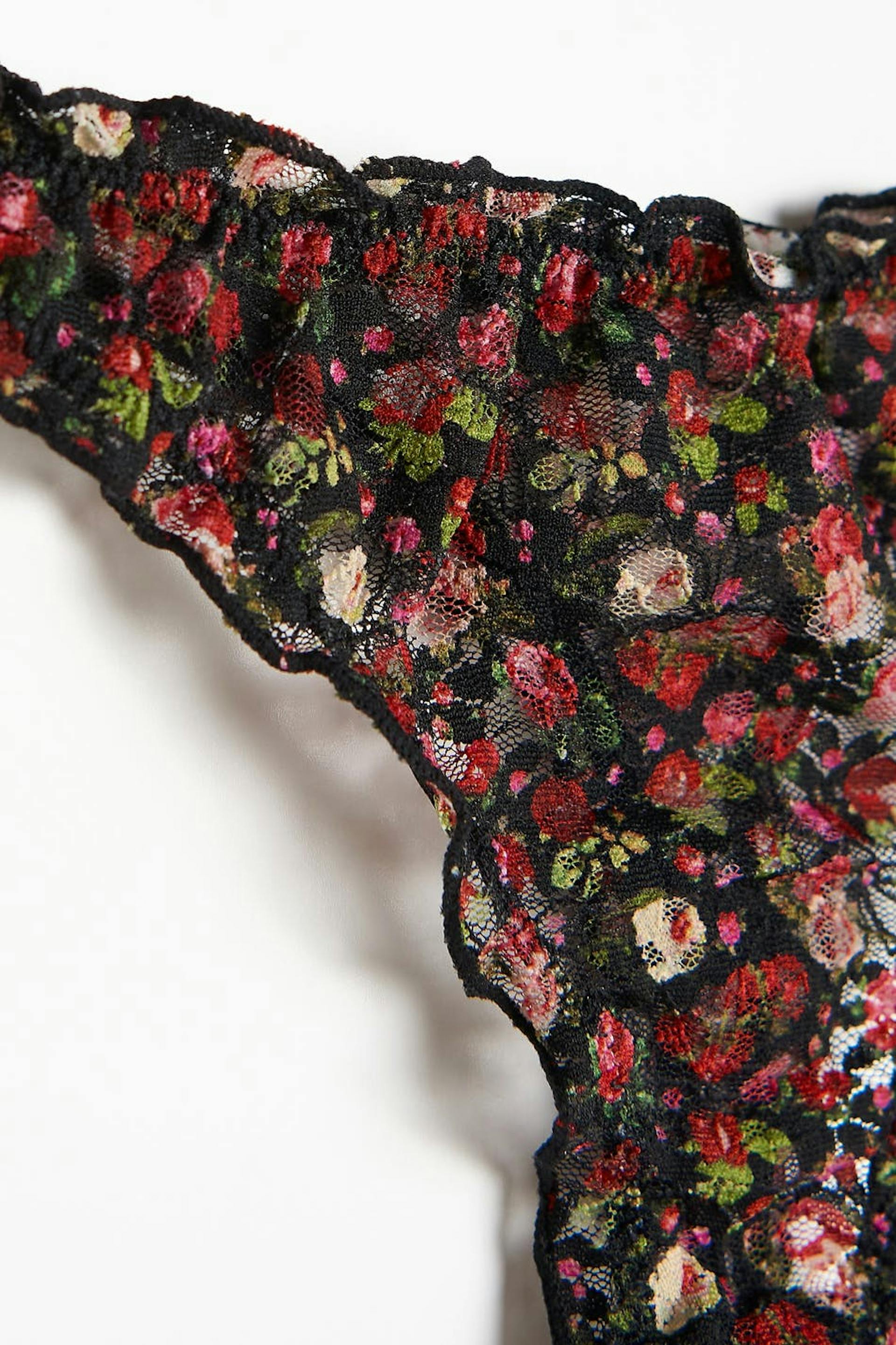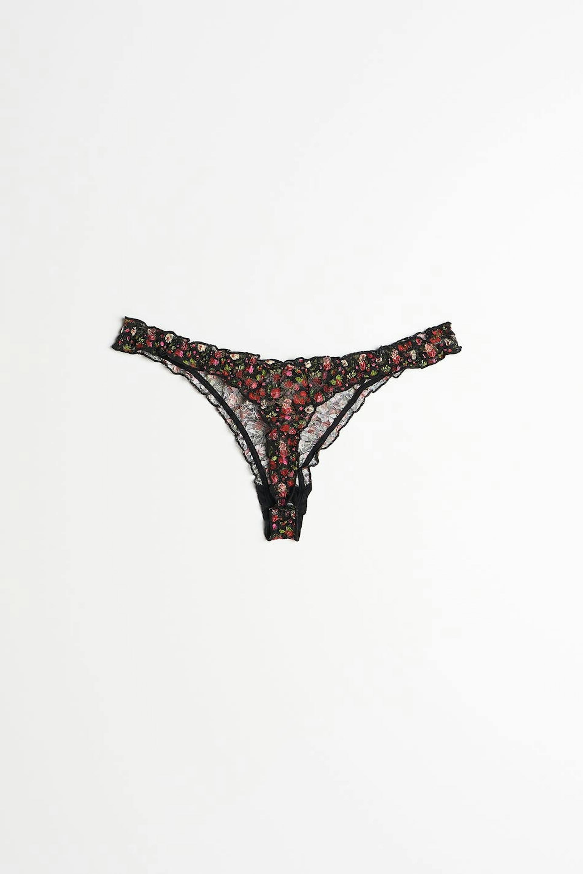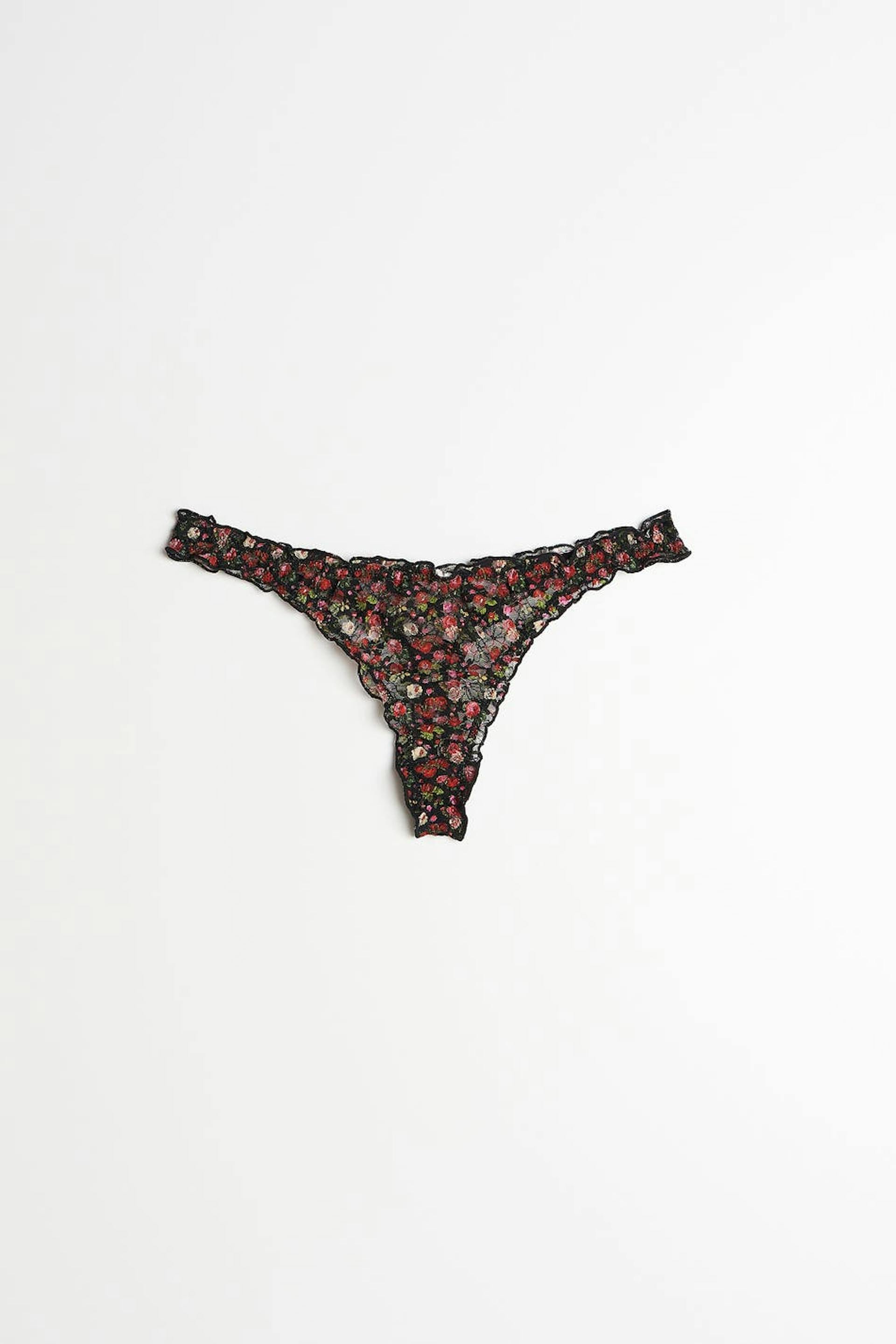 String met ruches. De string is zwart en patroonvormig en heeft een voering van katoen tussen de benen. Het is gemaakt van kant.