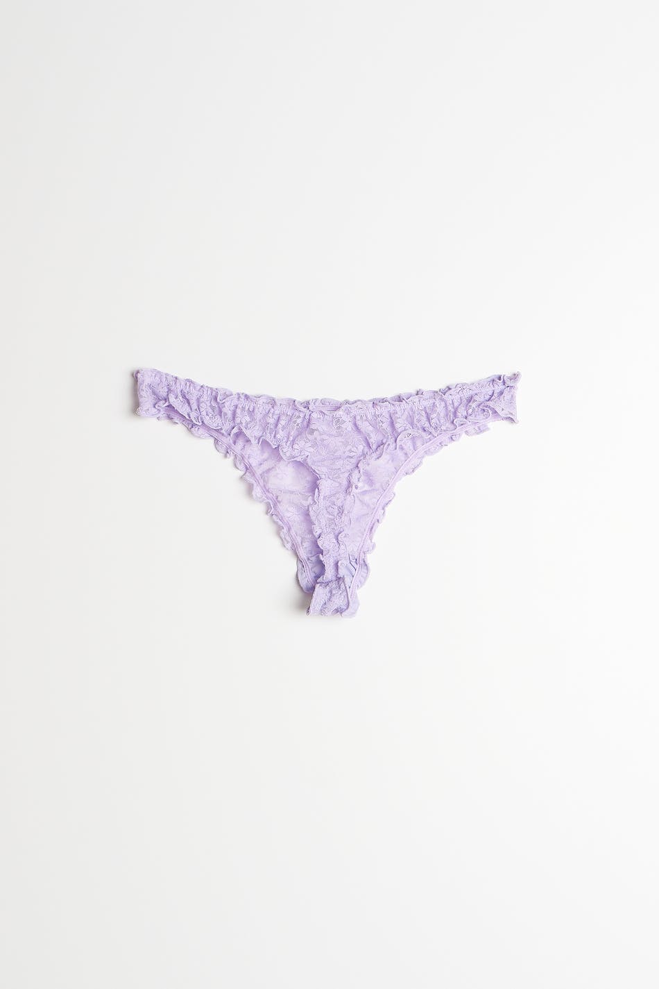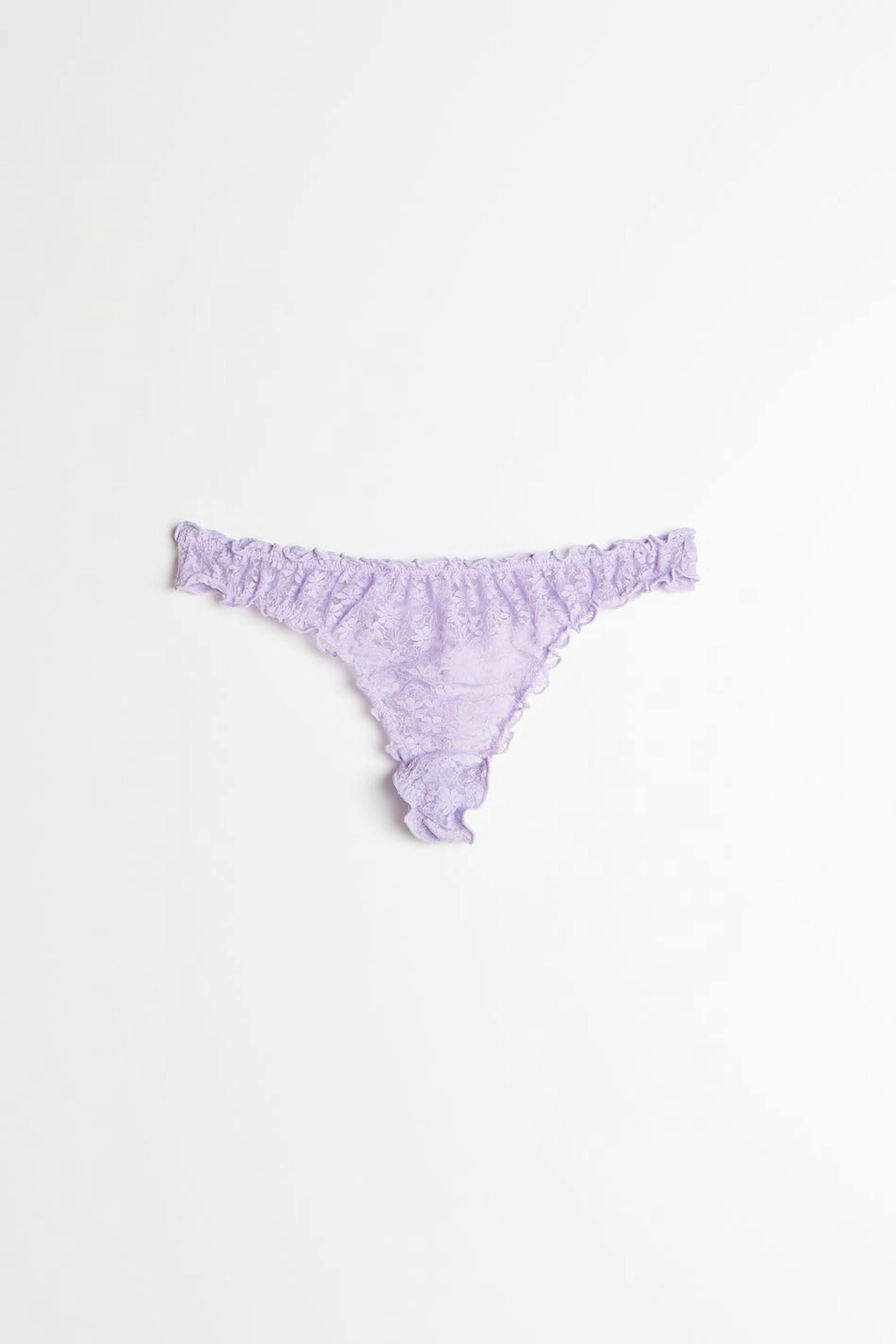 Strings met ruches. De strings zijn licht paars en hebben een voering van katoen tussen de benen. Het is gemaakt van kant.