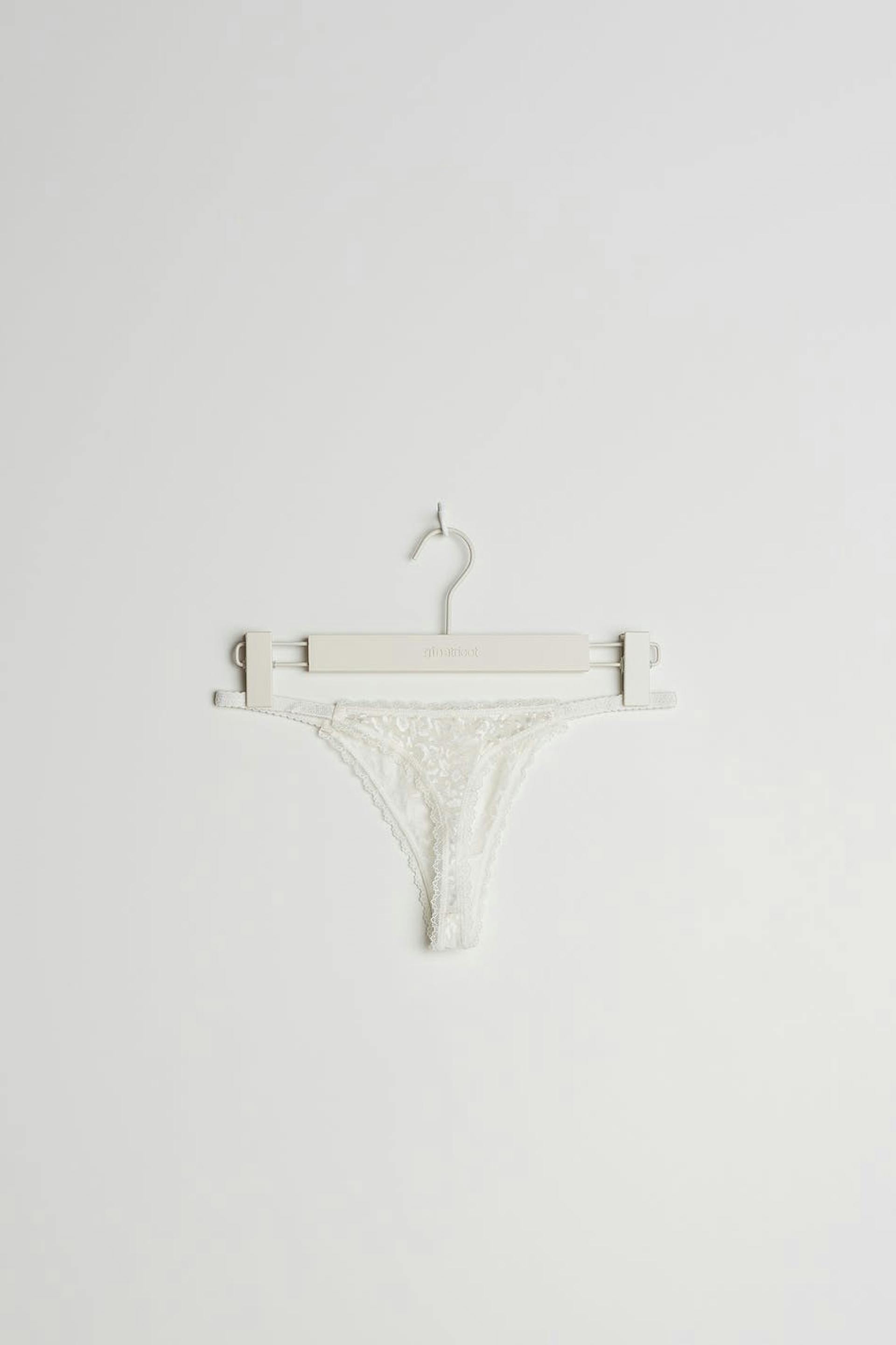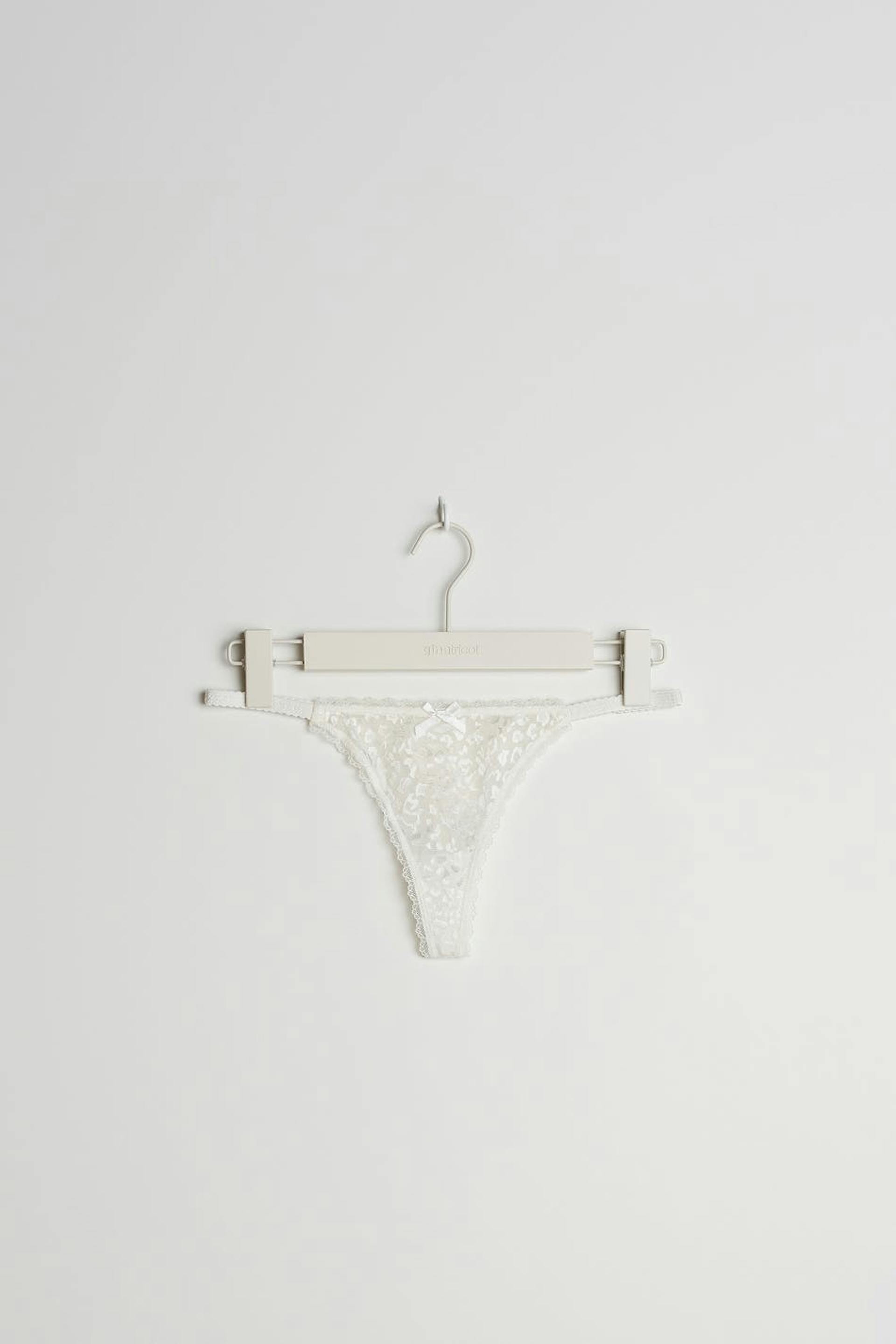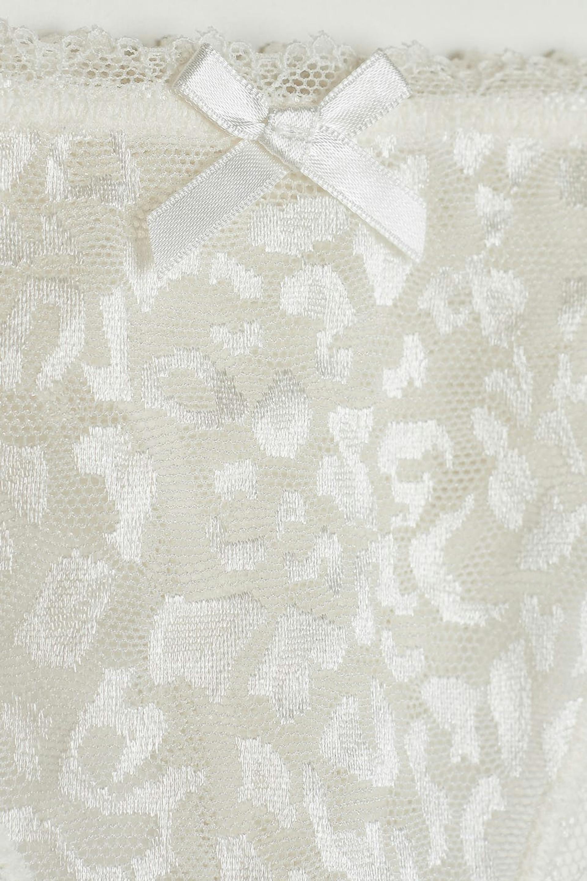 Panty's met een stringontwerp. De panty's zijn wit en hebben een voering tussen de benen. Het is gemaakt uit kant en heeft een decoratieve strik.