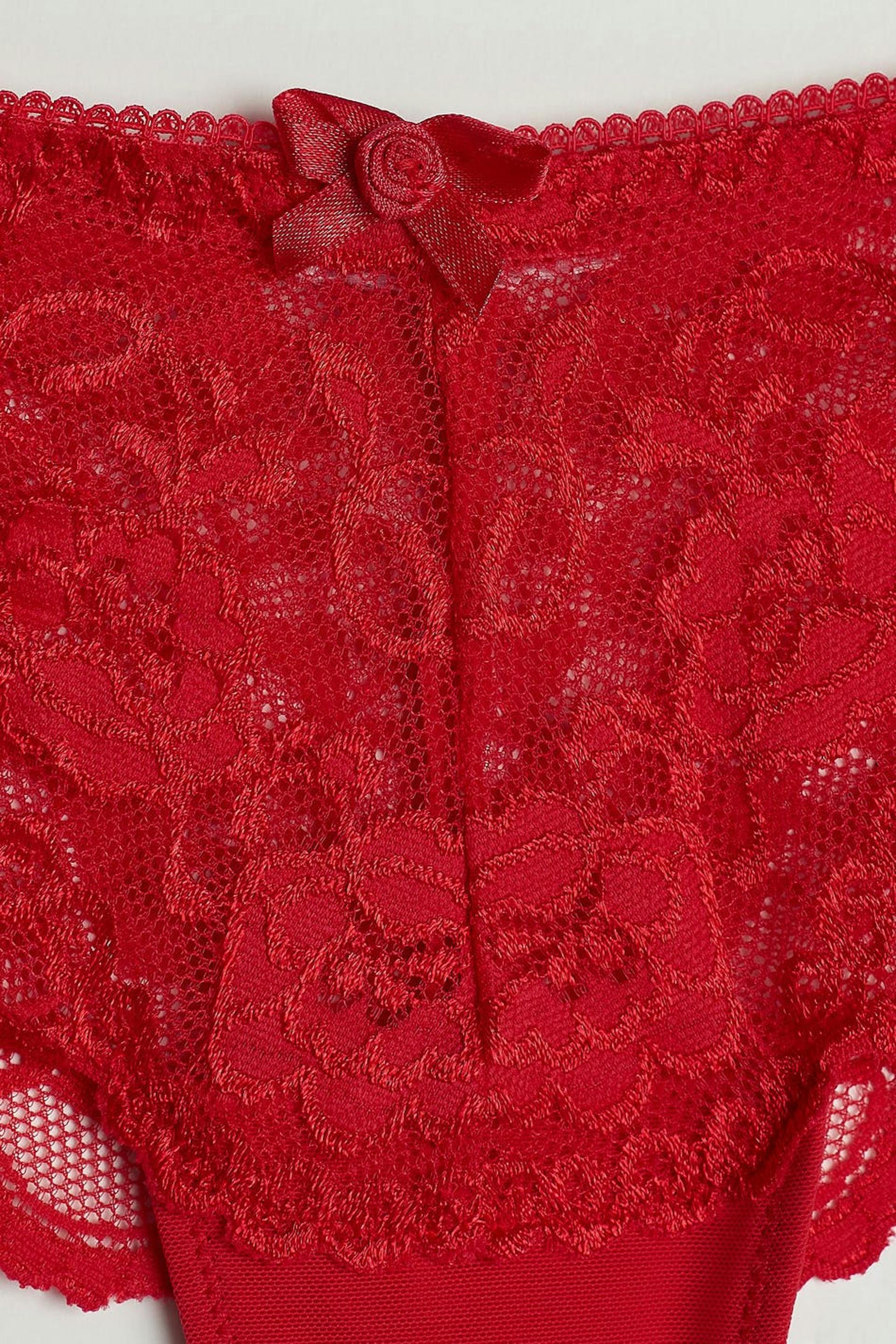 Strings met een voering van katoen aan het kruis. De strings zijn rood. Het is gemaakt van kant.