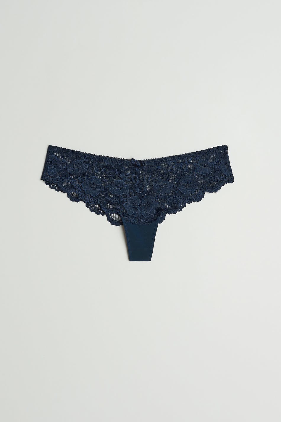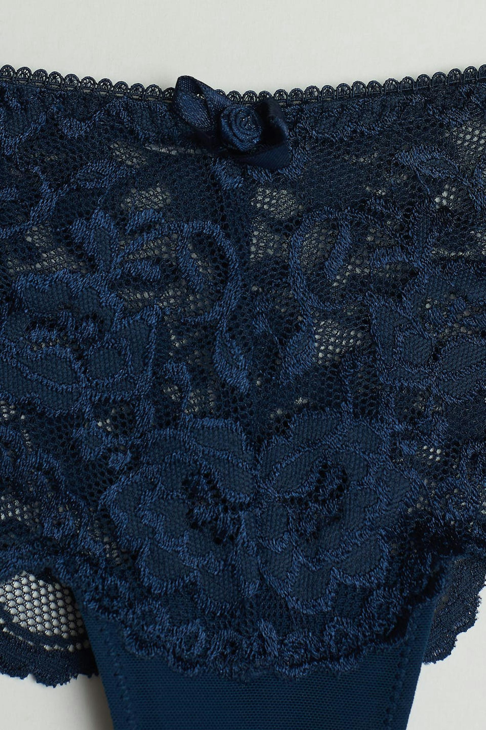 Panty's met een voering van katoen aan het kruis. De panty's zijn blauw. Het is gemaakt van kant.