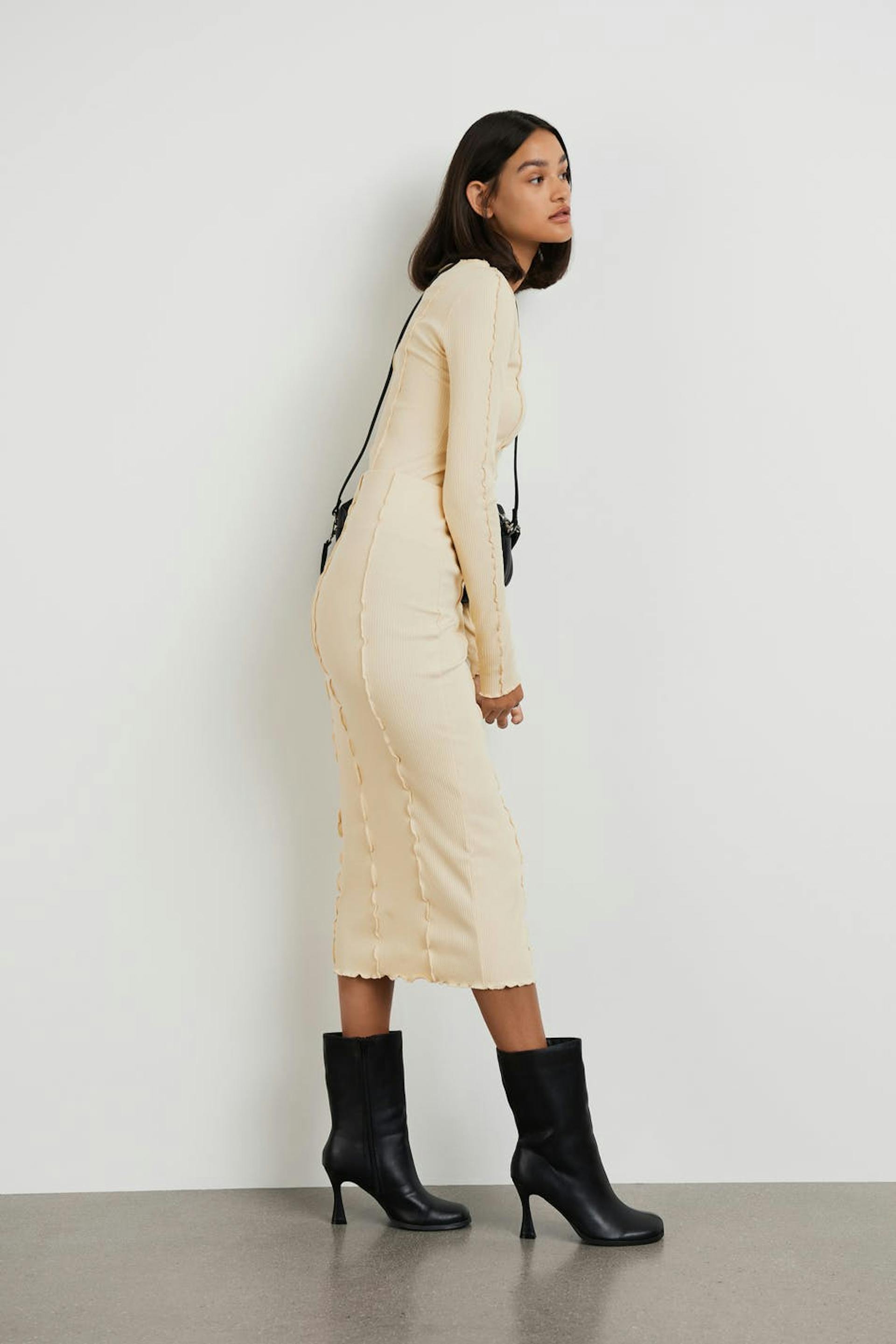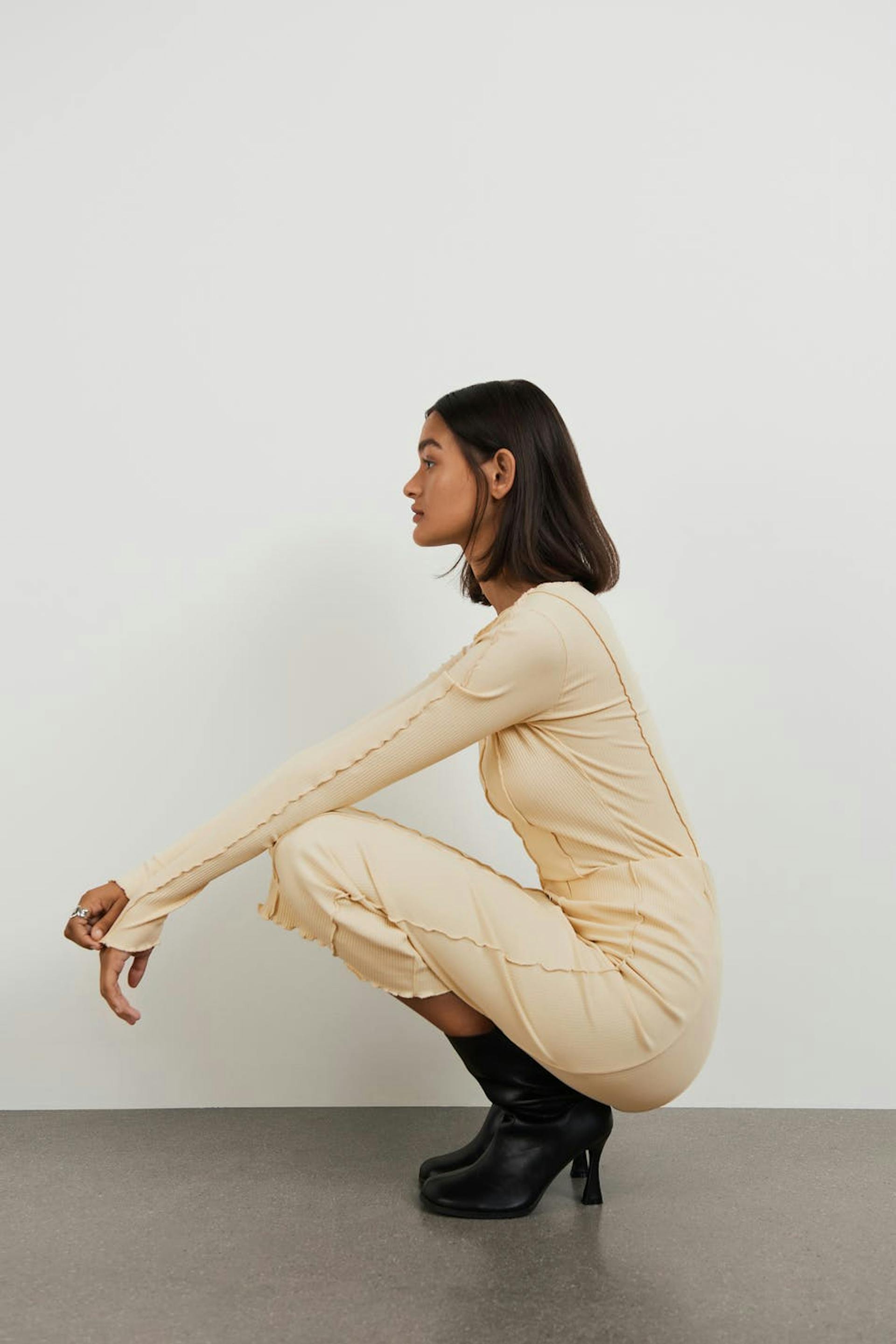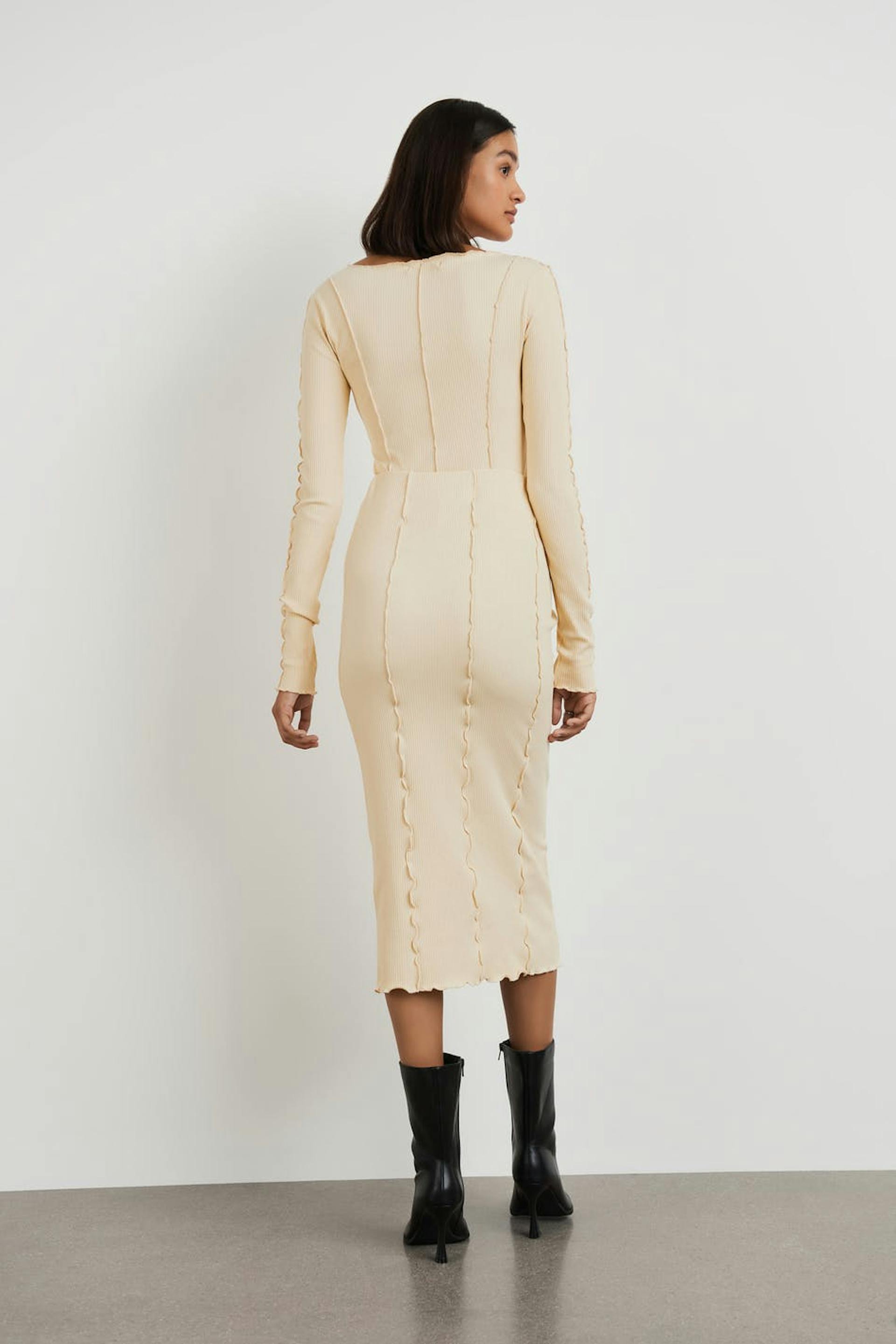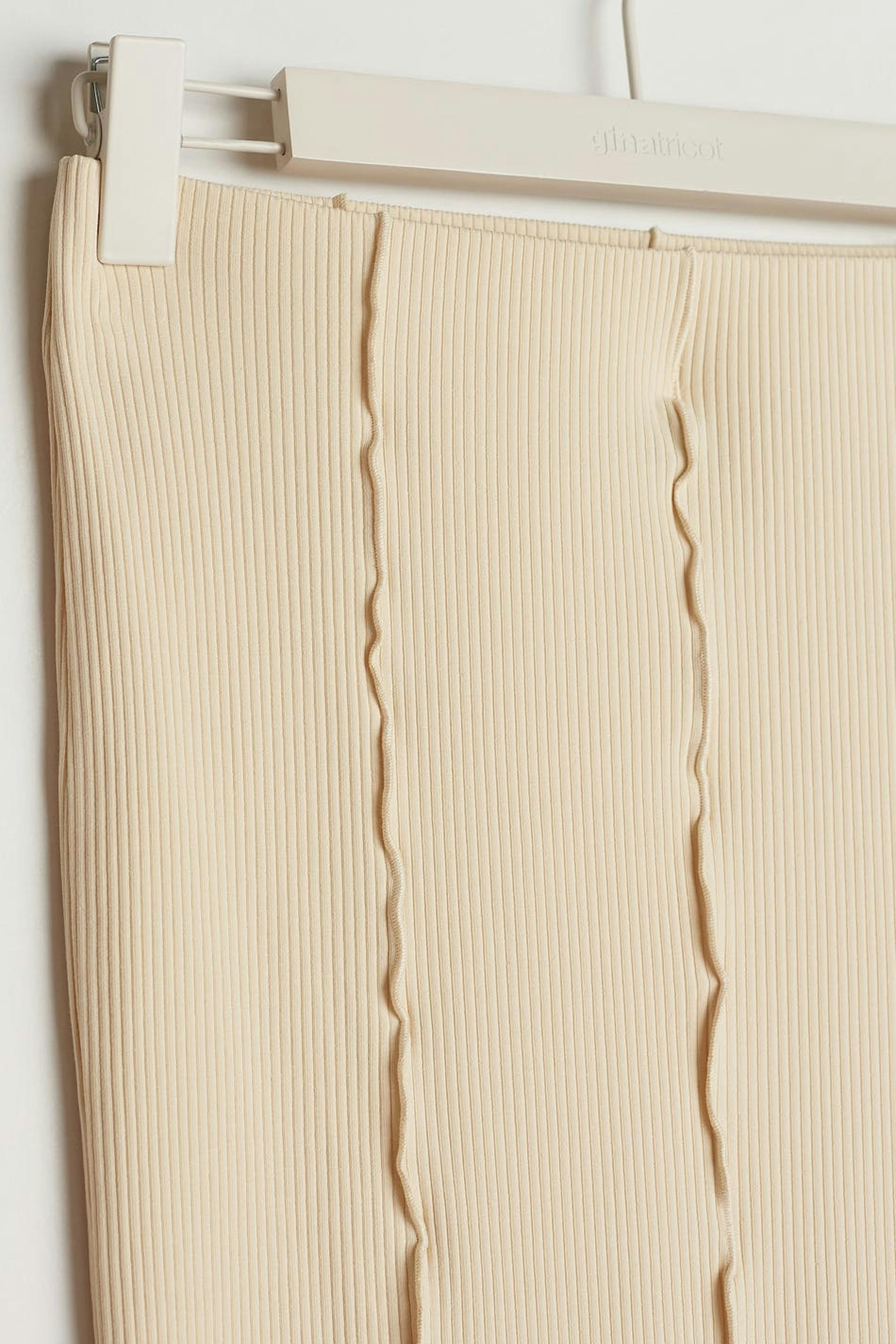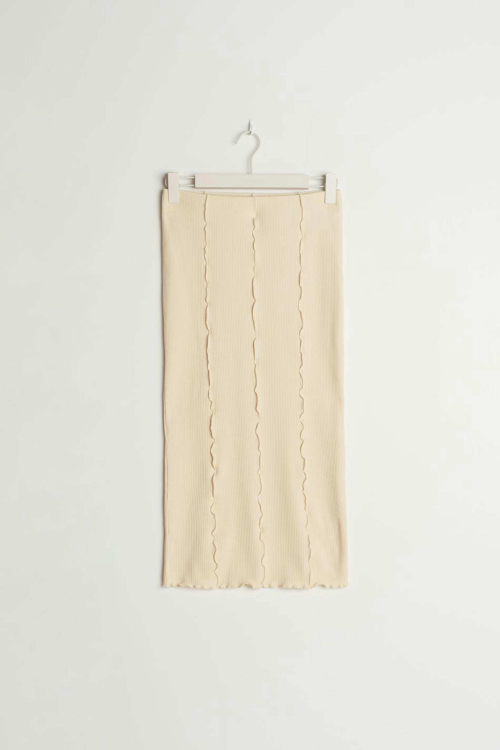 Geribbelde rok met een nauwsluitende pasvorm. De rok is beige en heeft een midi-lengte. Het heeft smalle en decoratieve ruches aan de voorkant en in de onderste zoom.