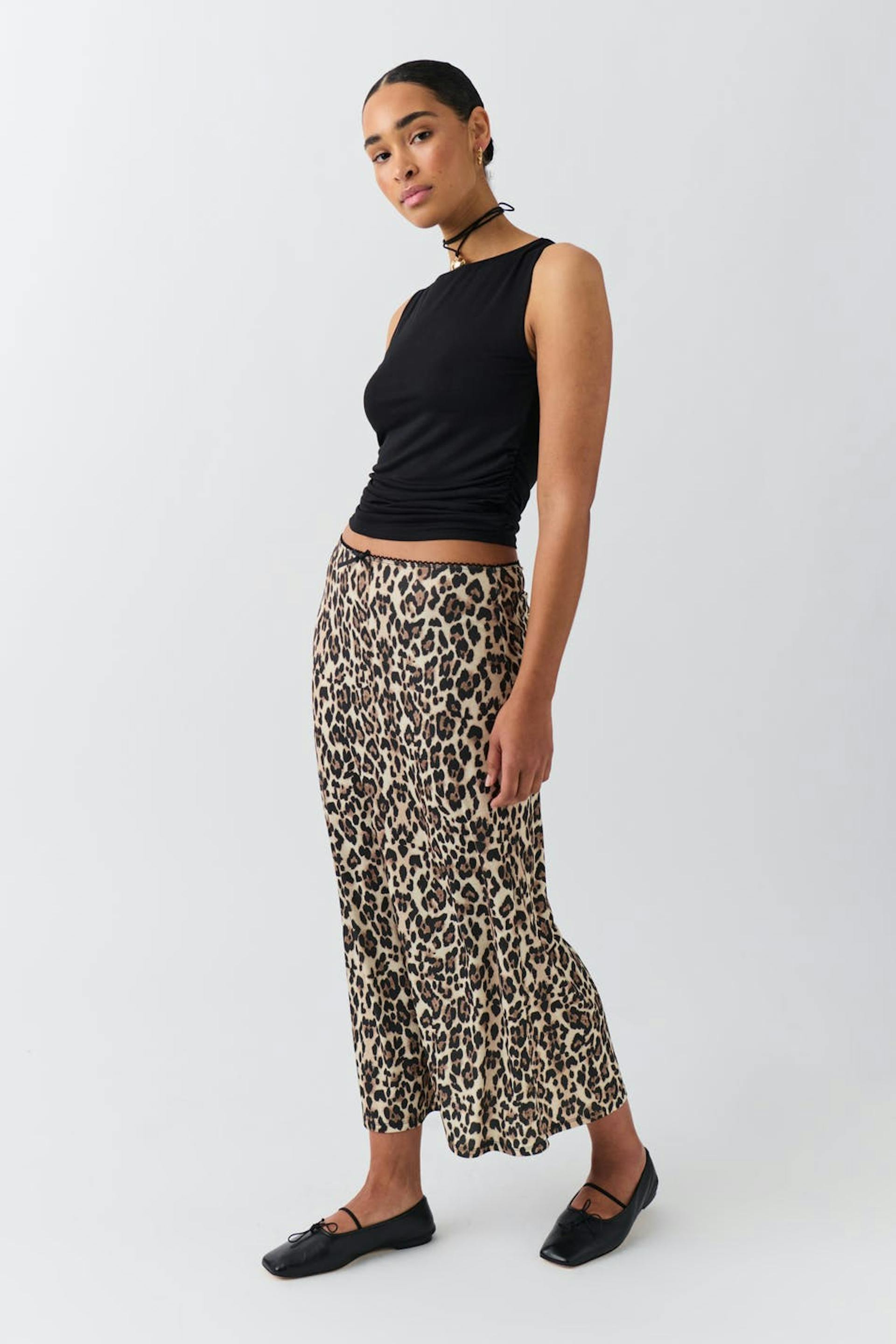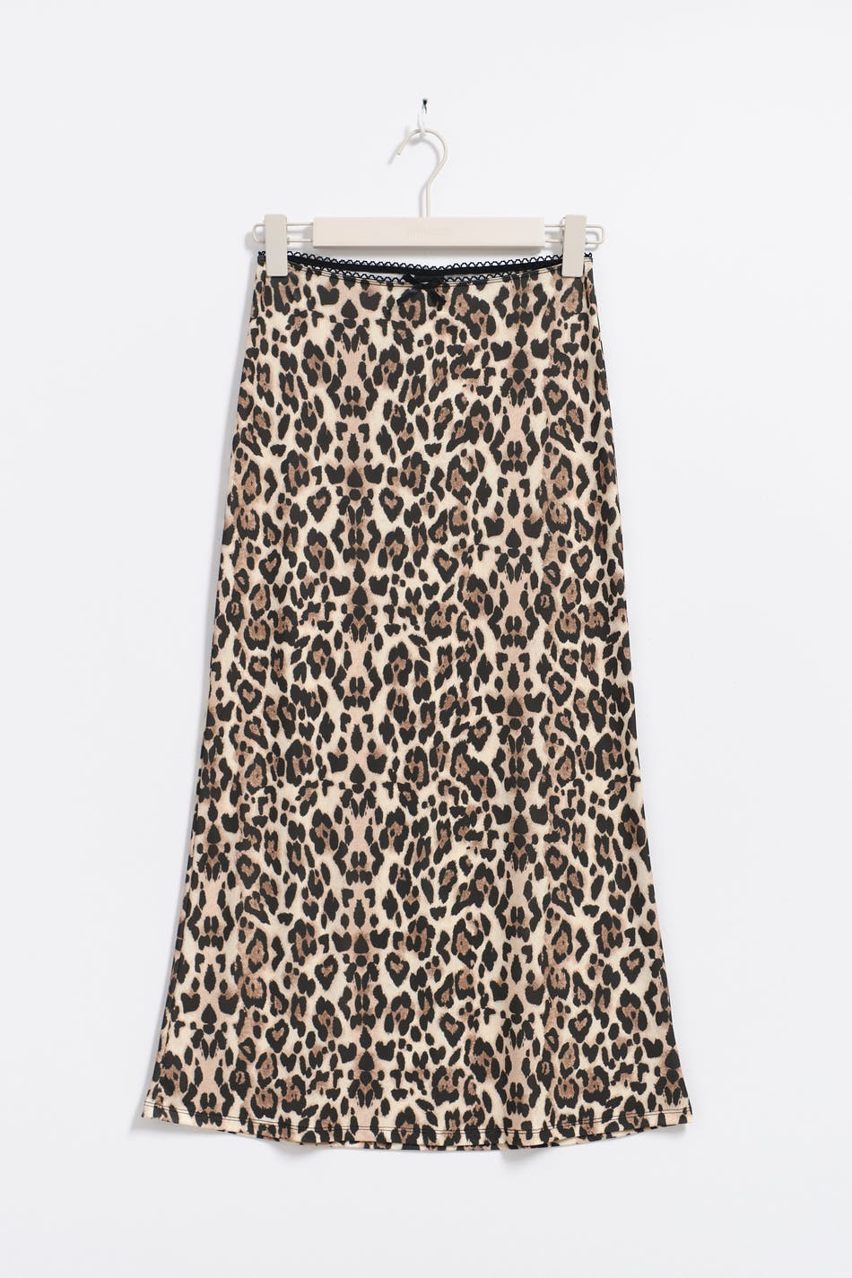 Rok van tricot met een luipaardmotief en lage taille. De rok is bruin en heeft boog detail aan de voorkant. Het heeft normale pasvorm, elastiek met picot-rand aan de taille, gevoerd voorste deel en midi-lengte.