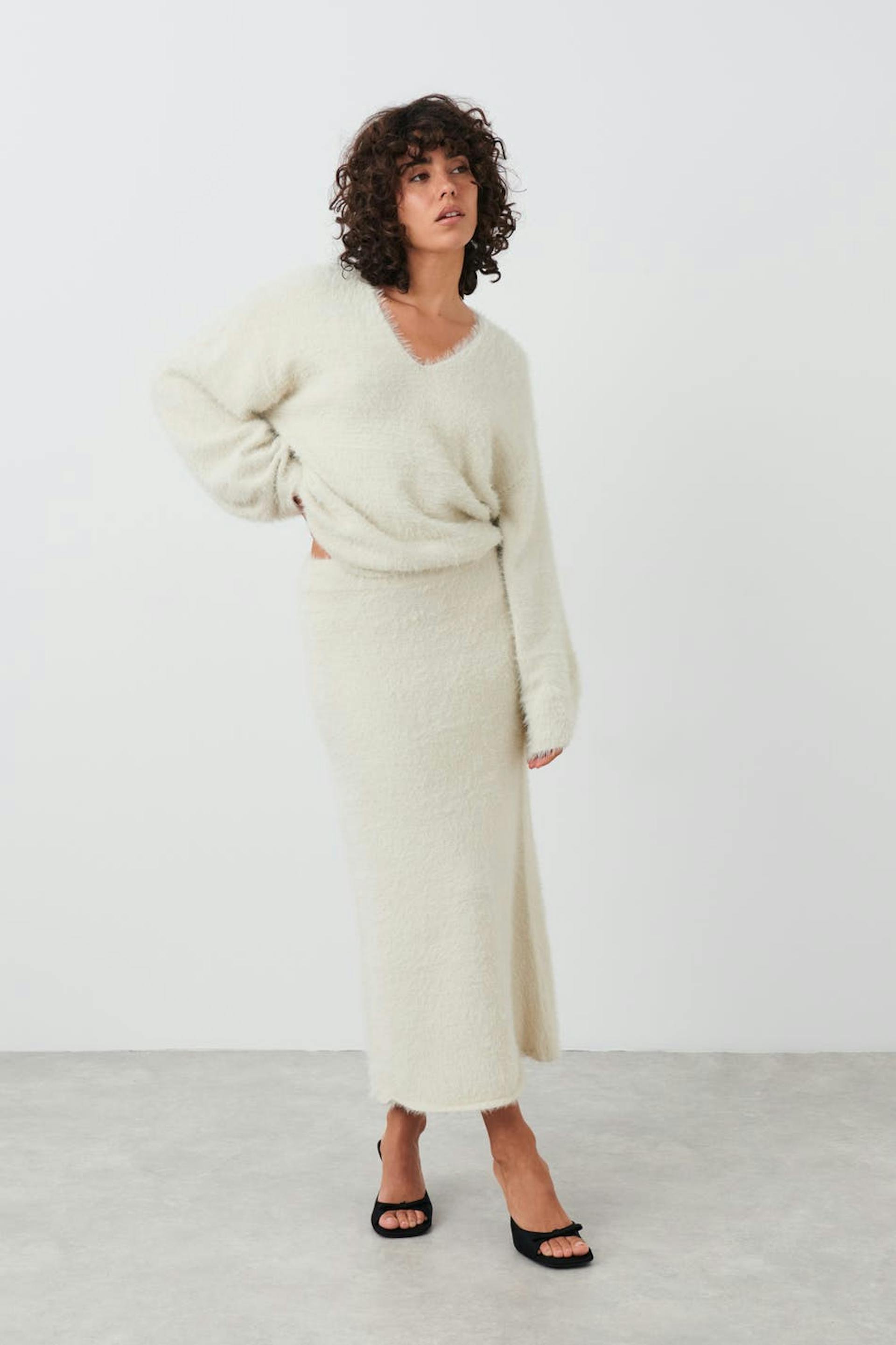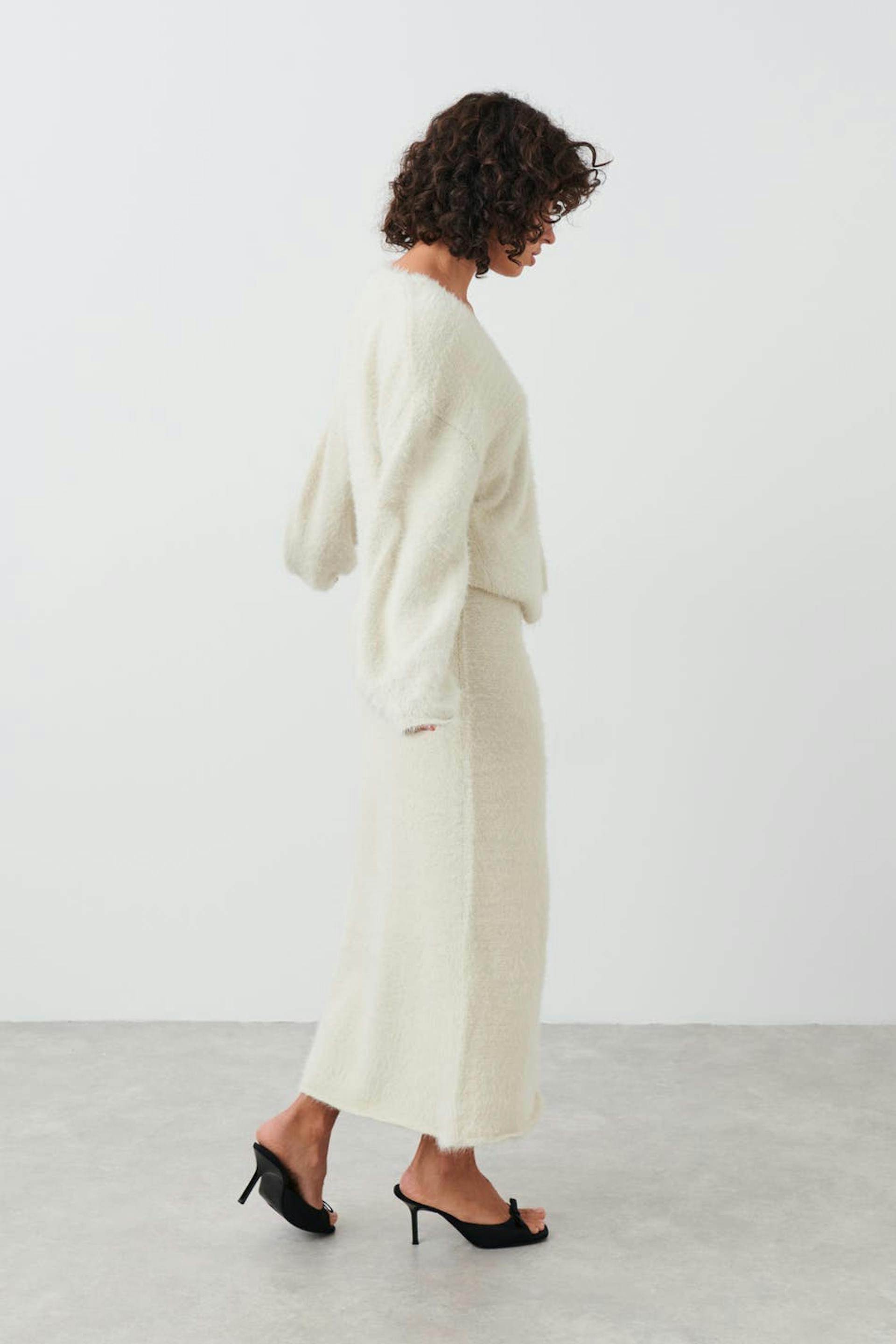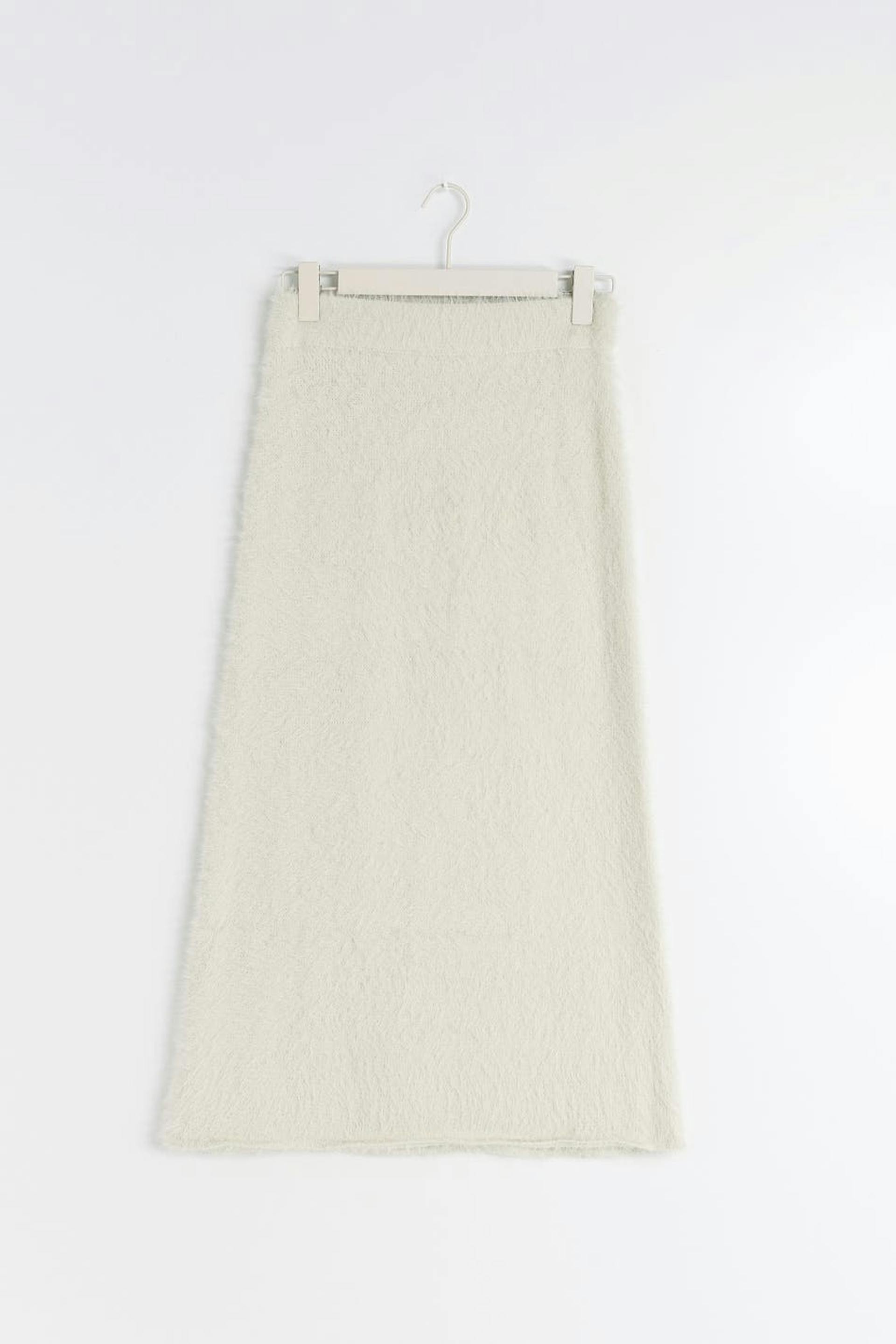 Lange rok met pluizige textuur. De rok is wit, gebreid en zacht. Het heeft elastiek aan de taille en broek met brede pijpen.