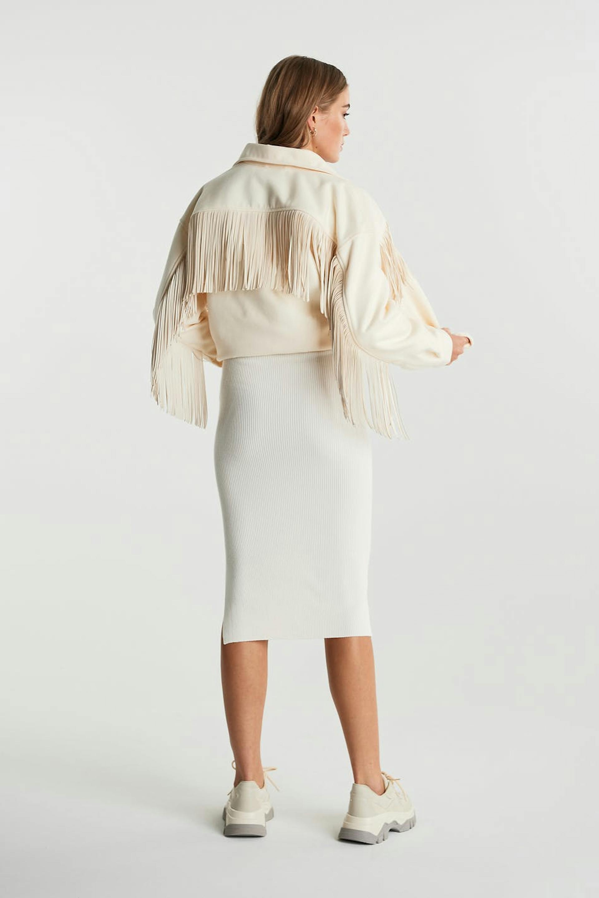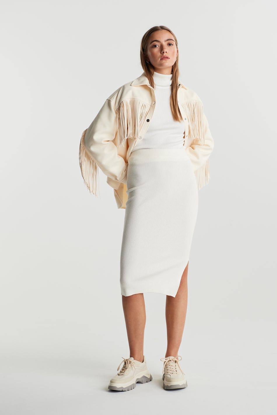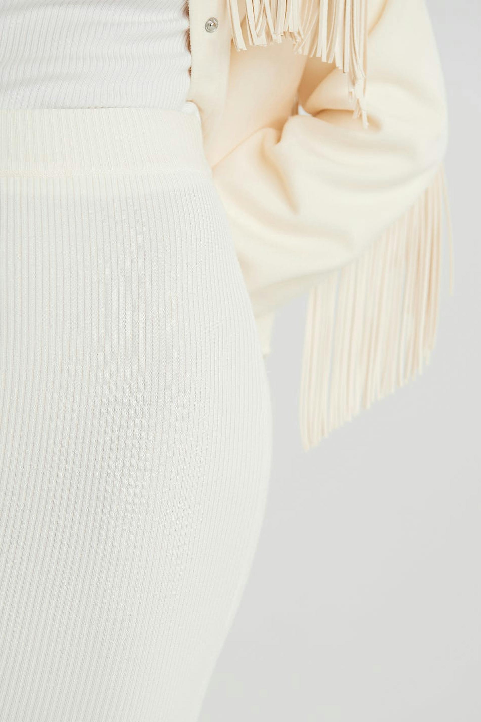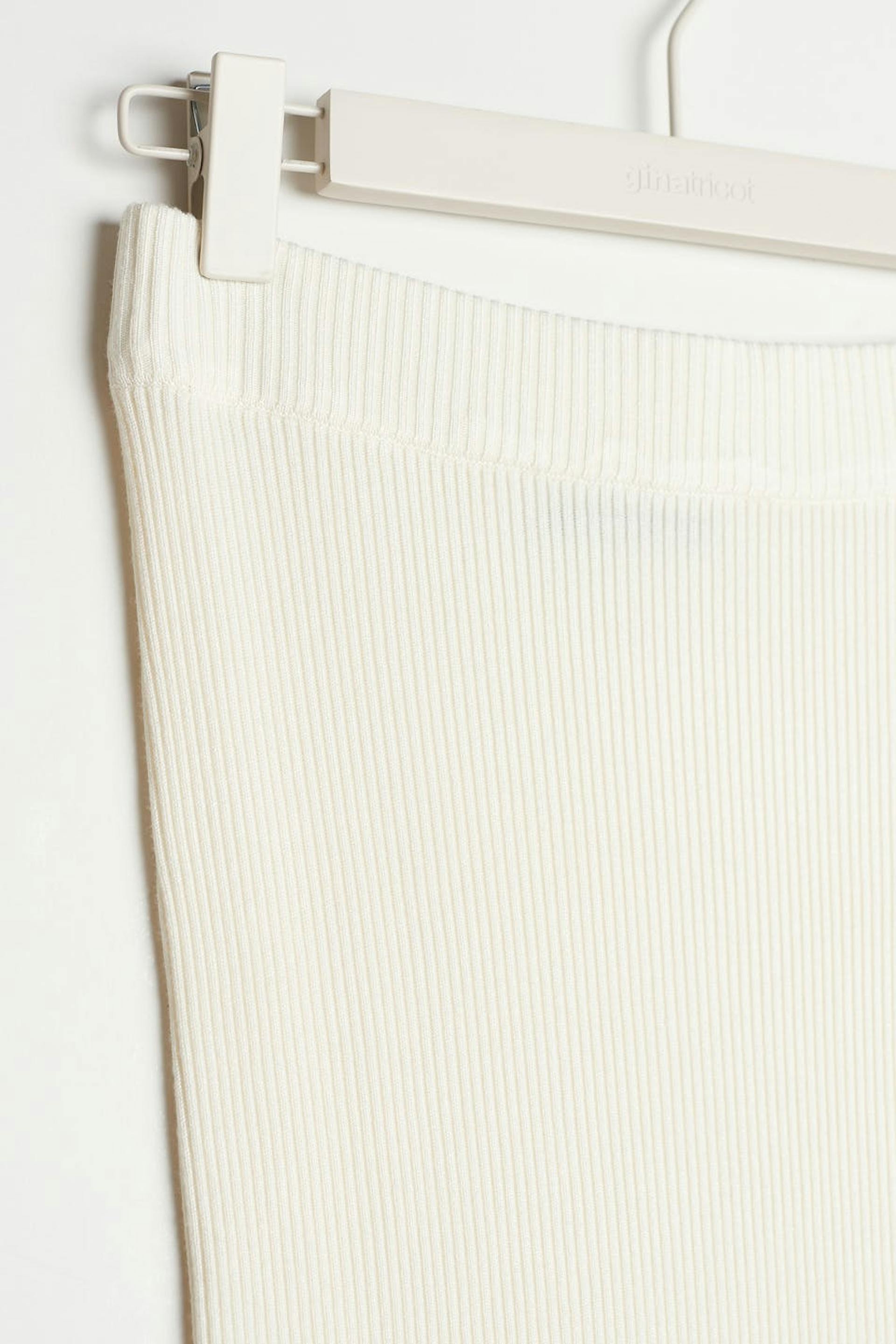Gebreide rok met een spleet aan de zijkanten. De rok is wit en knielengte en heeft een nauwsluitende pasvorm.