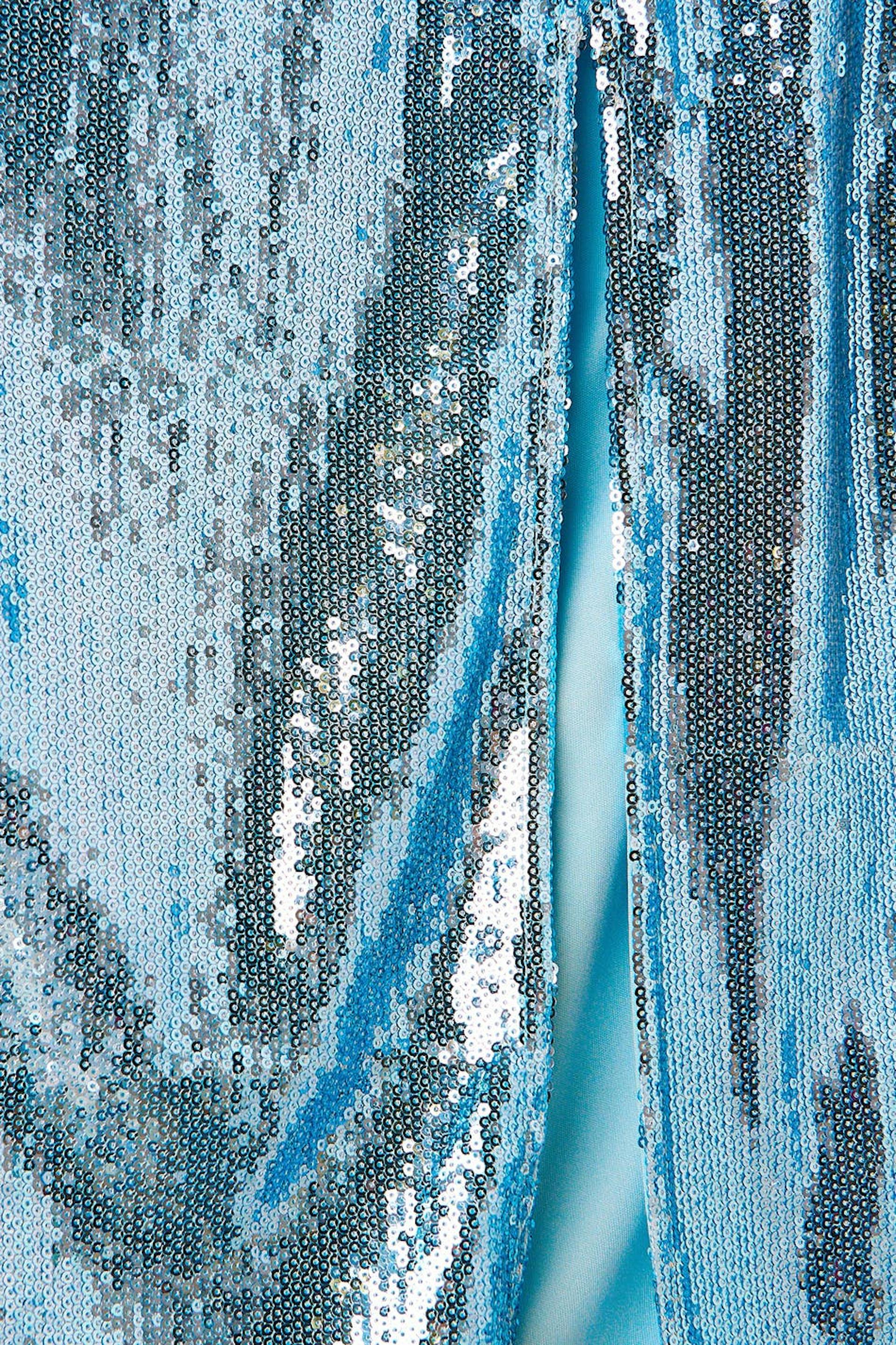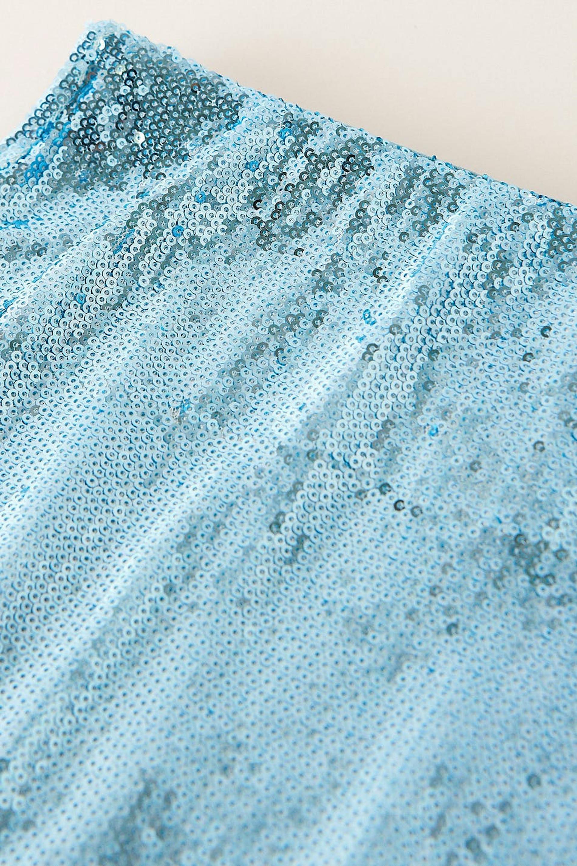 Rok met blauwe pailletten. De rok is perfect voor het feest en heeft een spleet aan de zijkant. Het heeft een midi-lengte en een elastiek aan de taille.