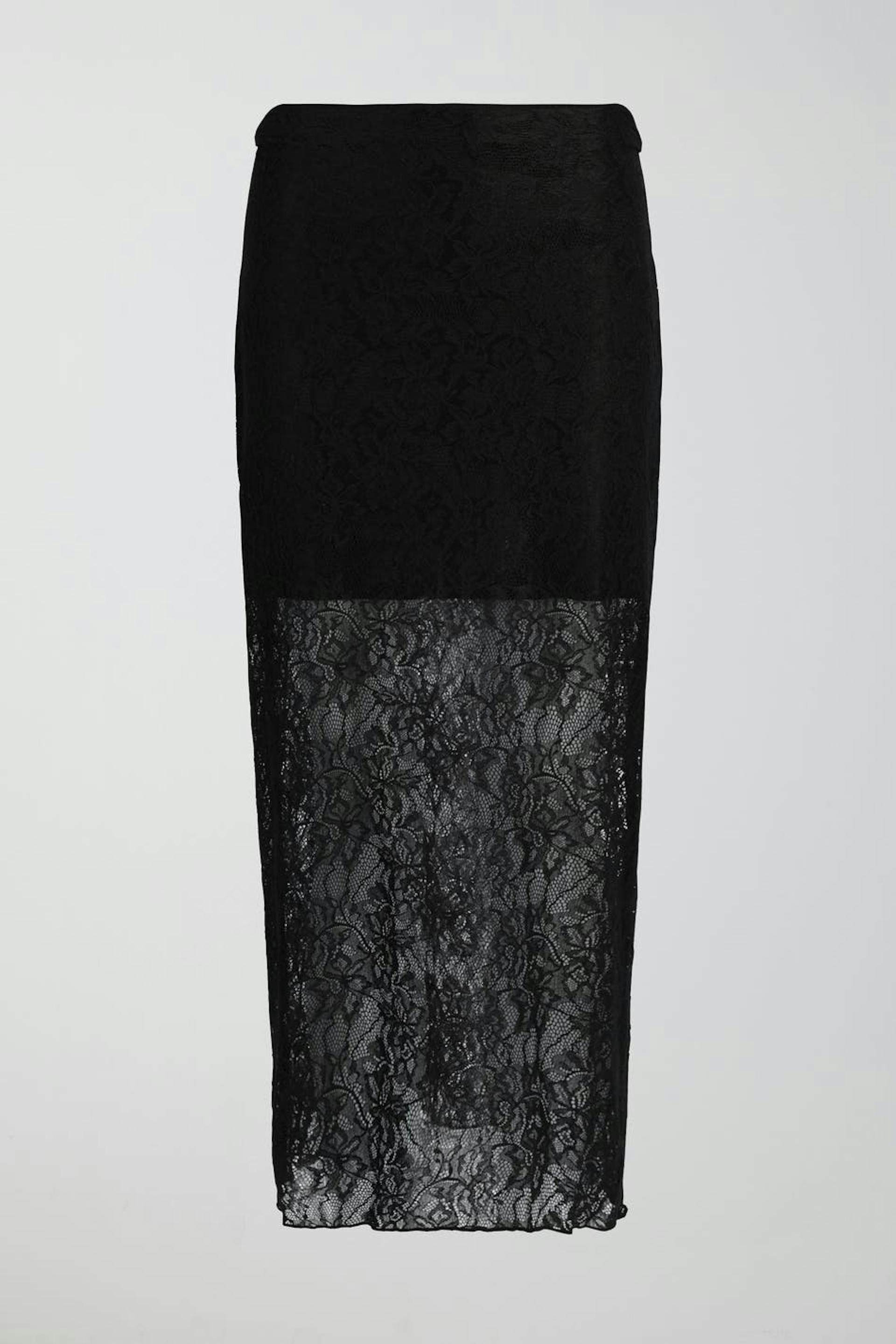 Kanten rok met rechte pasvorm. De rok is zwart en heeft verborgen elastiek aan de taille. Het heeft korte onderrok en een midi-lengte.