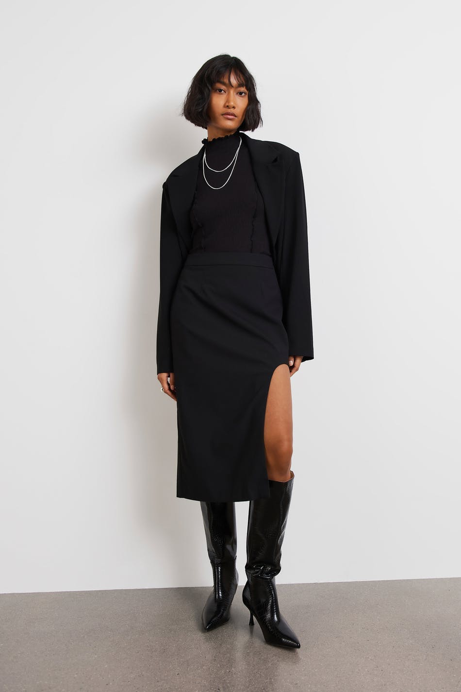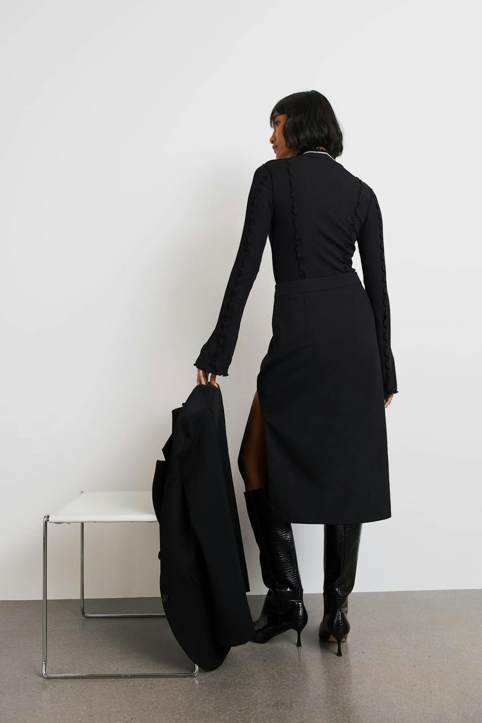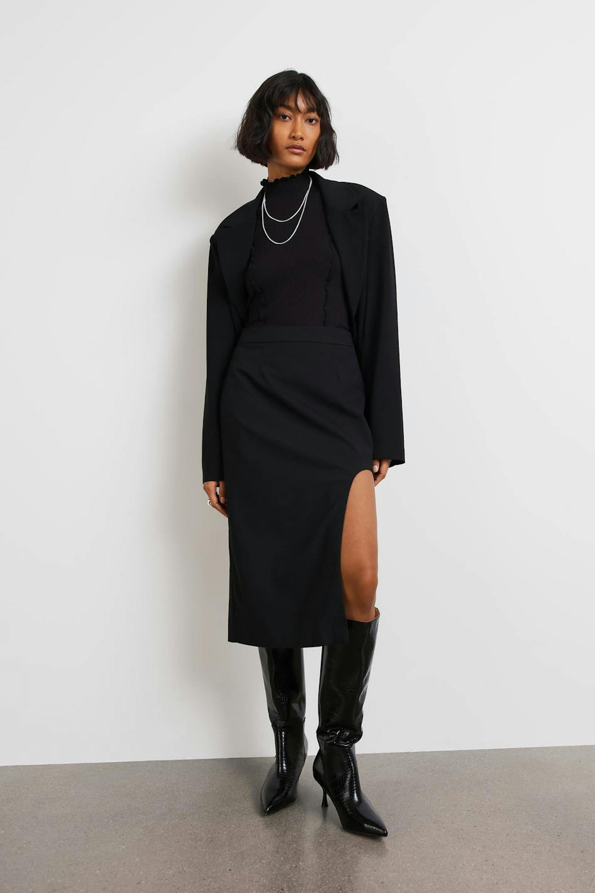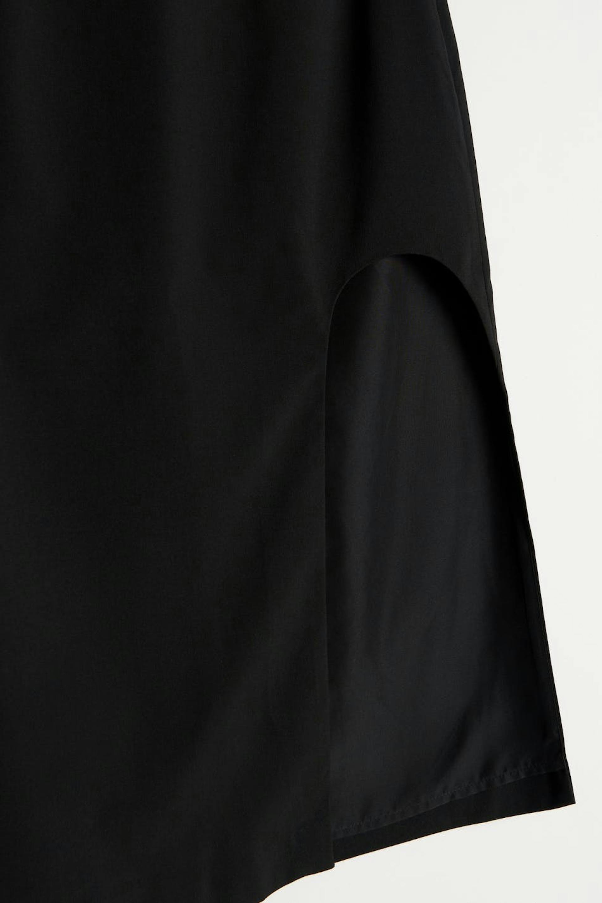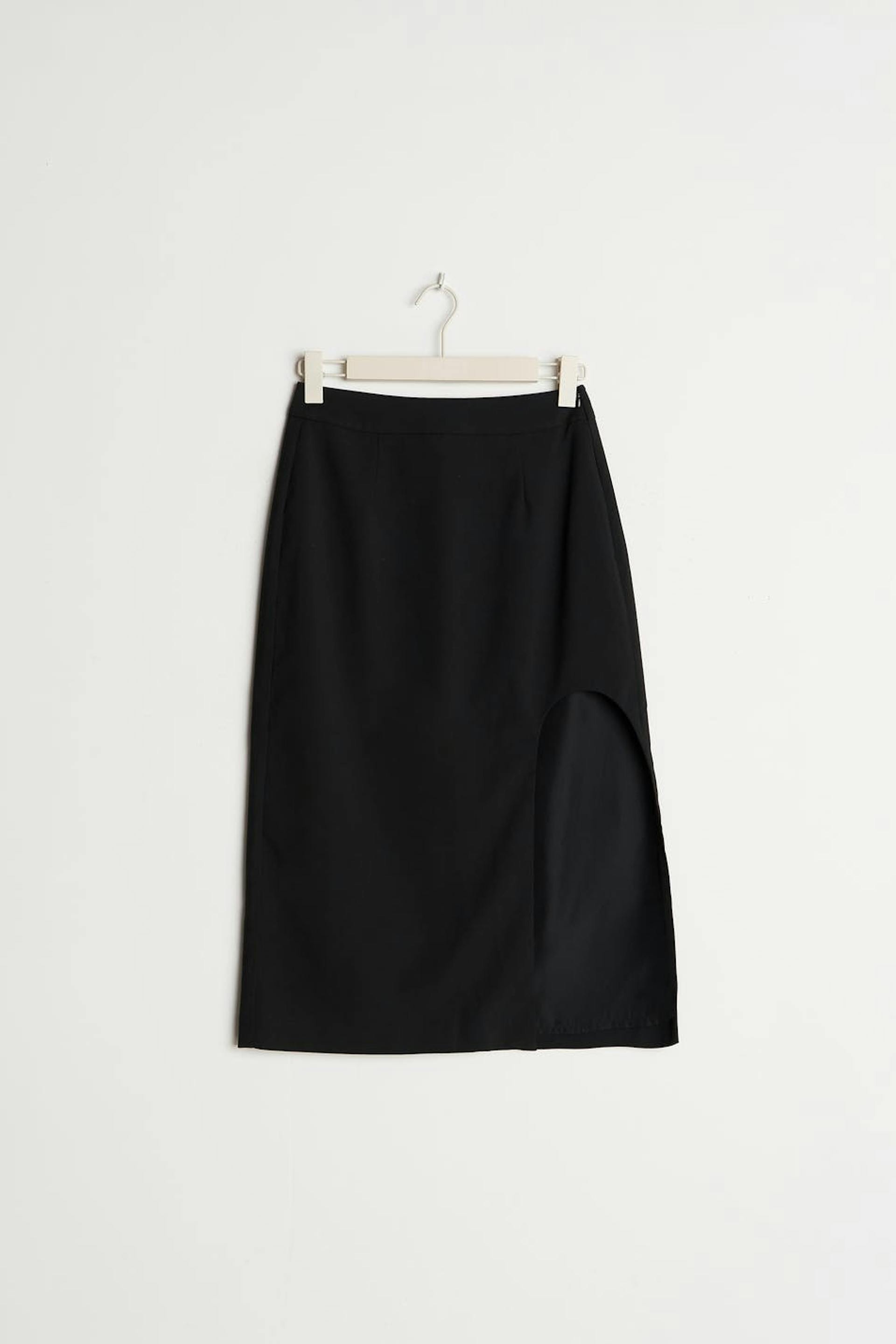 Koker rok met afgeronde spleet. De rok is zwart en heeft een normale pasvorm. Het heeft een midi-lengte en een verborgen rits achter.