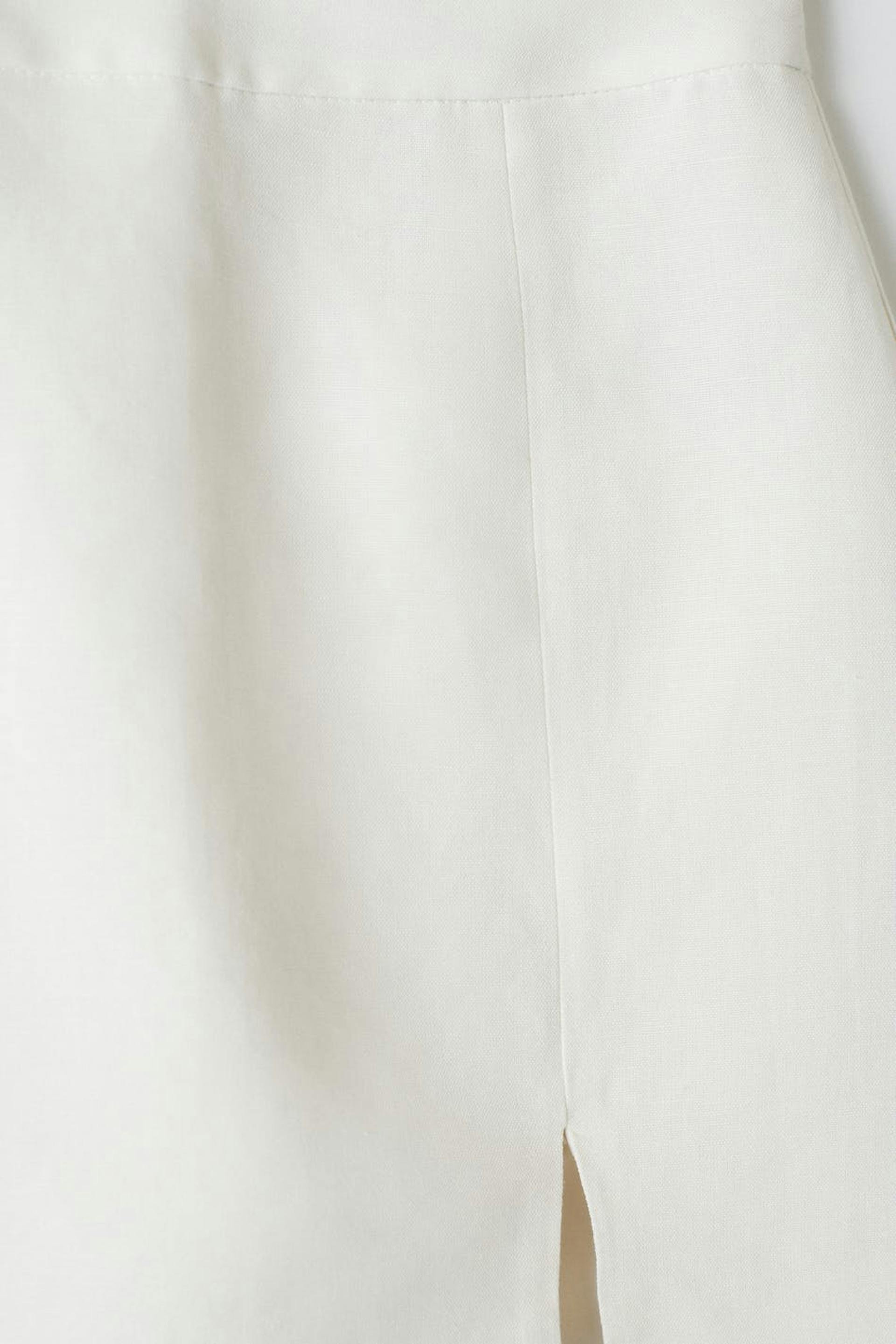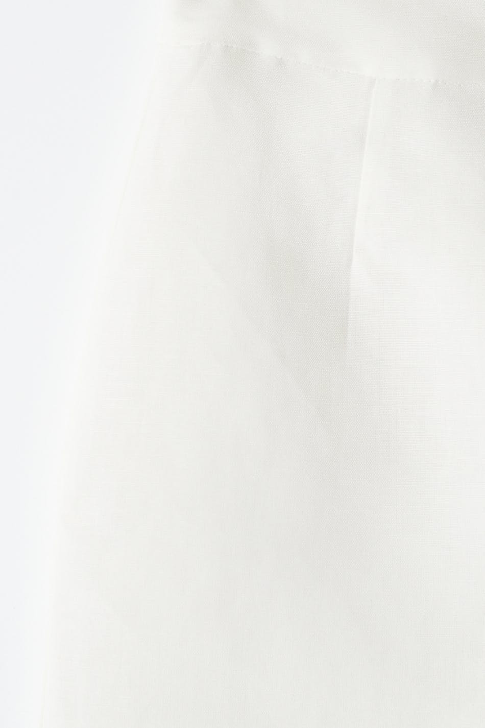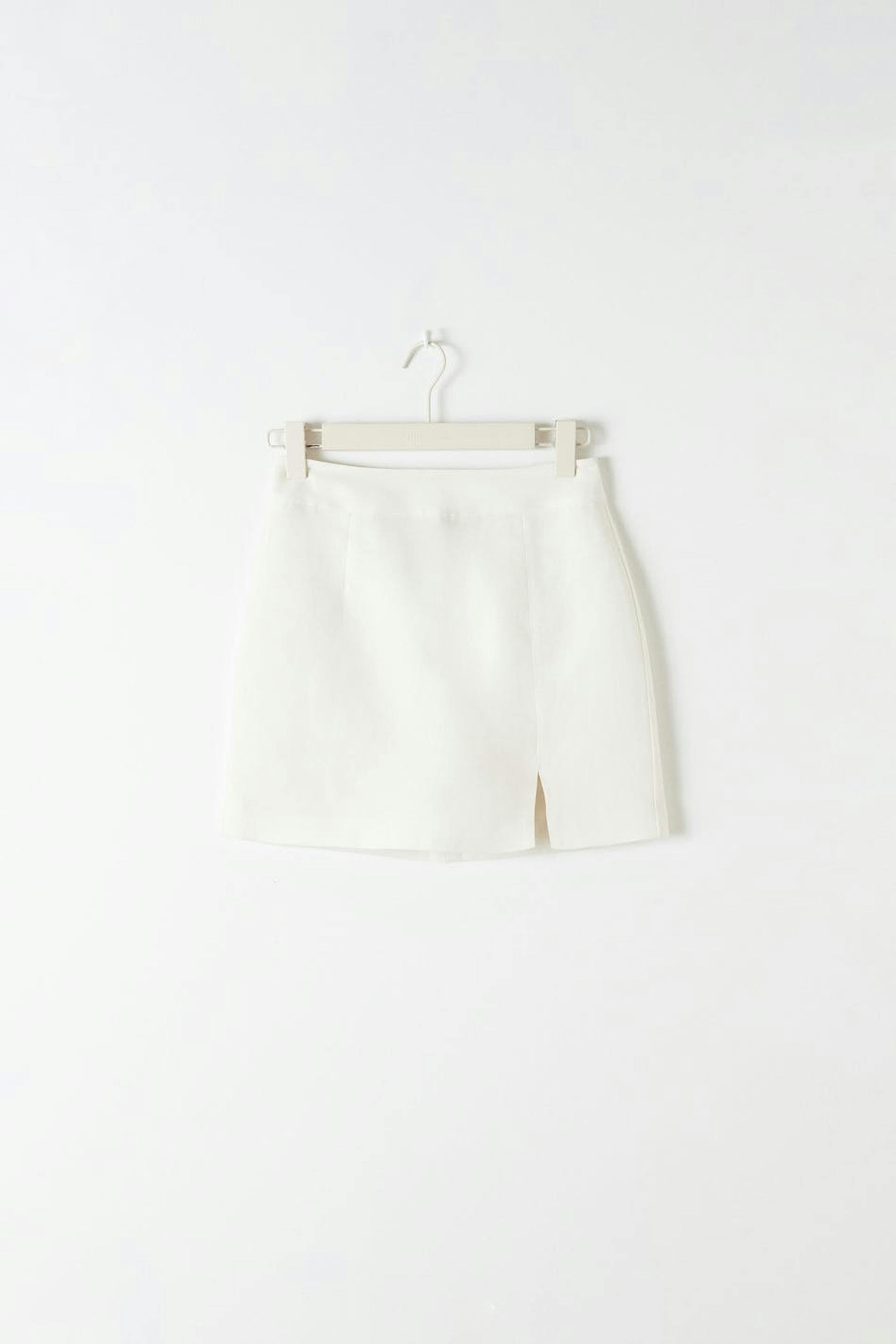 Korte linnen rok met spleet aan de voorzijde. De linnen rok is wit en heeft een rits achter.