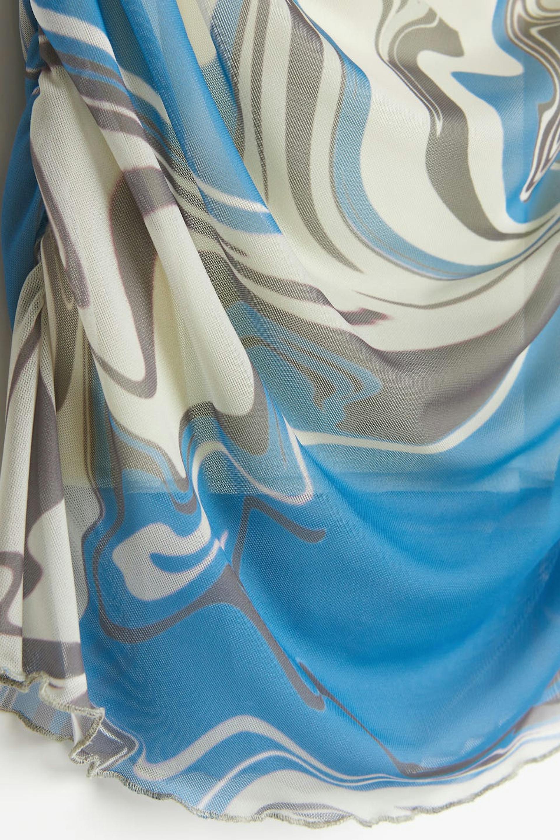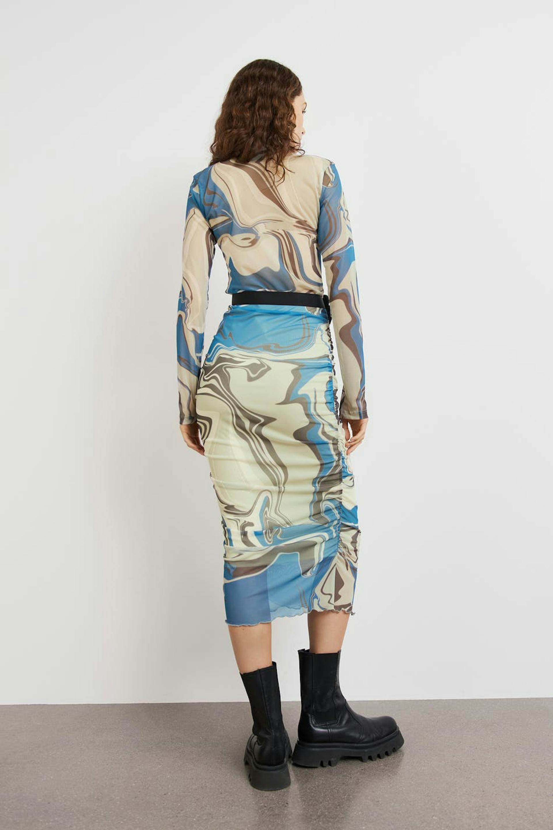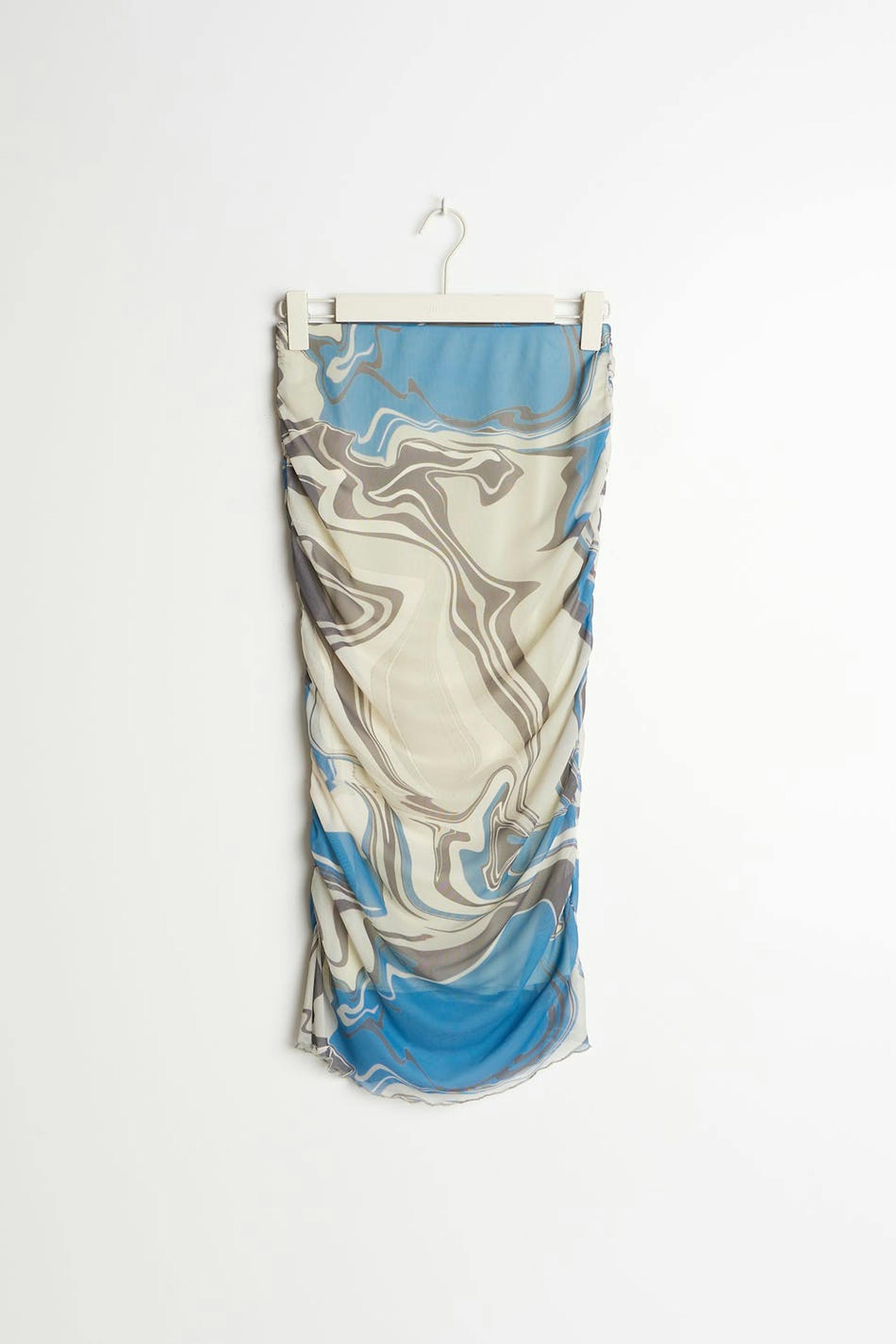 Met een wervelpatroon midi rok met een nauwsluitende pasvorm. De rok is blauw, gedrapeerd en gevoerd. Het is gemaakt van mesh en heeft een elastiek aan de taille en smalle ruches in de onderste zoom.