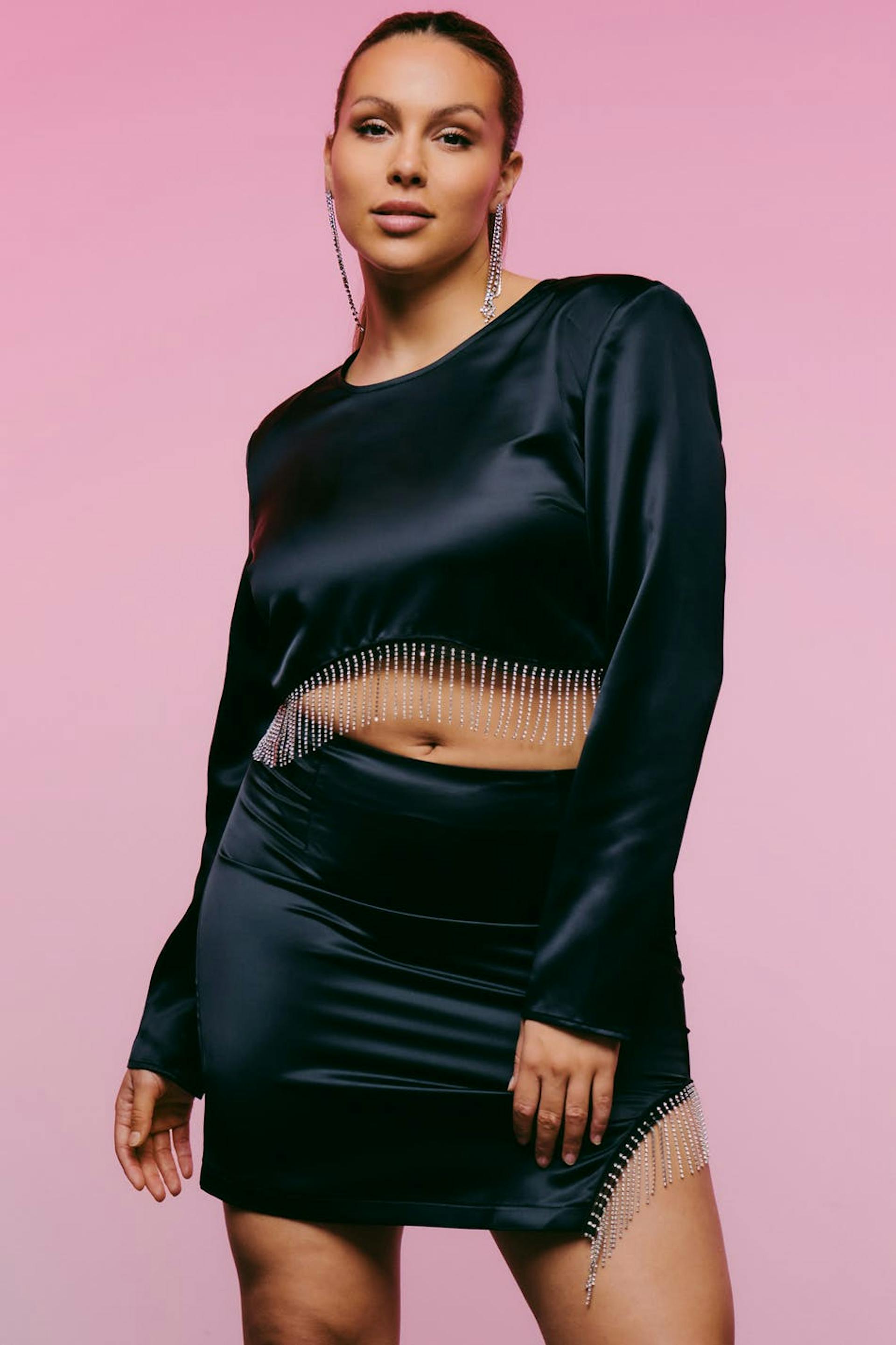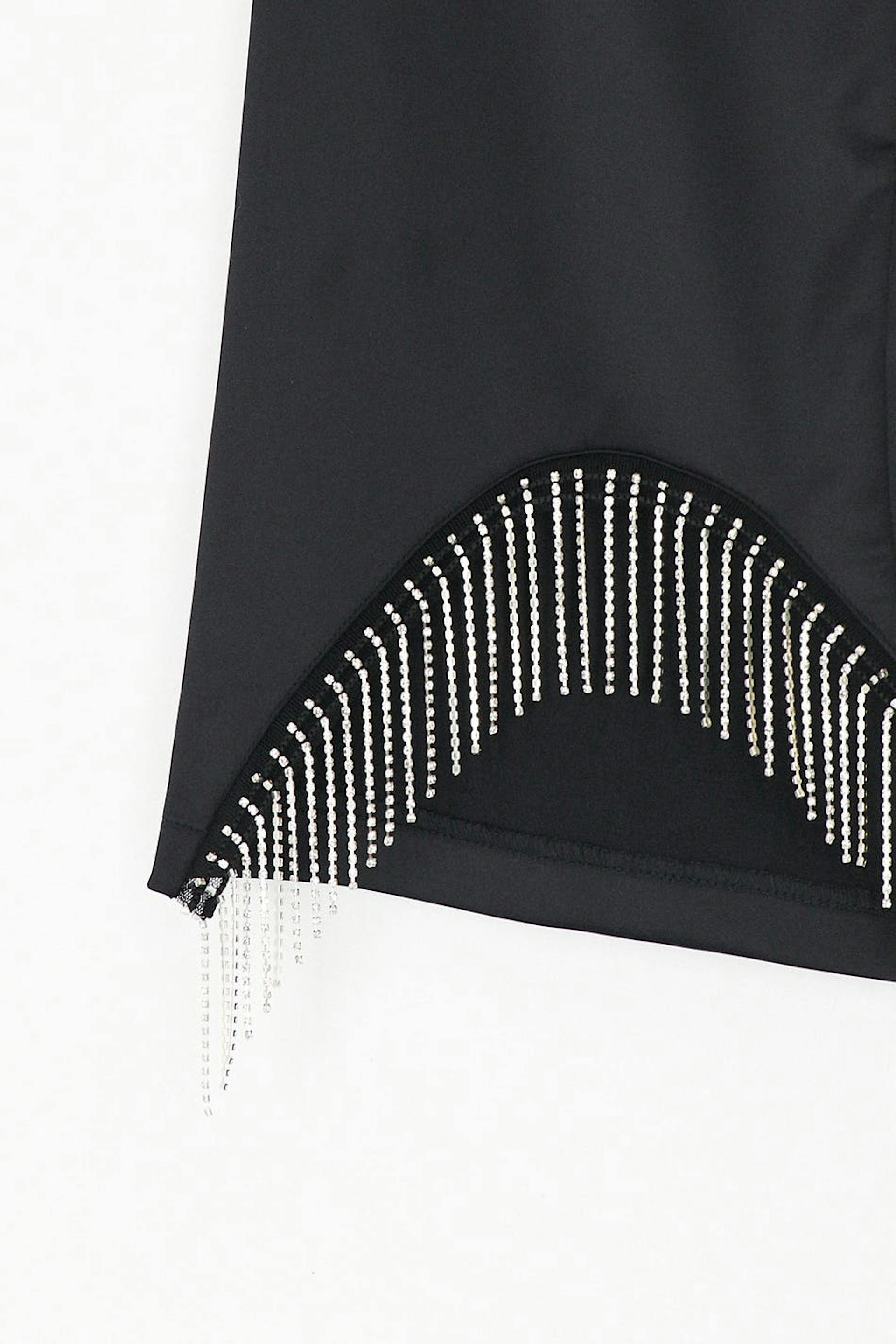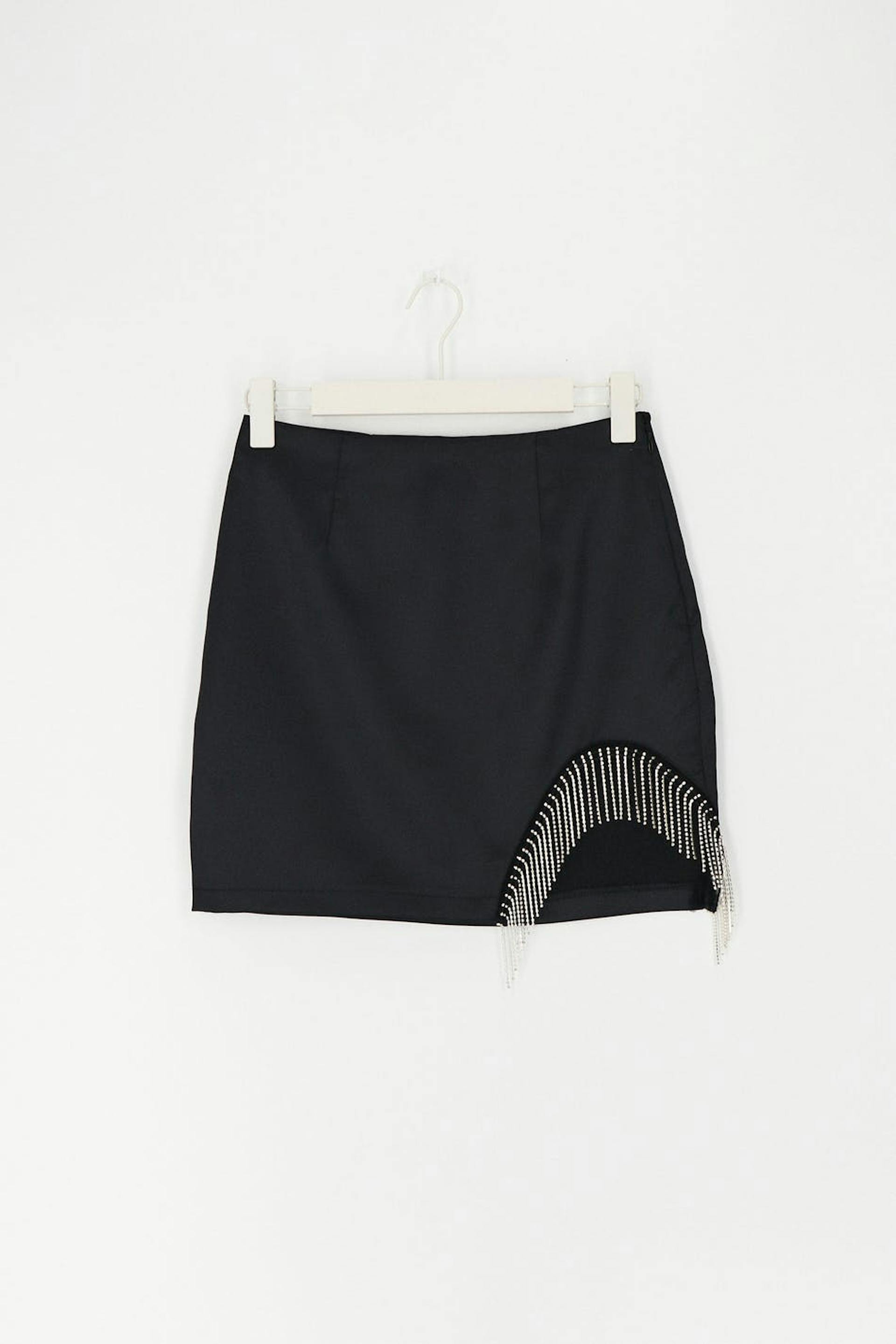 Mini rok met nauwsluitende pasvorm. De rok is zwart en heeft spleet met strass-franjes aan de voorkant. Het heeft rits in de zijnaad.