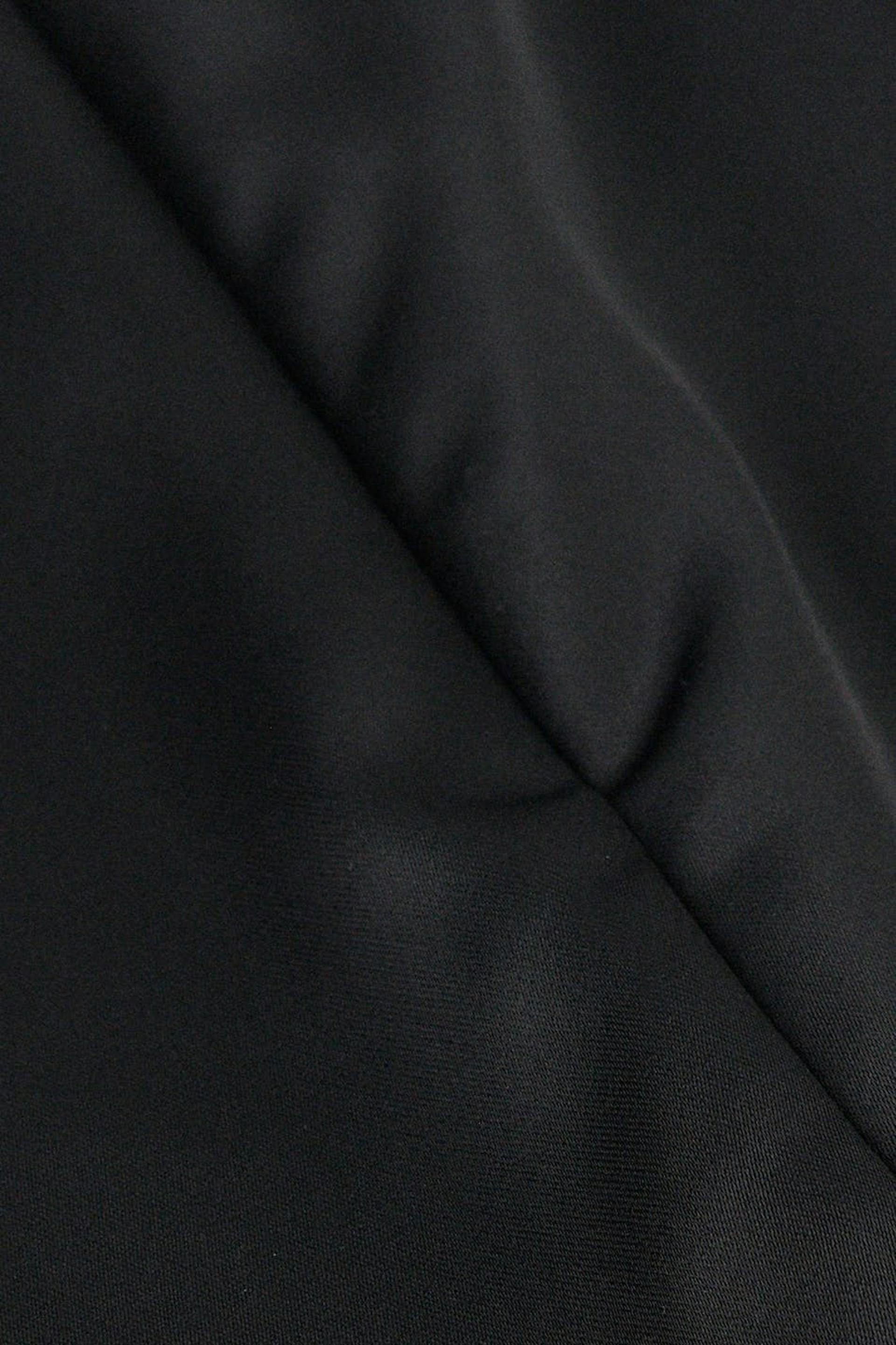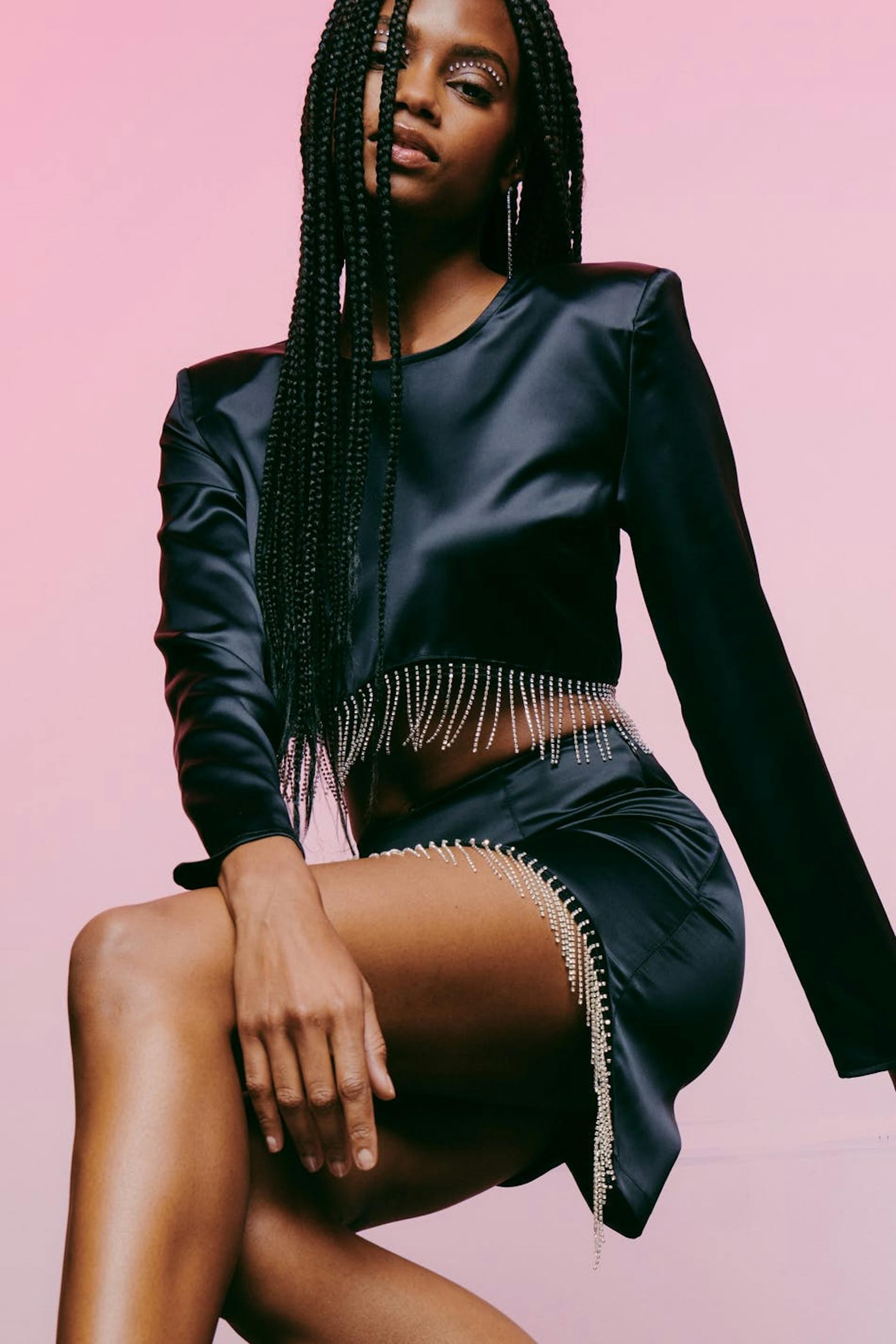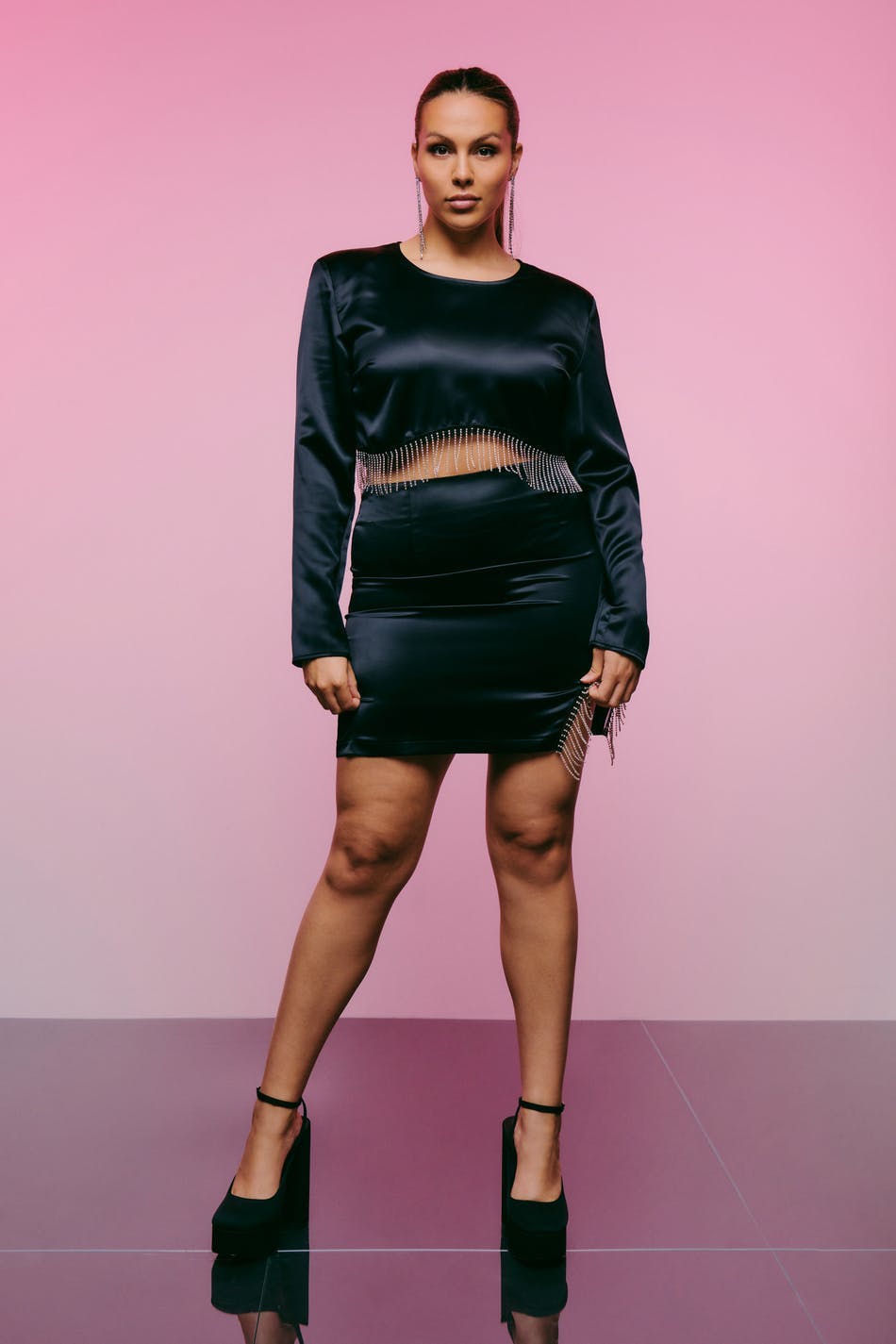 Mini rok met nauwsluitende pasvorm. De rok is zwart en heeft spleet met strass-franjes aan de voorkant. Het heeft rits in de zijnaad.