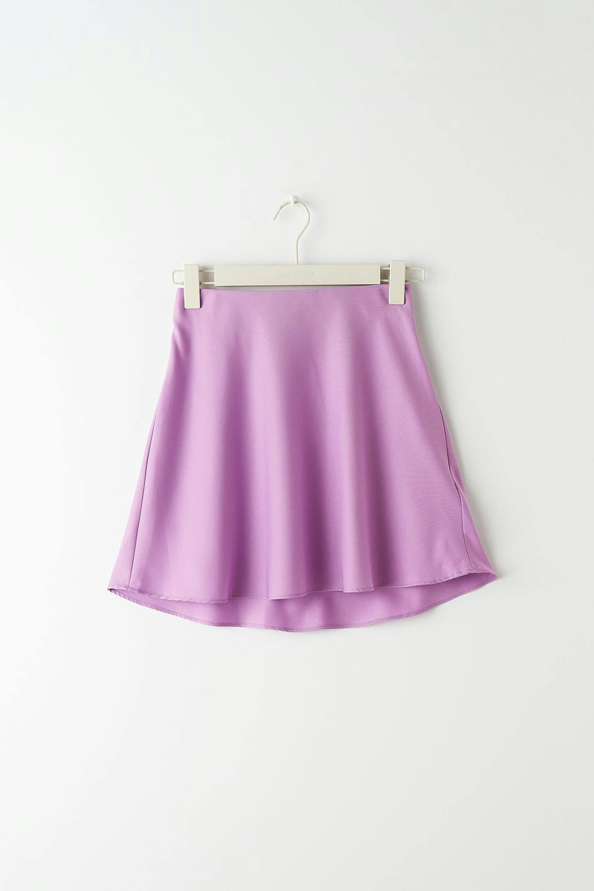 Rok van 100% gerecycleerd polyester met een verborgen elastiek aan de taille. De rok is paars.