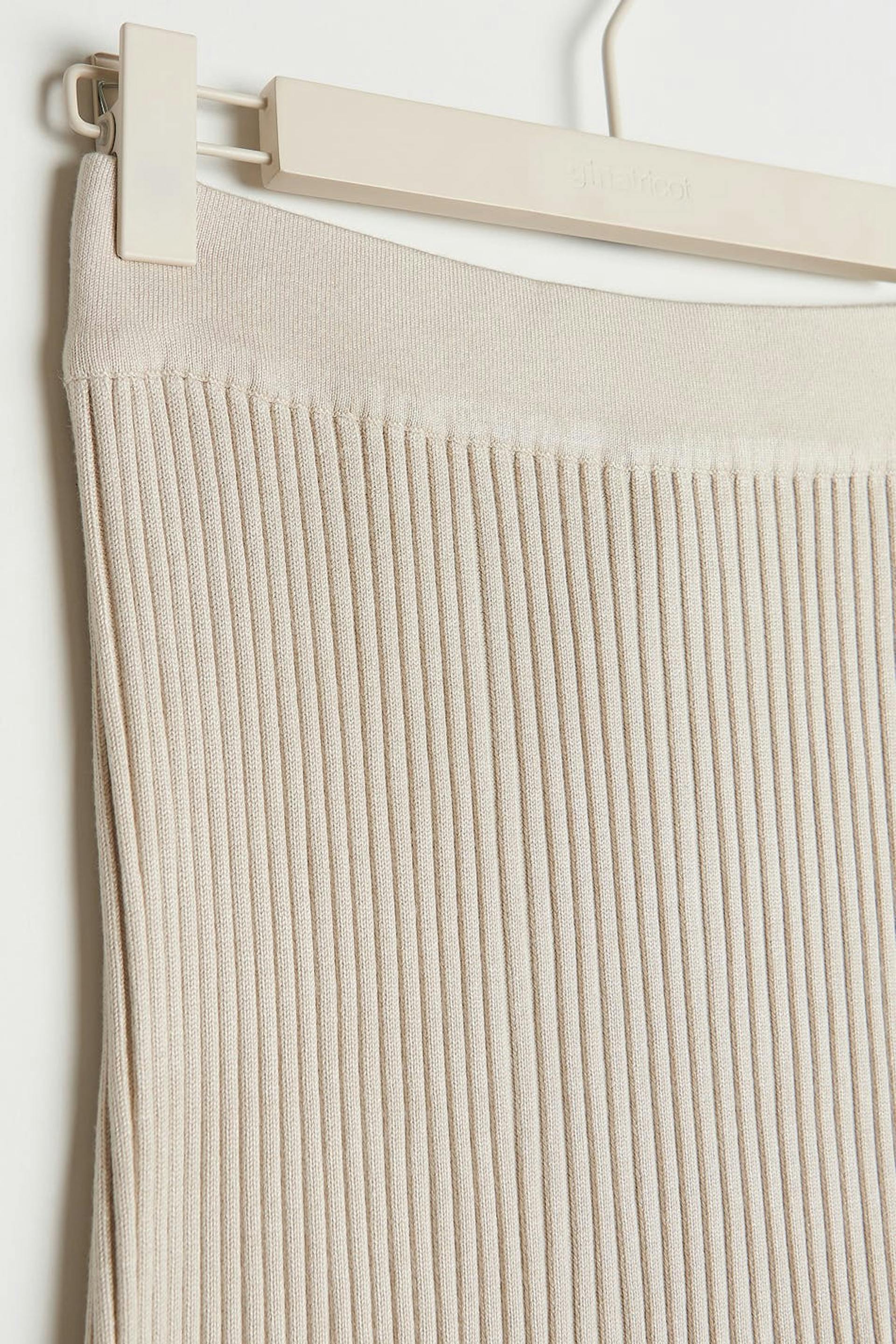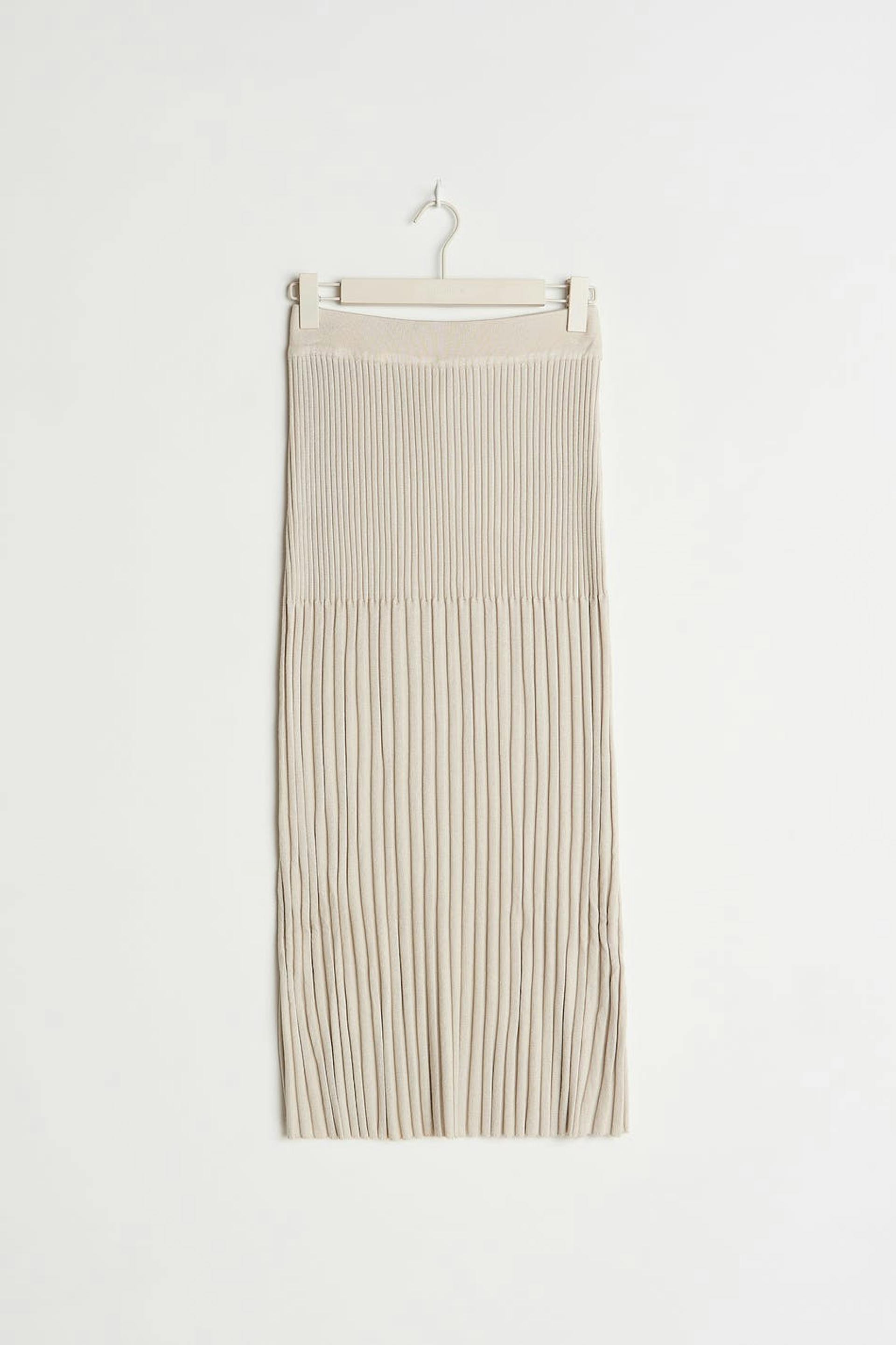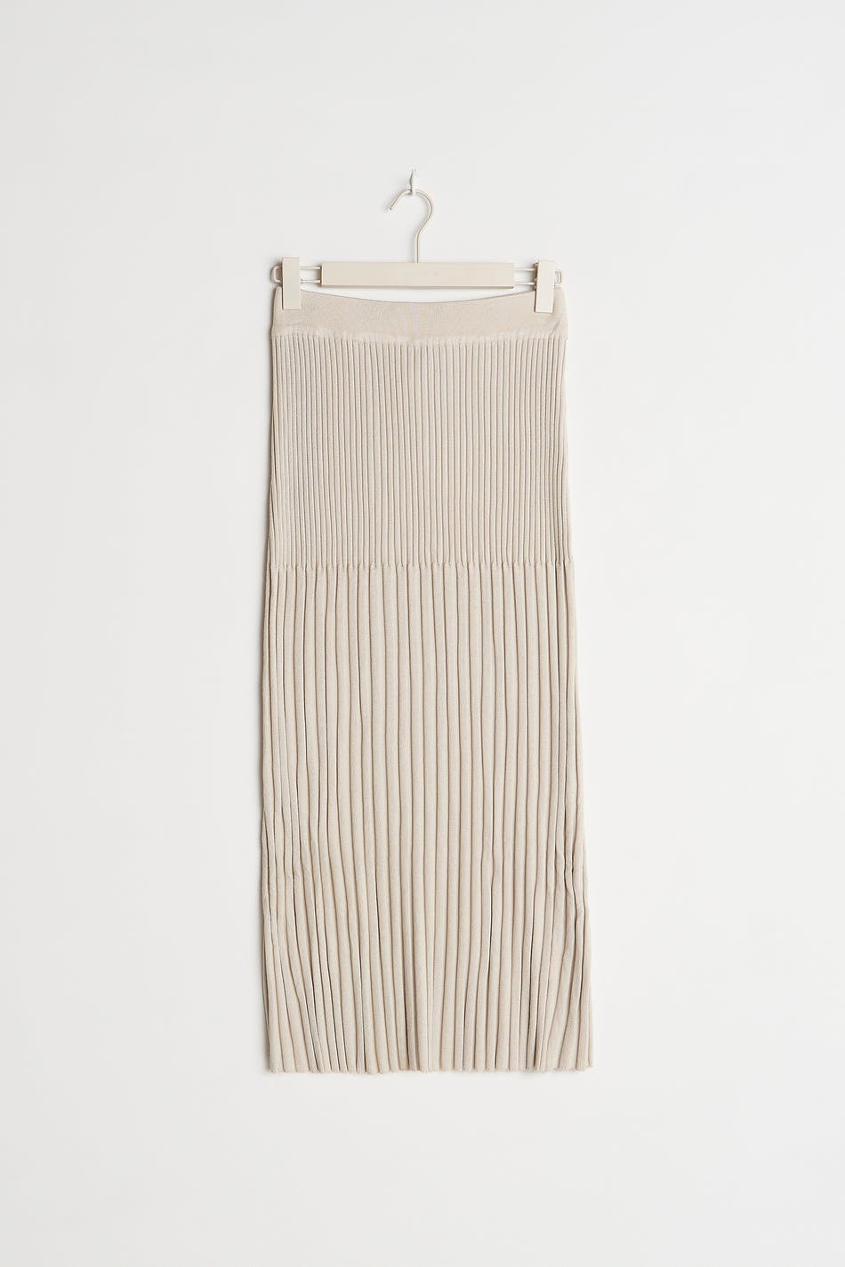 Lange rok met een geribbelde kwaliteit. De rok is beige, gebreid en flared. Het heeft een elastiek aan de taille en een midi-lengte.