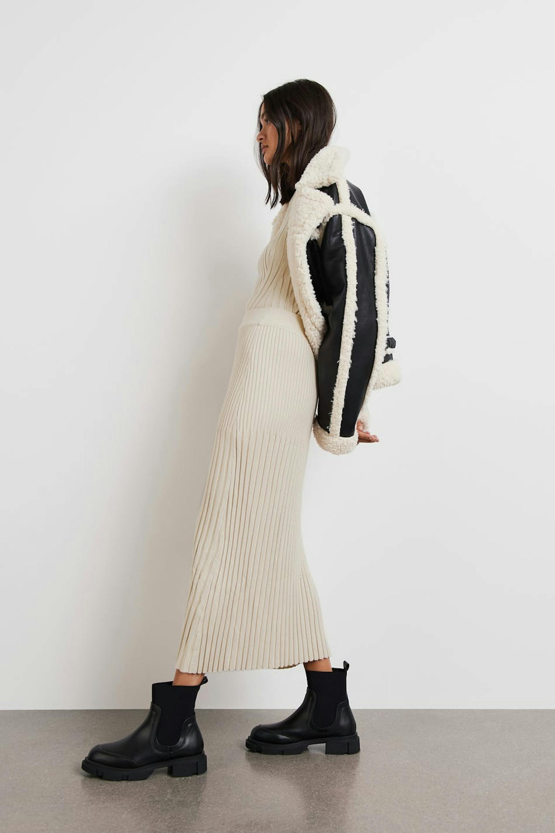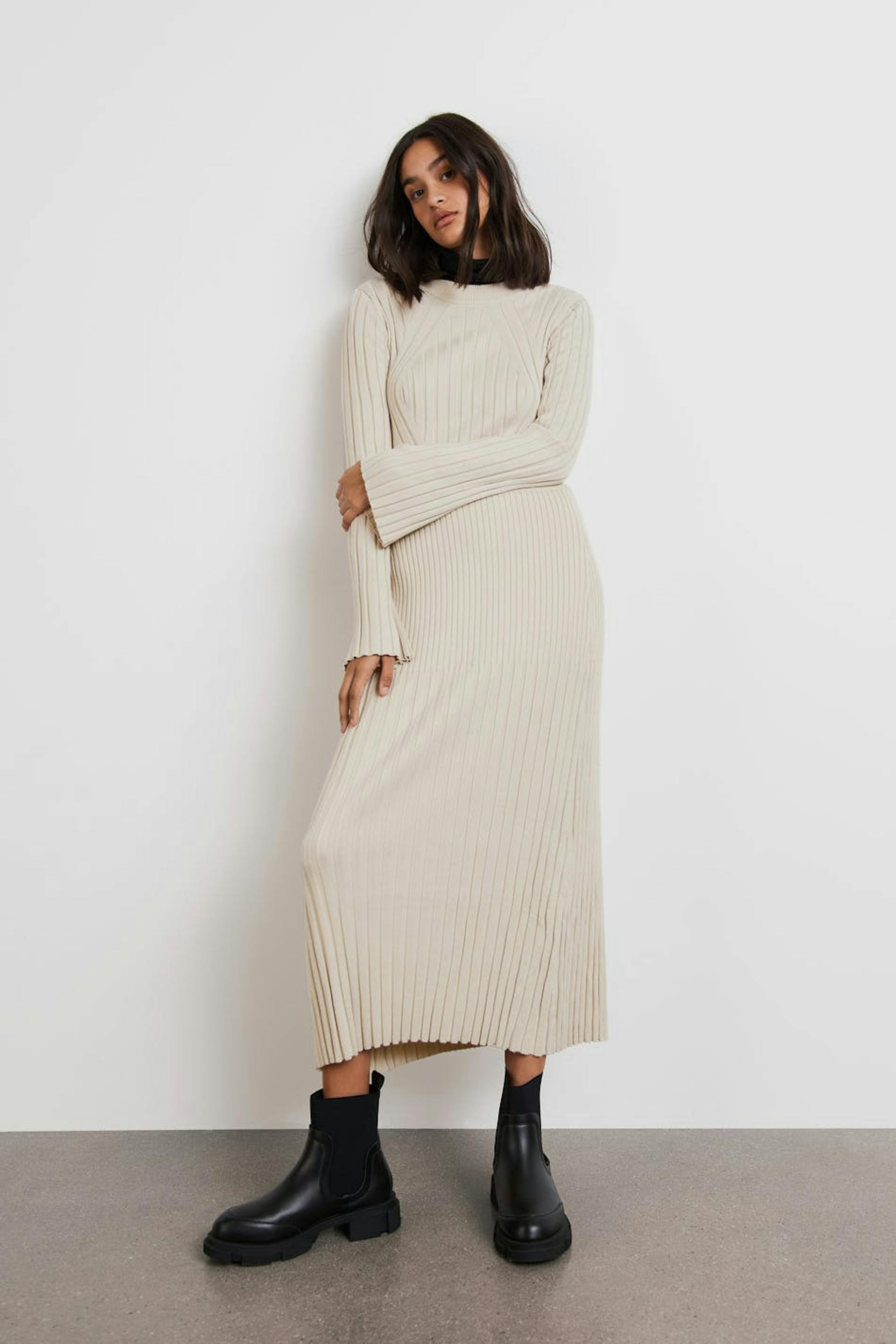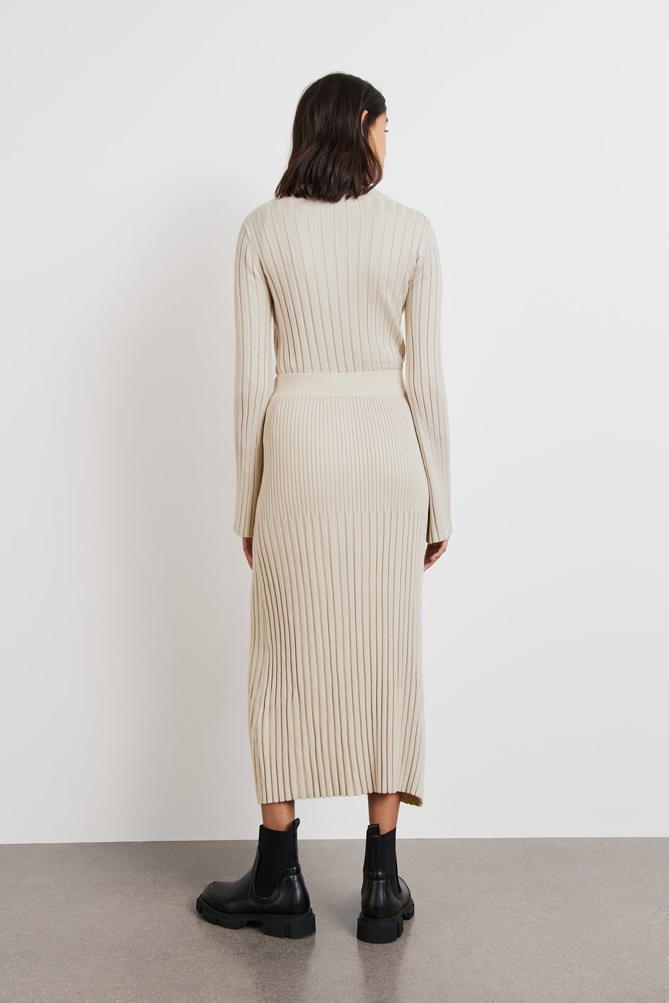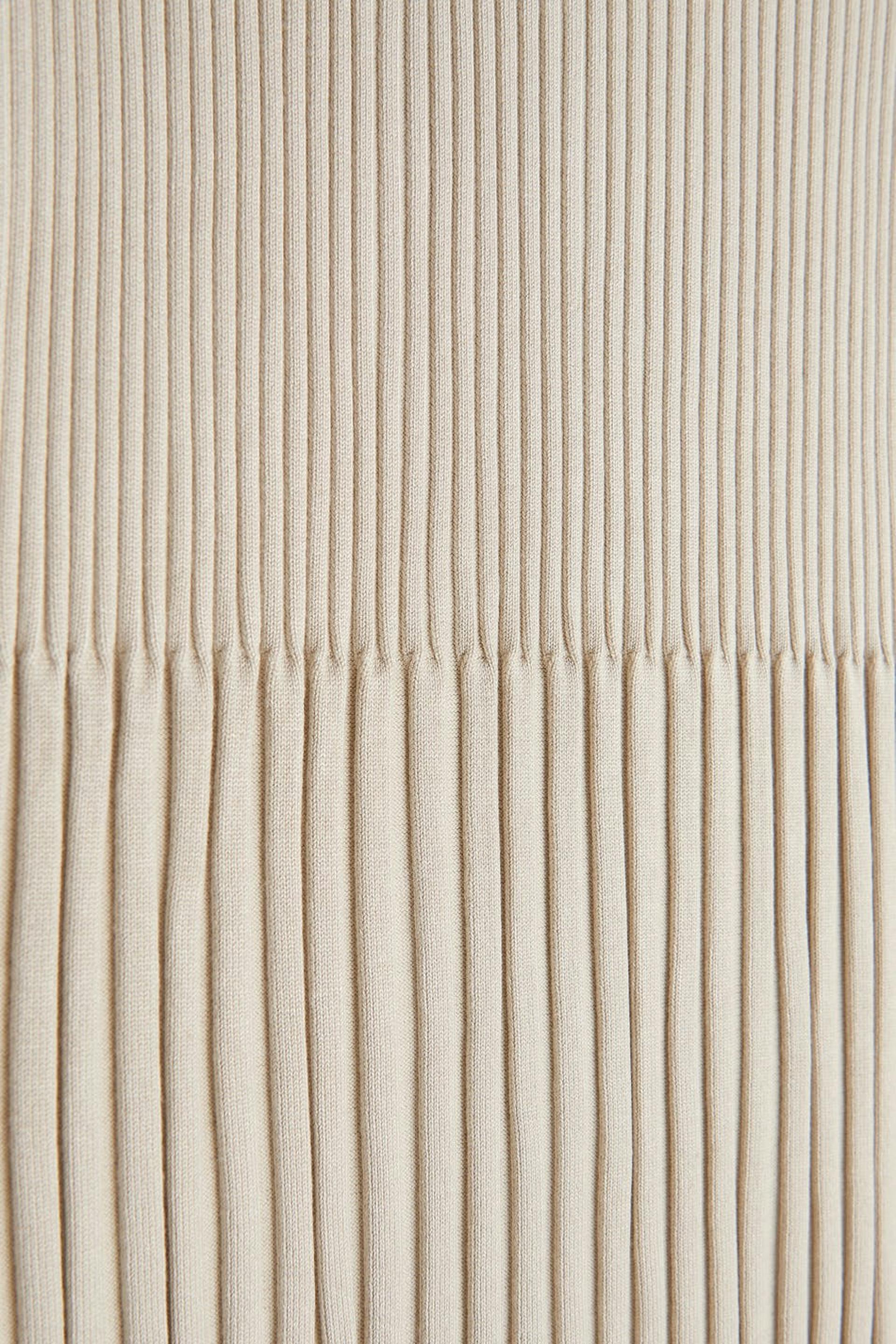 Lange rok met een geribbelde kwaliteit. De rok is beige, gebreid en flared. Het heeft een elastiek aan de taille en een midi-lengte.