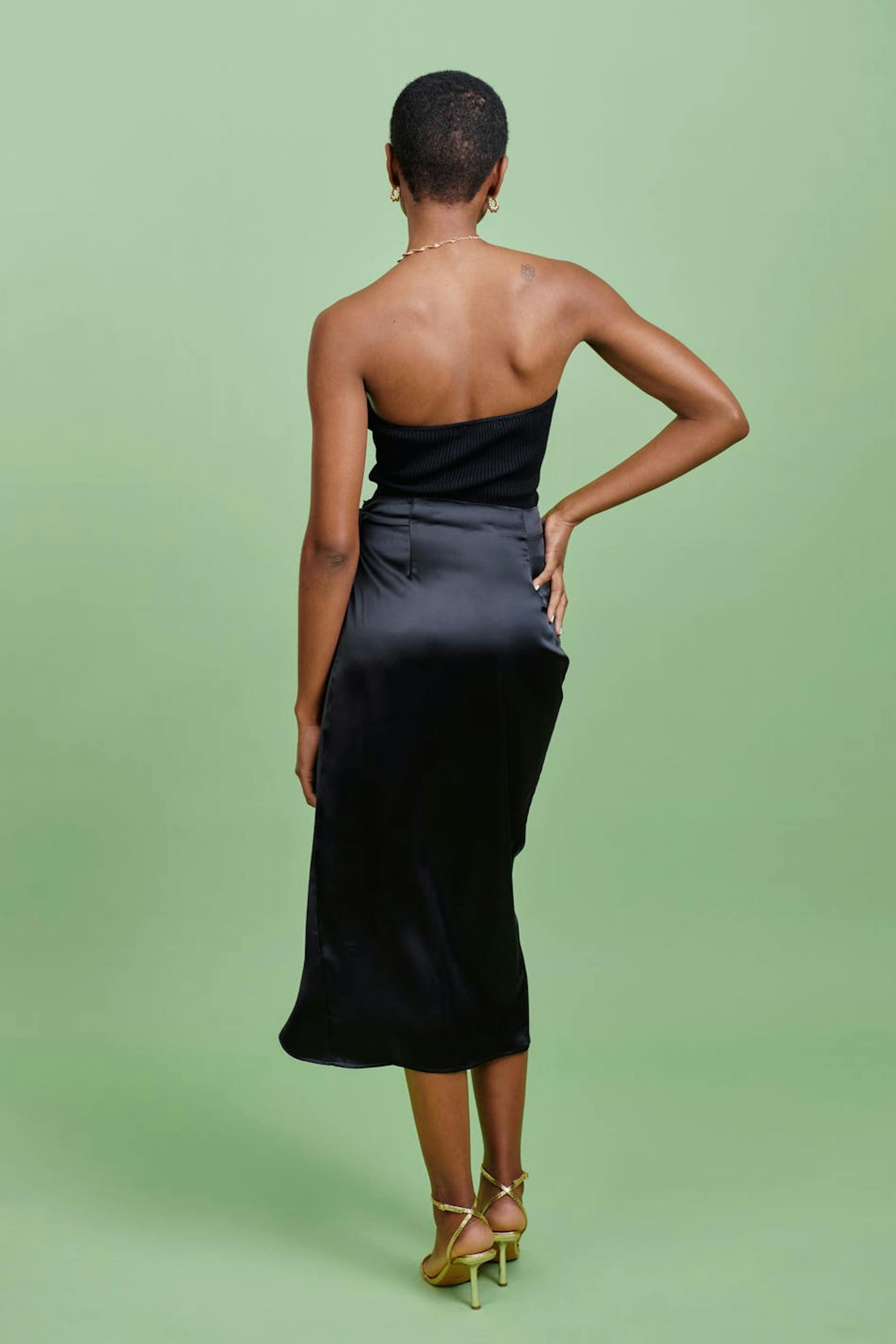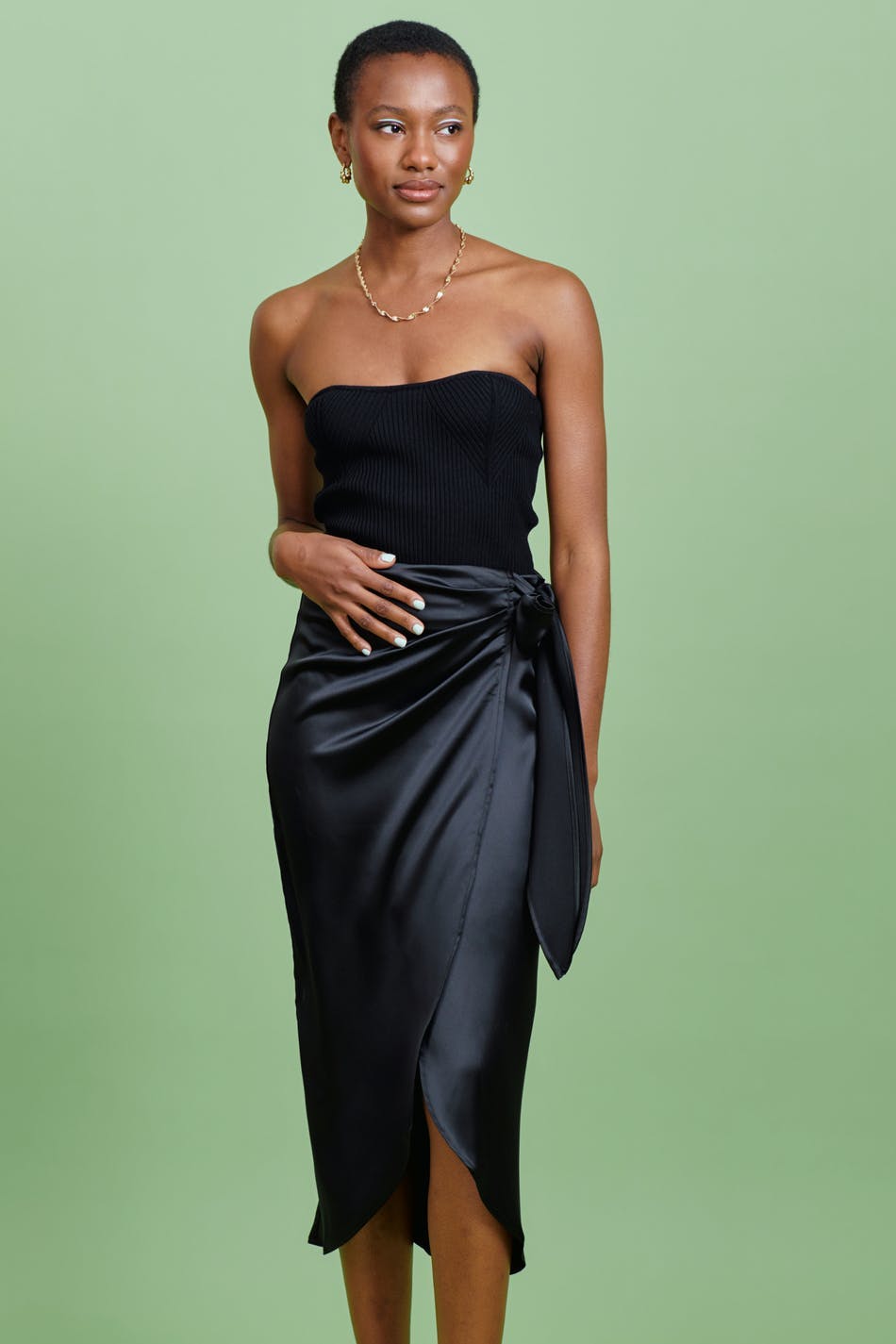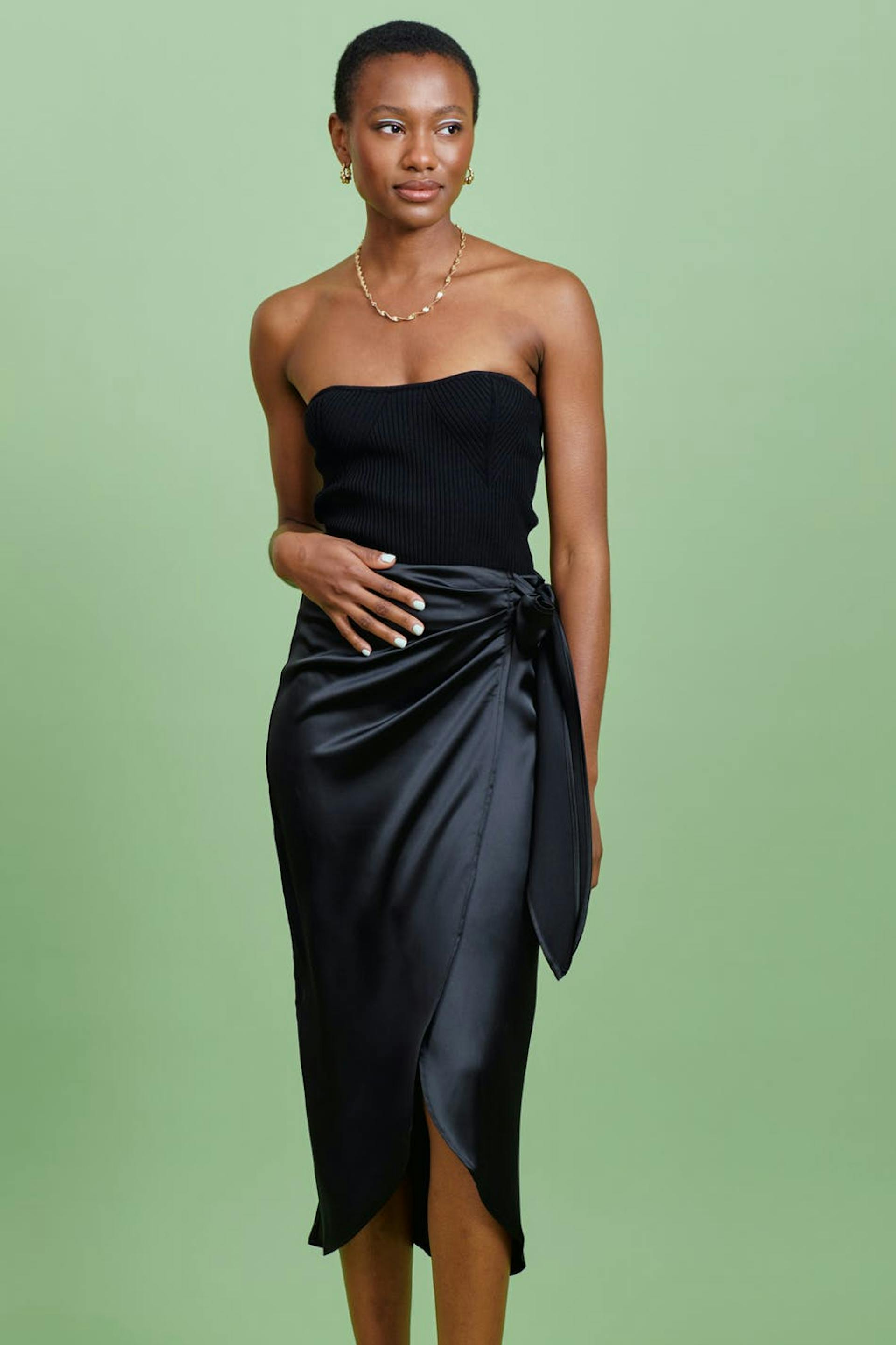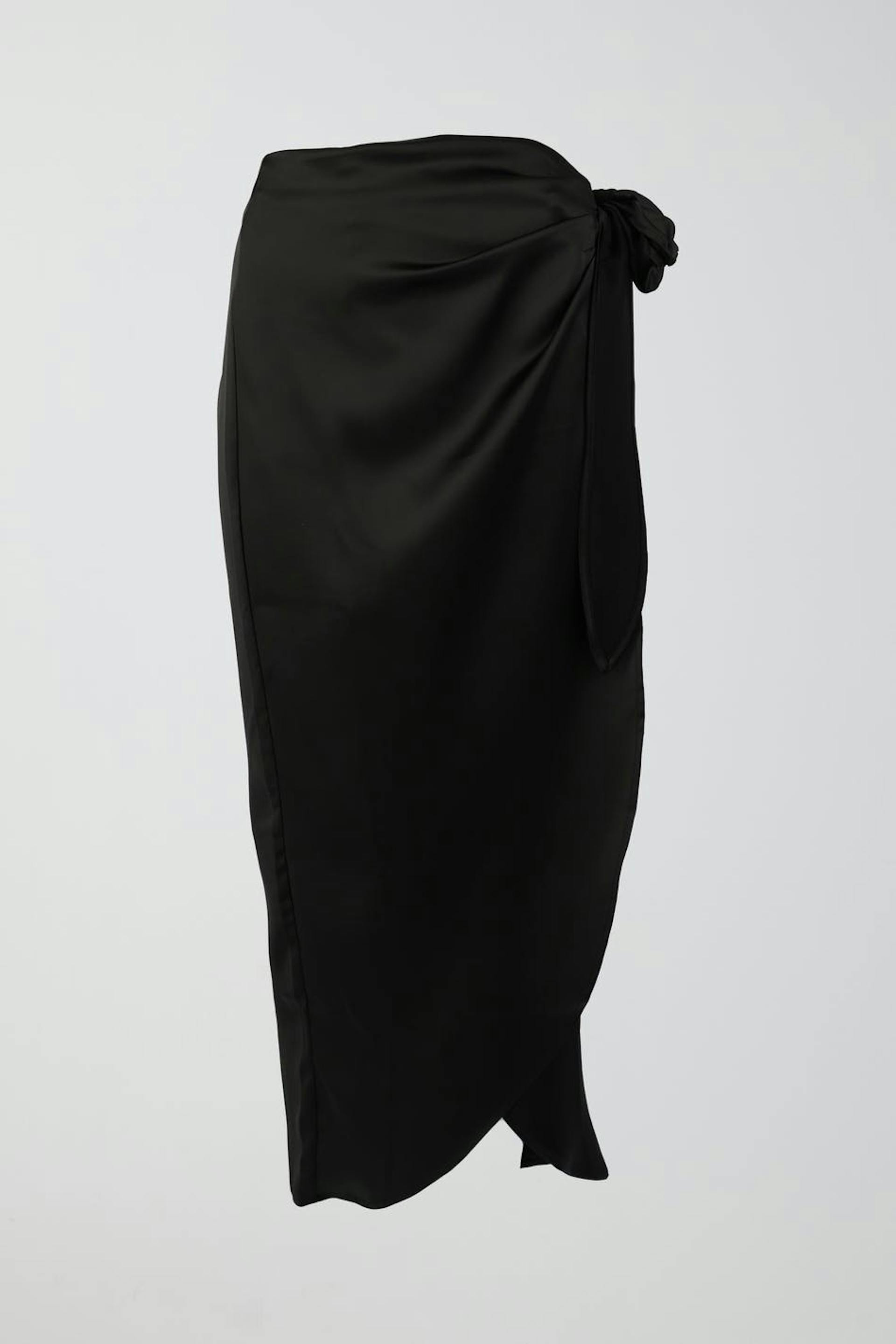 Wikkel rok van satijn met zelfbinder aan de zijkant. De rok is zwart en heeft plooien aan de voorkant.