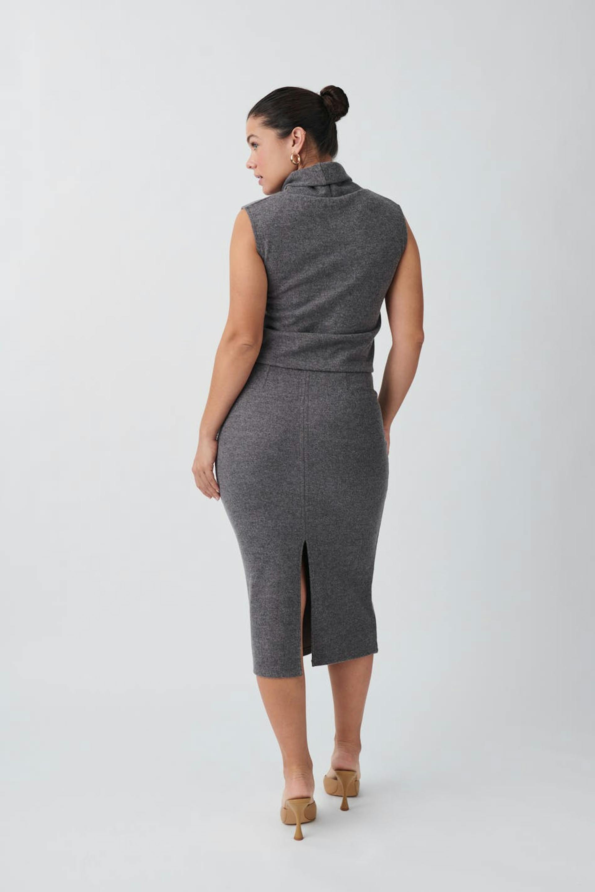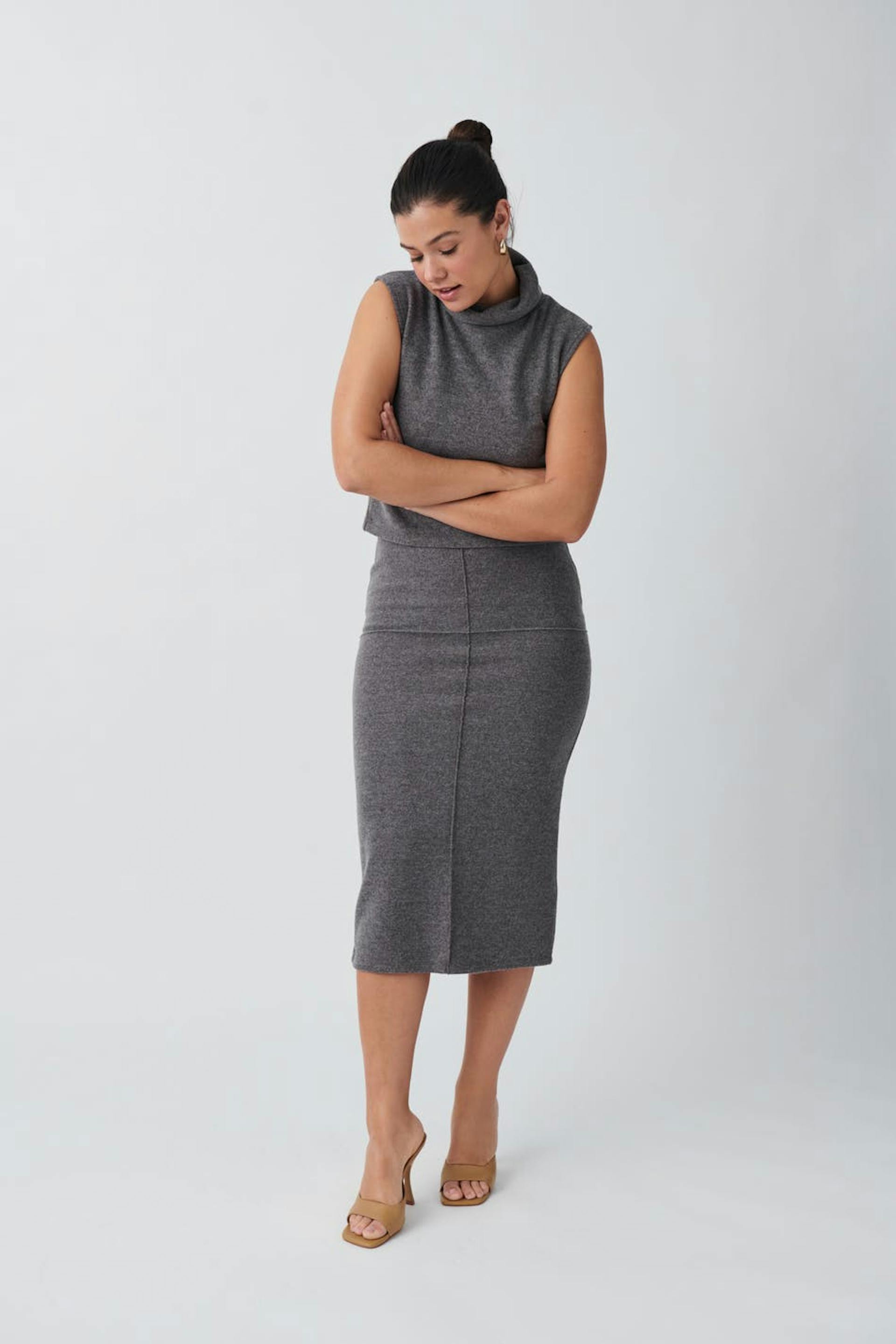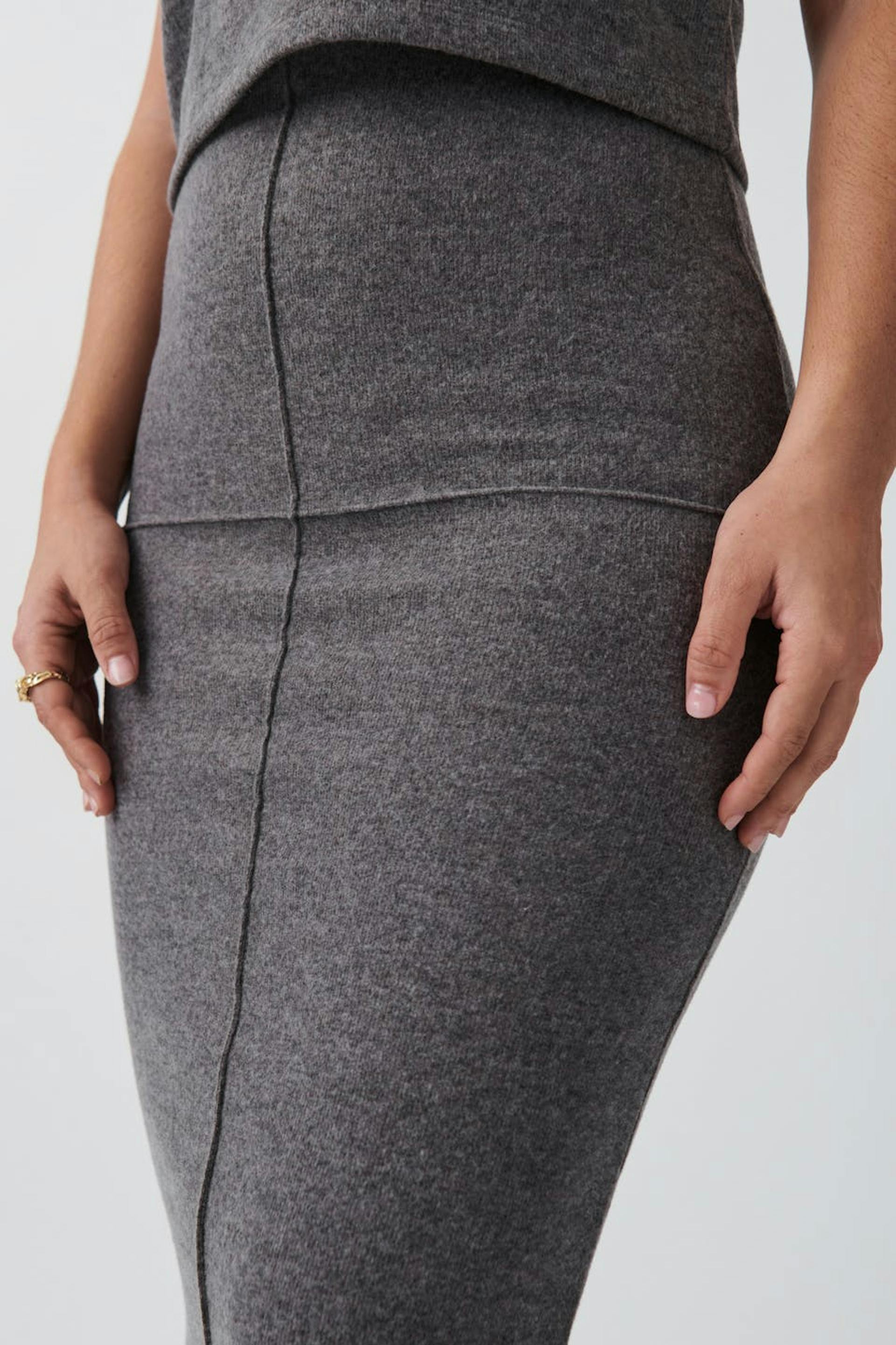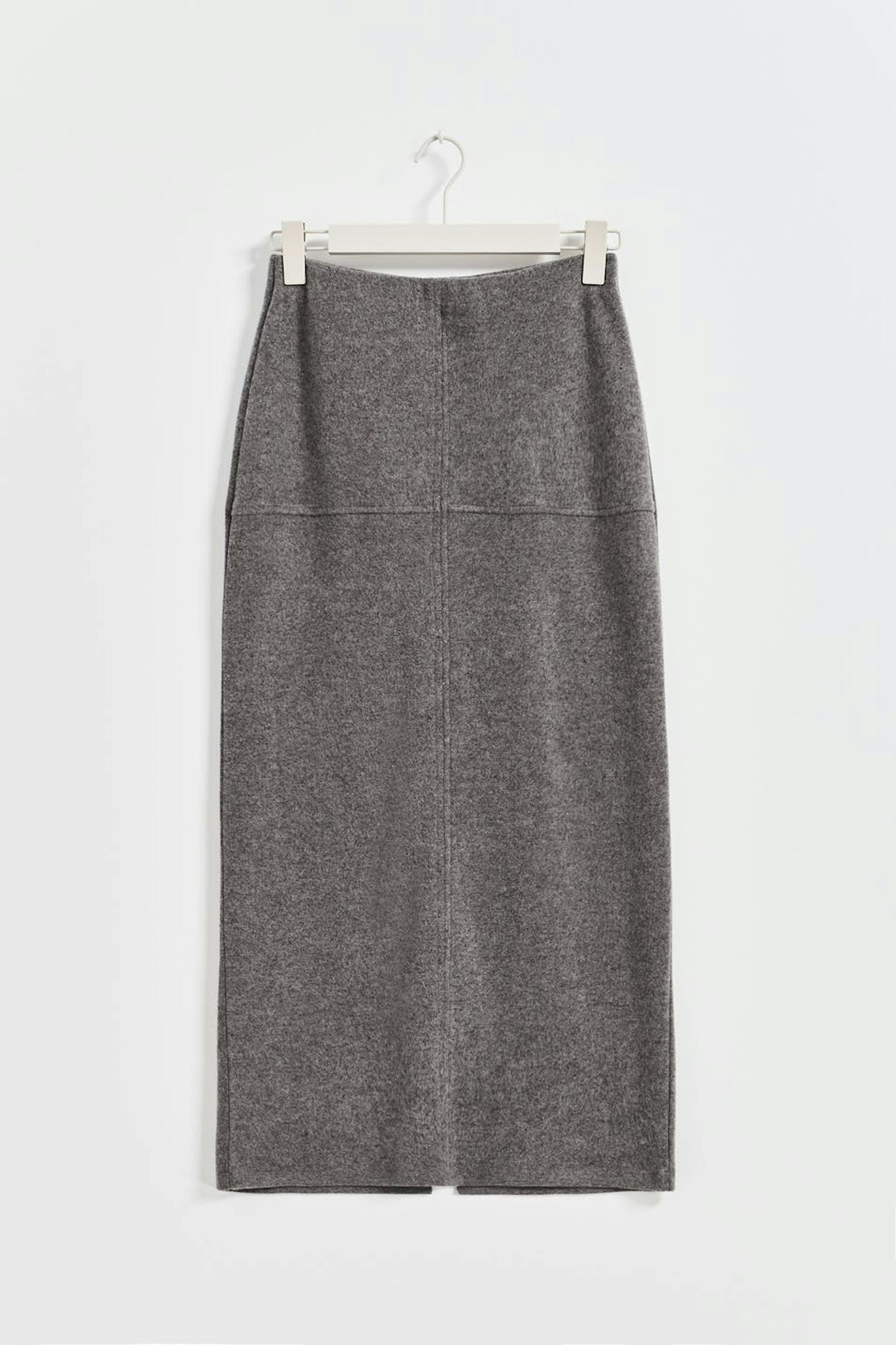 Rok met spleet op het achterpand. De rok is grijs en heeft zachte en geribbelde kwaliteit. Het heeft normale pasvorm en midden taille.