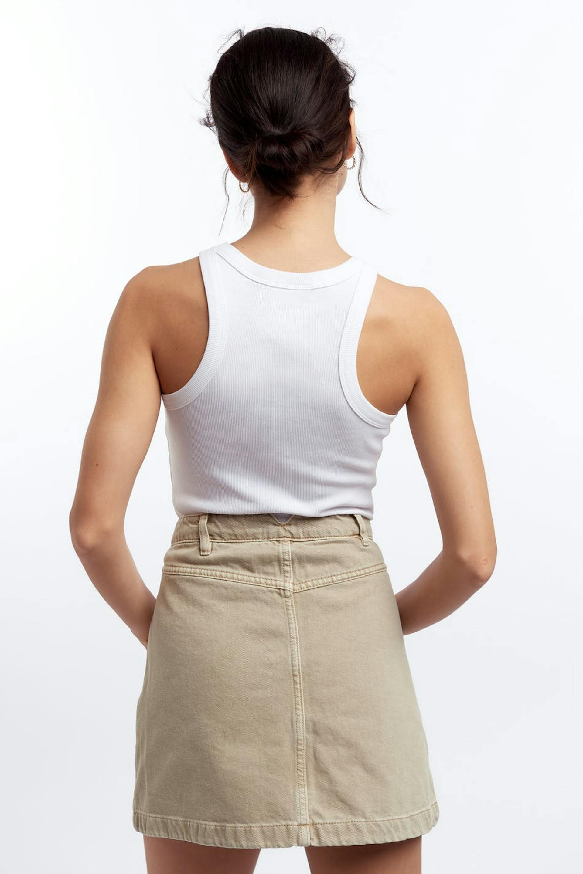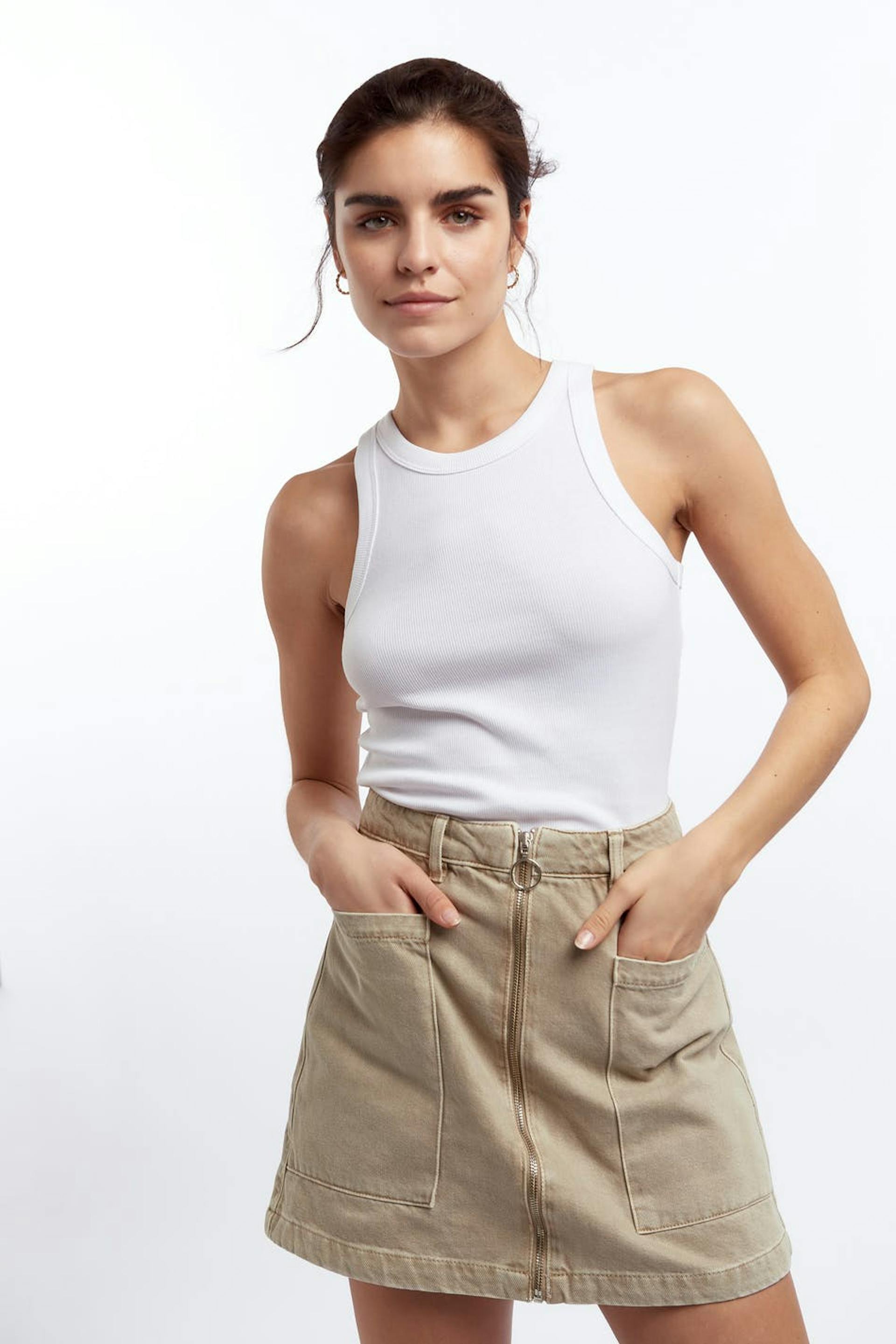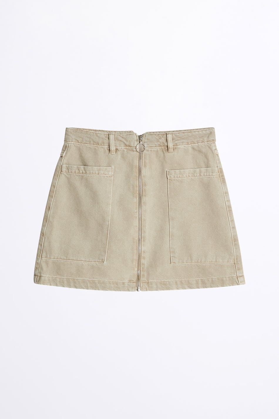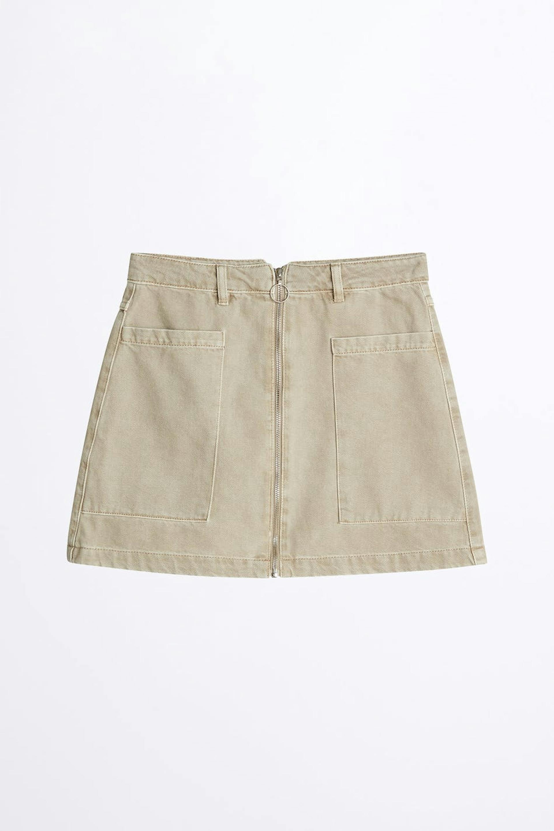 Rekvrije denim rok met een normale pasvorm. De rok is beige en kort en heeft een hoge taille. Het heeft grote zakken en een rits langs de voorzijde.