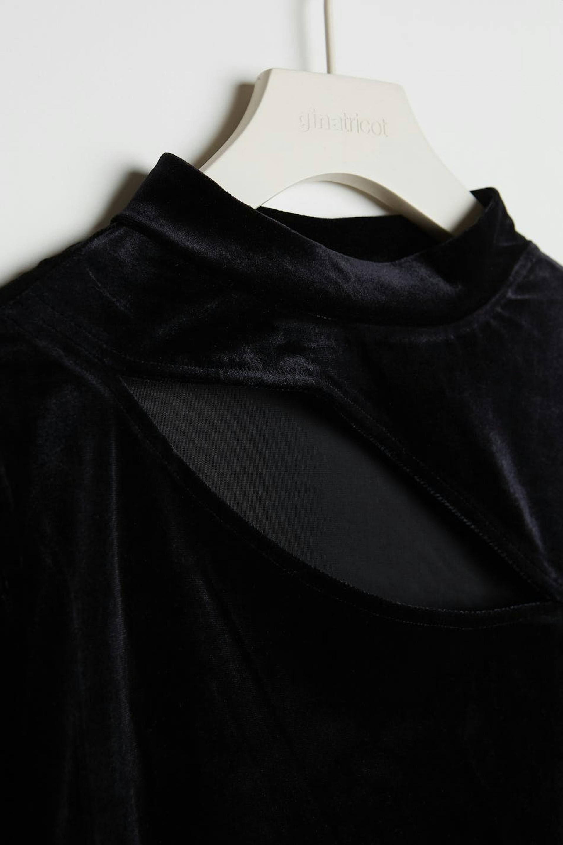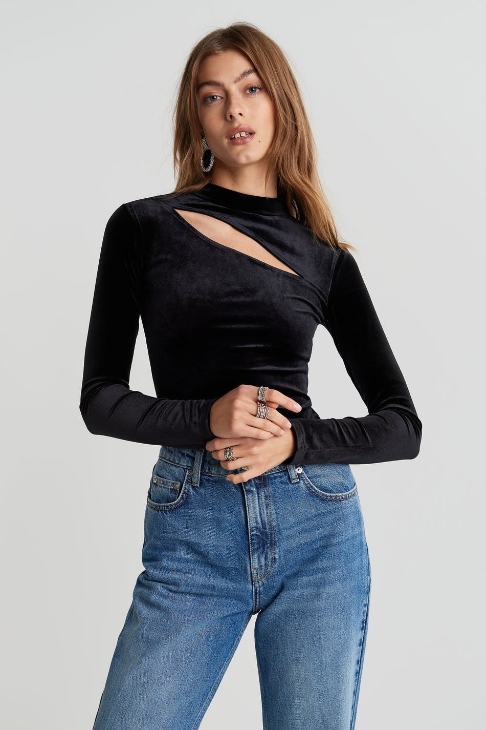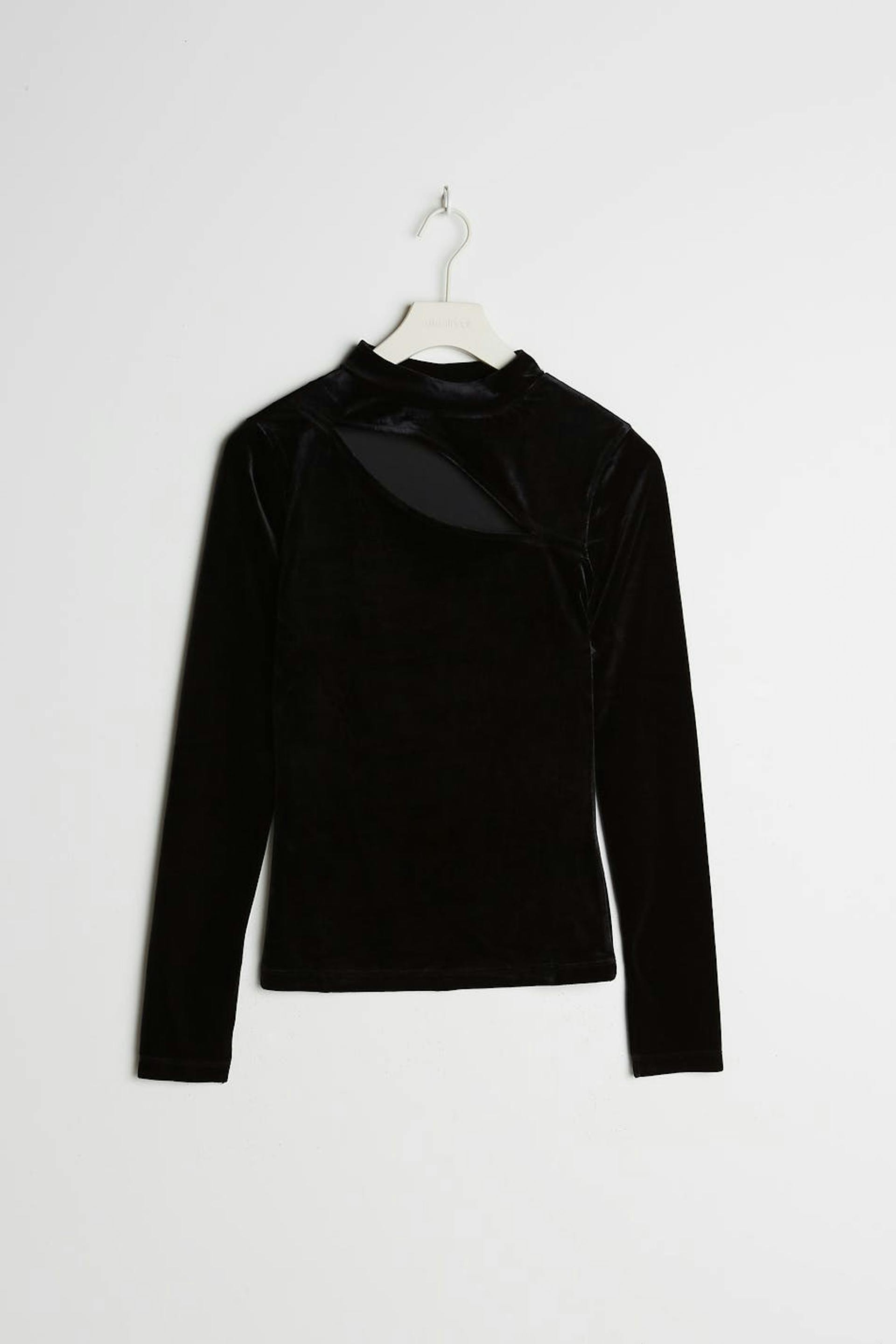 Top met lange mouwen en een fluweelachtig materiaal. De top is zwart en zacht en heeft een uitgesnedene detail boven de boezem. Het heeft een nauwsluitende pasvorm en een smalle split aan de uiteinden van de mouwen.