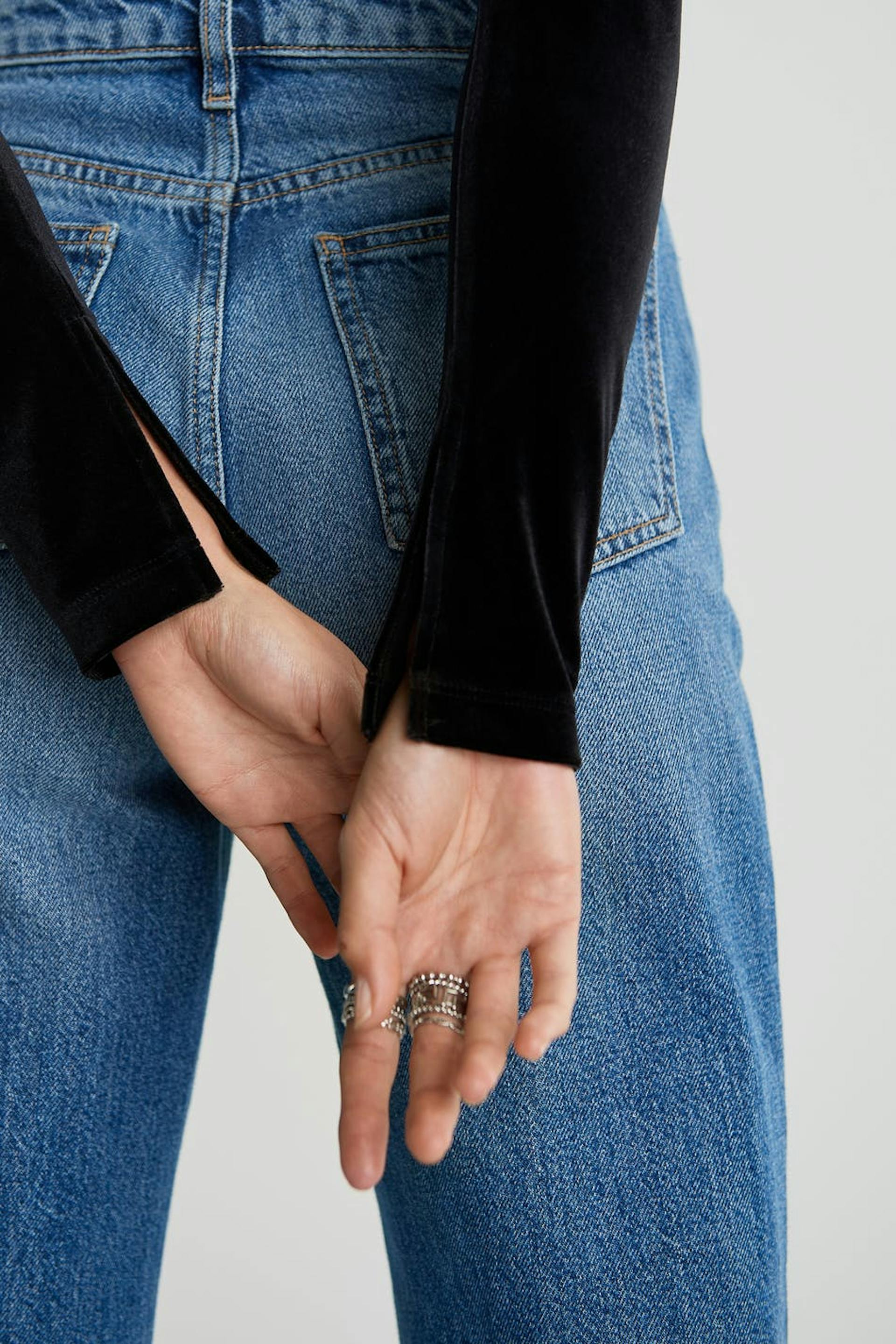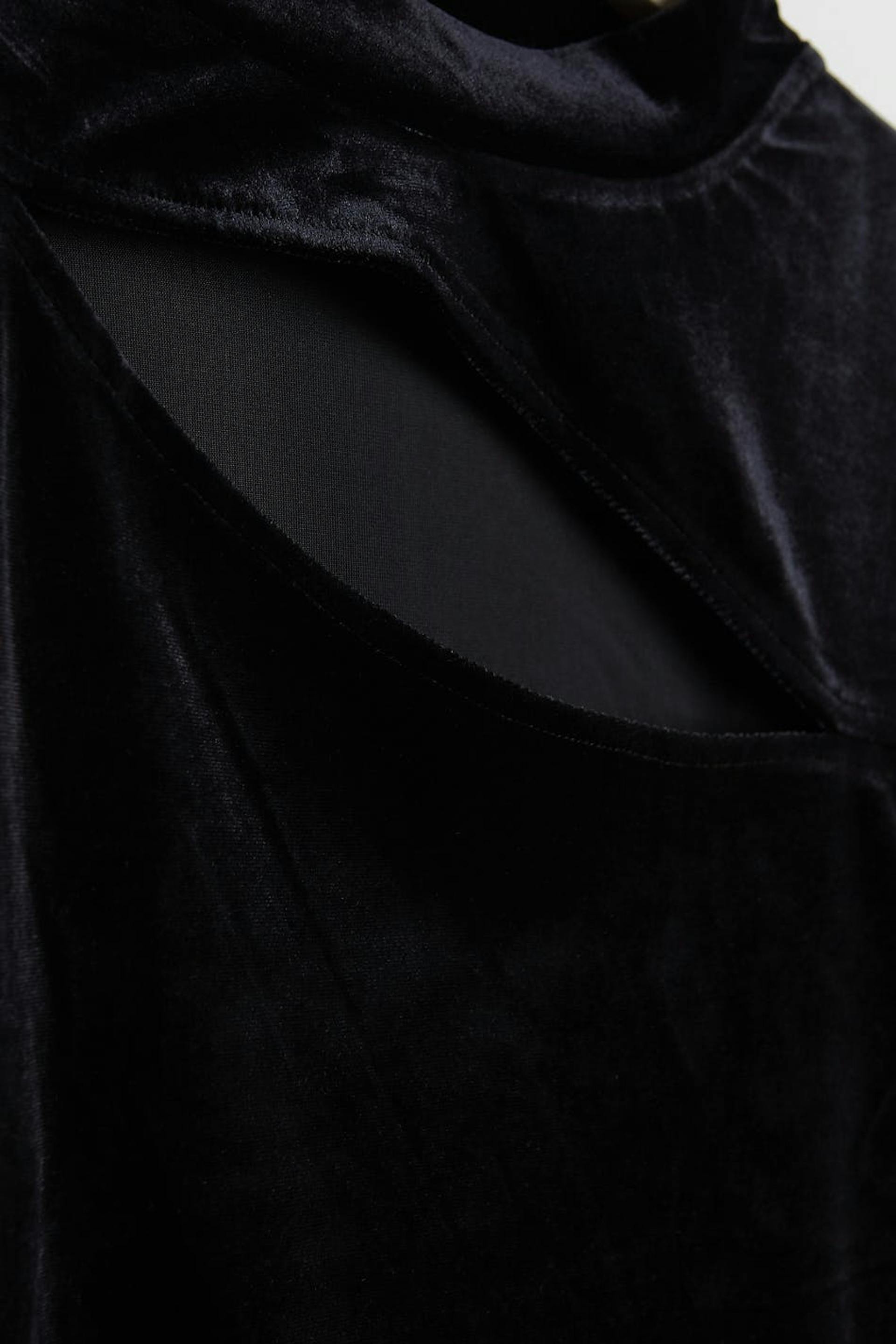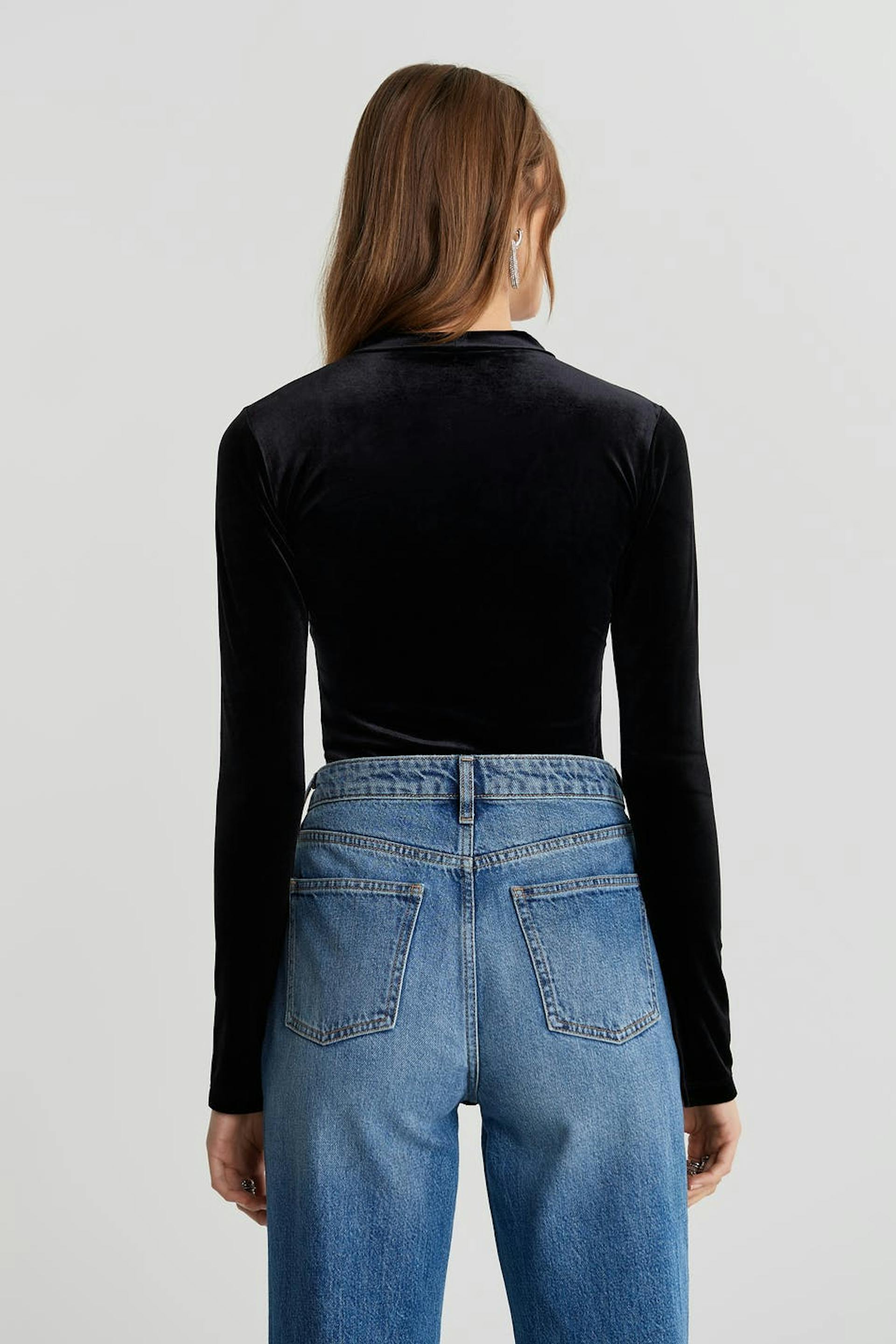 Top met lange mouwen en een fluweelachtig materiaal. De top is zwart en zacht en heeft een uitgesnedene detail boven de boezem. Het heeft een nauwsluitende pasvorm en een smalle split aan de uiteinden van de mouwen.