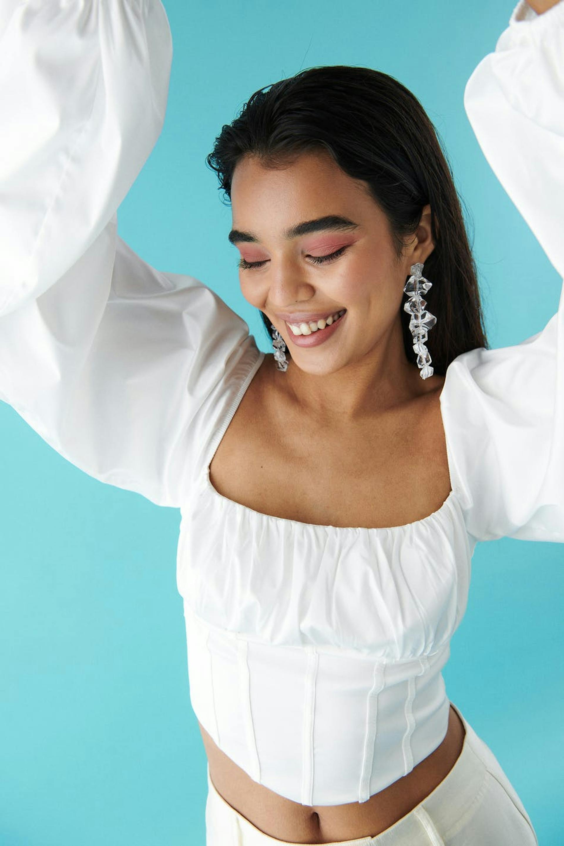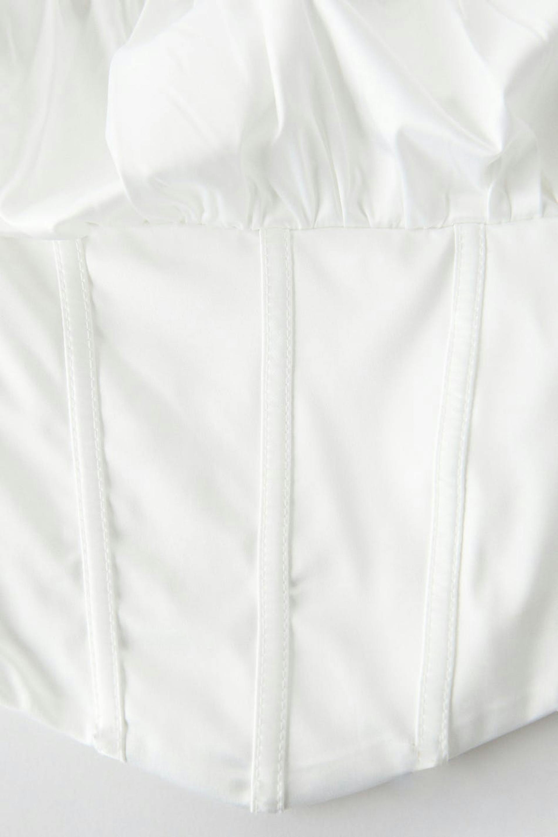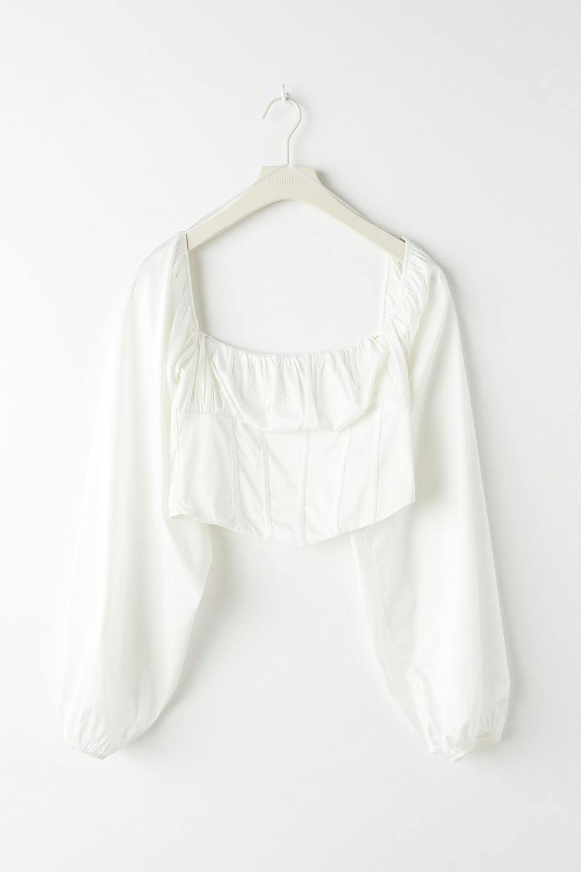 Topje met lange mouwen met buste met ruches. Het topje is wit en heeft smokwerk op de rug. Het heeft vierkante halslijn, elastische manchettes en een afgesneden lengte.