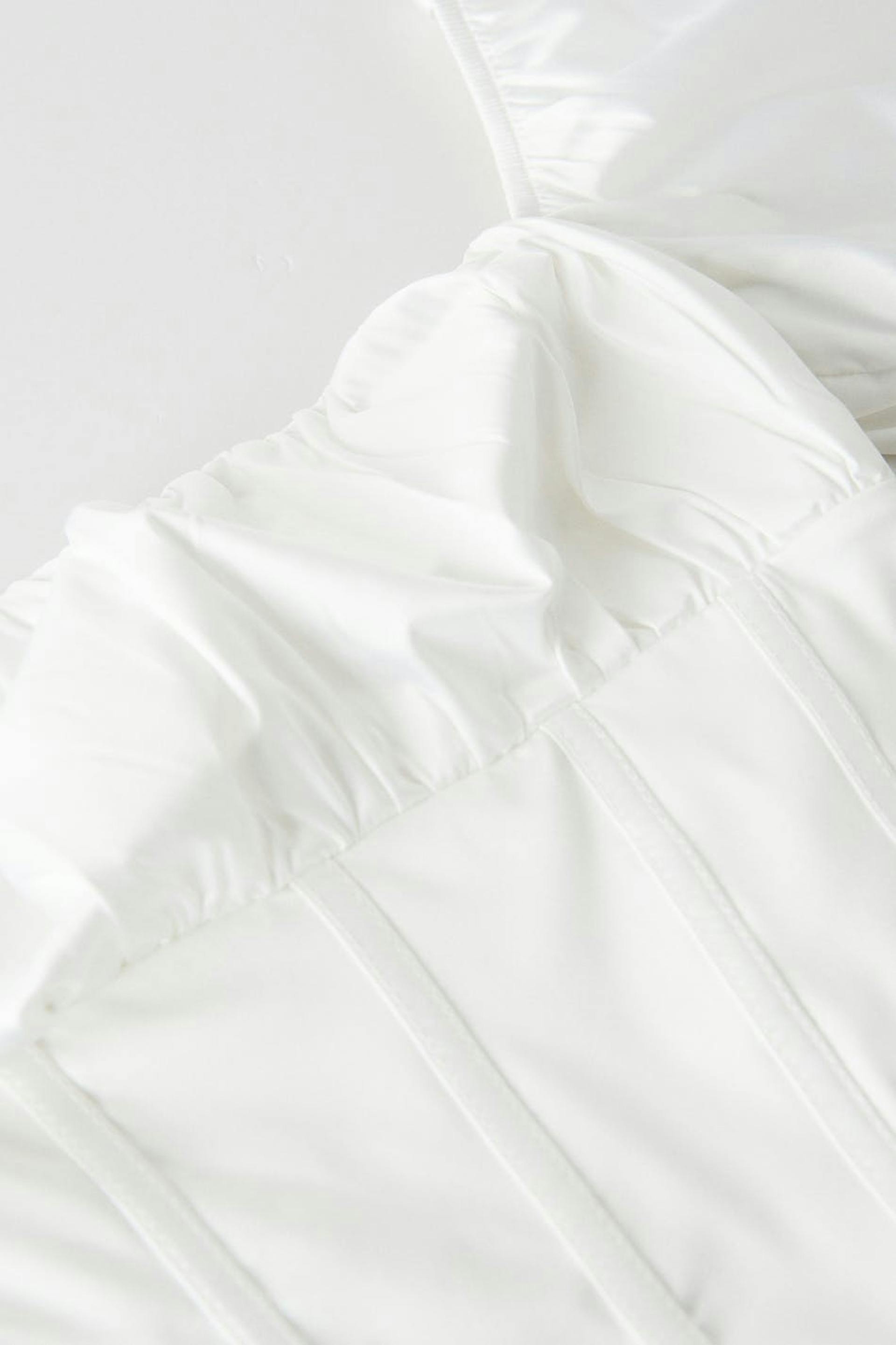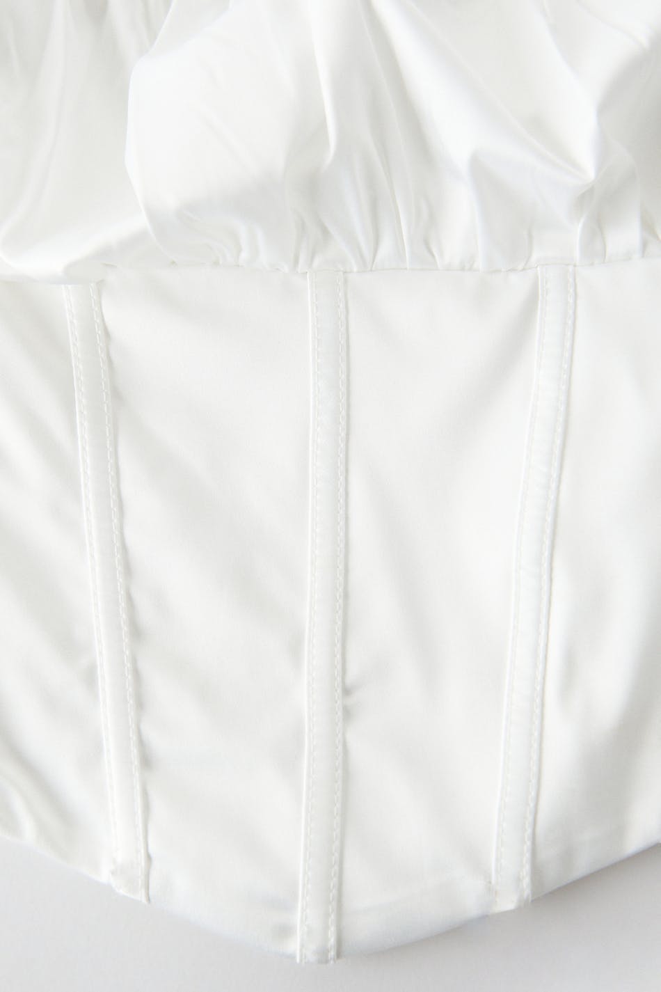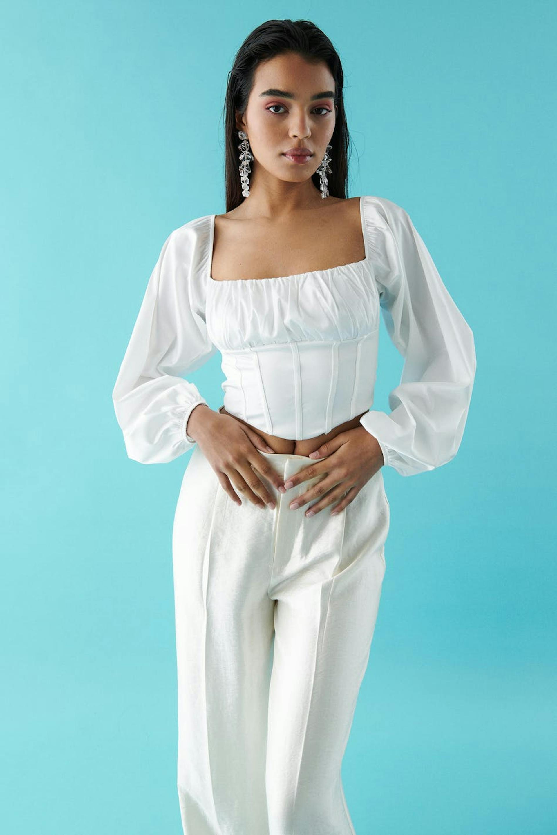 Topje met lange mouwen met buste met ruches. Het topje is wit en heeft smokwerk op de rug. Het heeft vierkante halslijn, elastische manchettes en een afgesneden lengte.