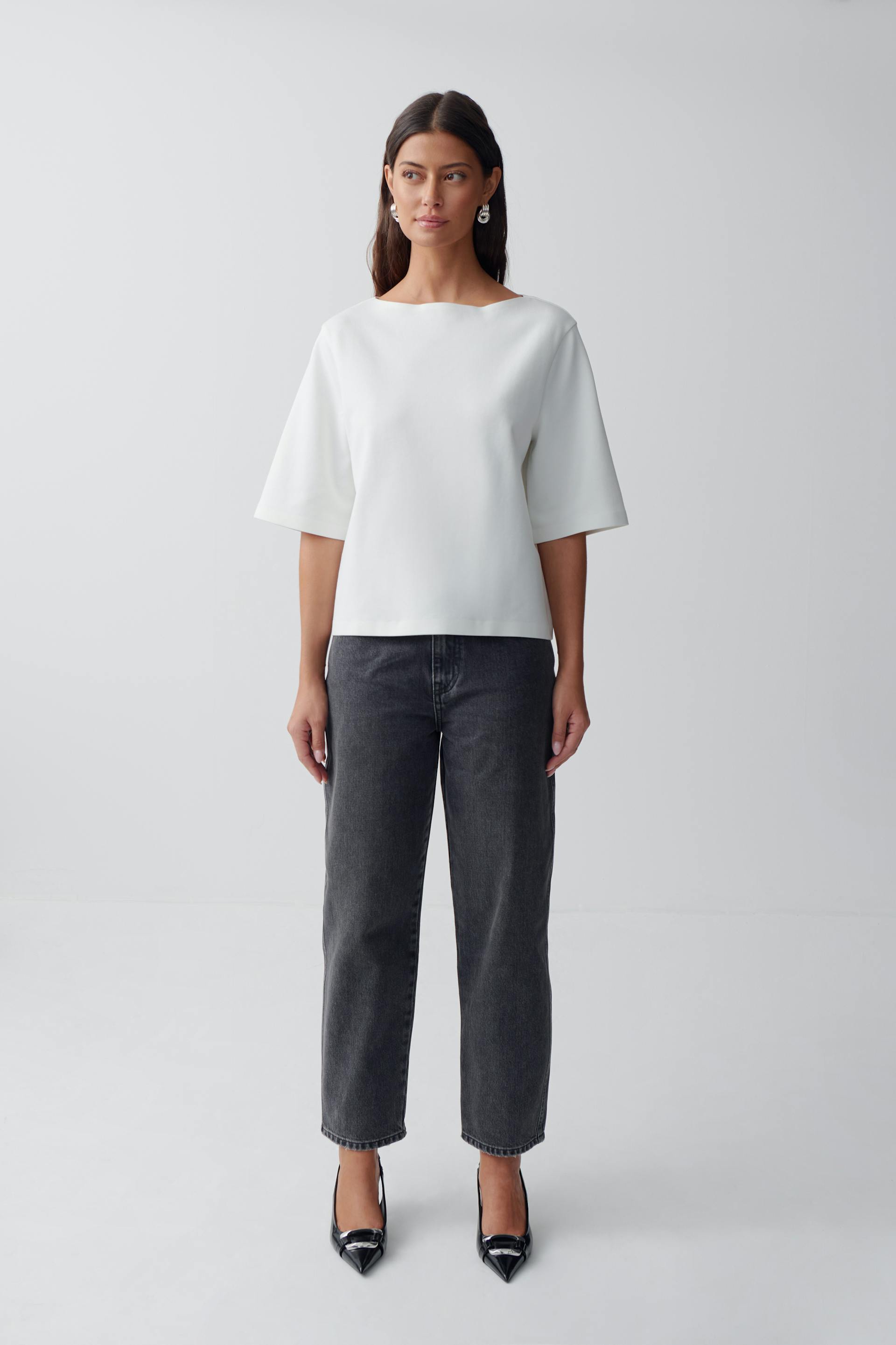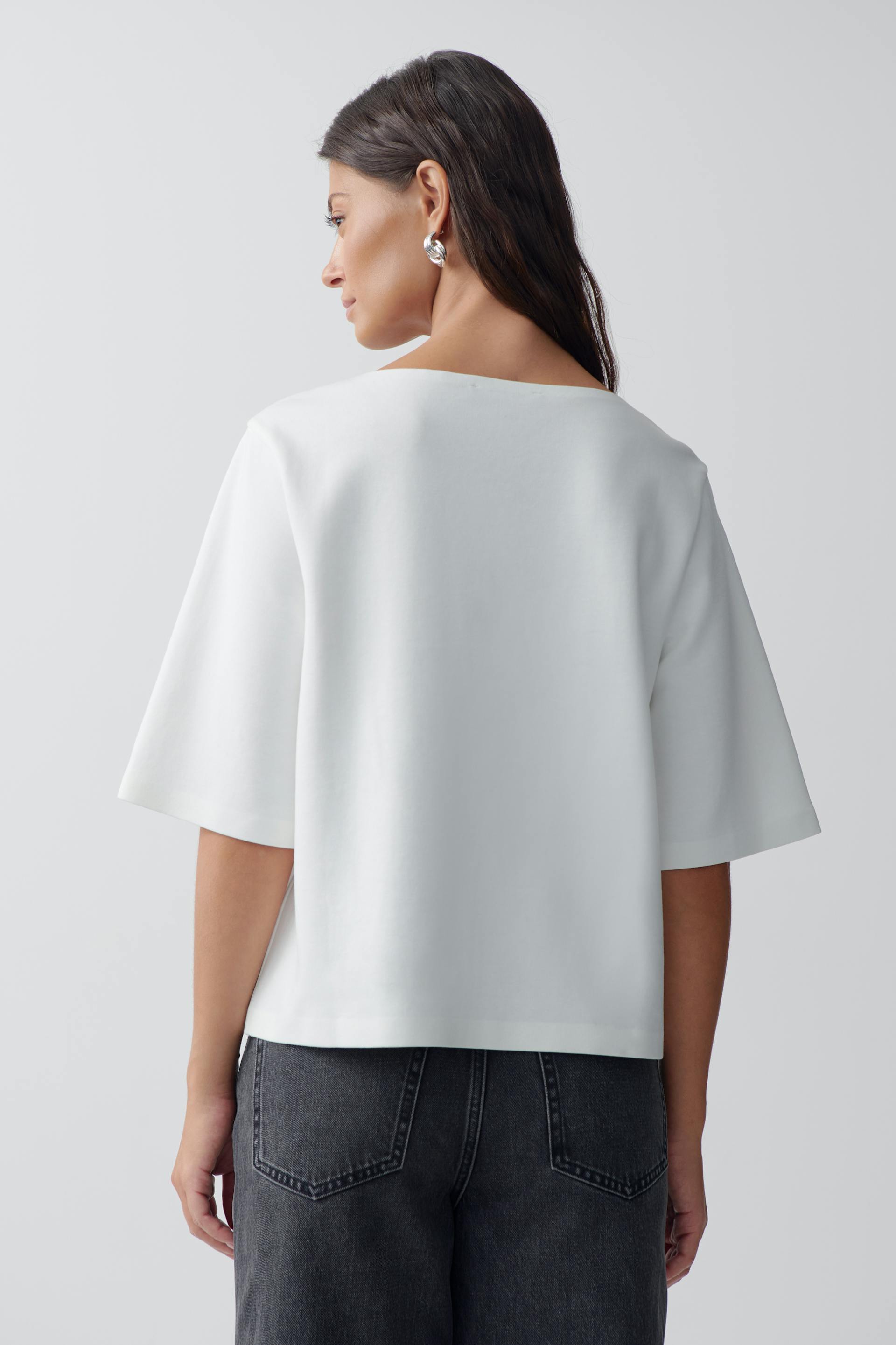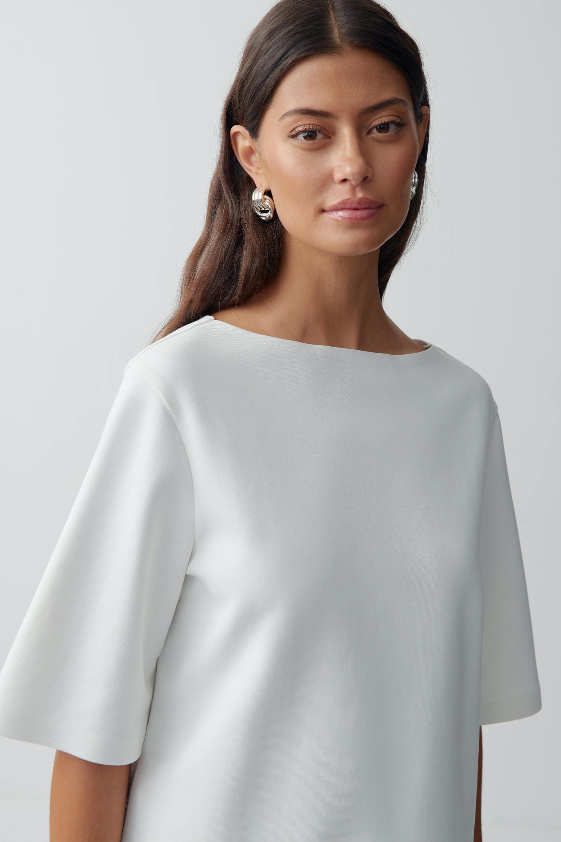 Bovenstuk met korte mouwen met boot halslijn. Het topje is wit en heeft overmaatse pasvorm. Het kledingstuk is gemaakt met Tex2Tex™, een textiel-naar-textiel polyesterrecyclingtechnologie die textielafval omzet in nieuwe vezels, garens en stoffen.