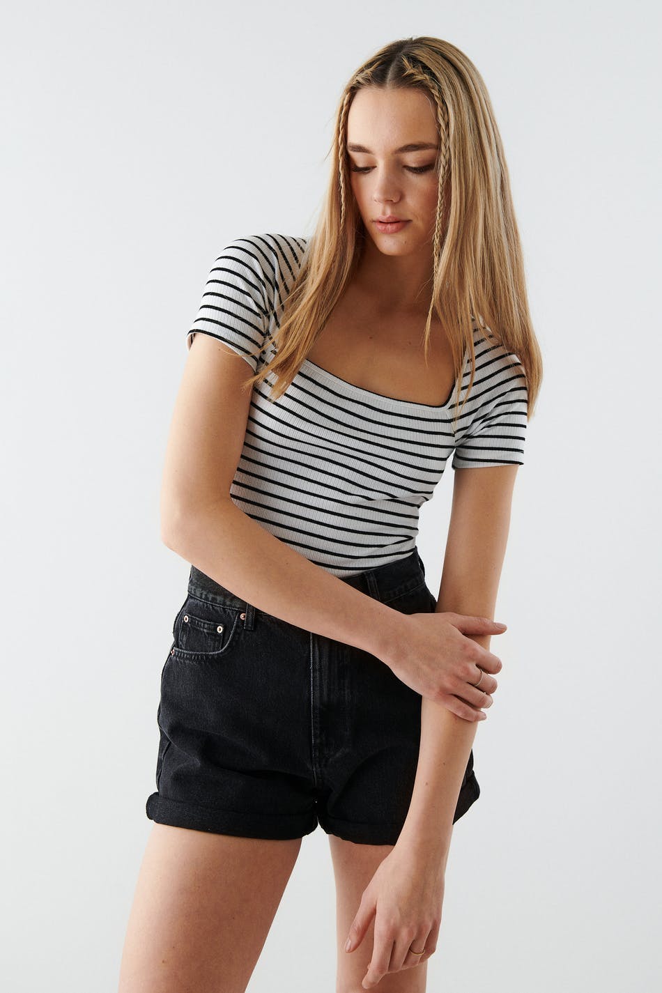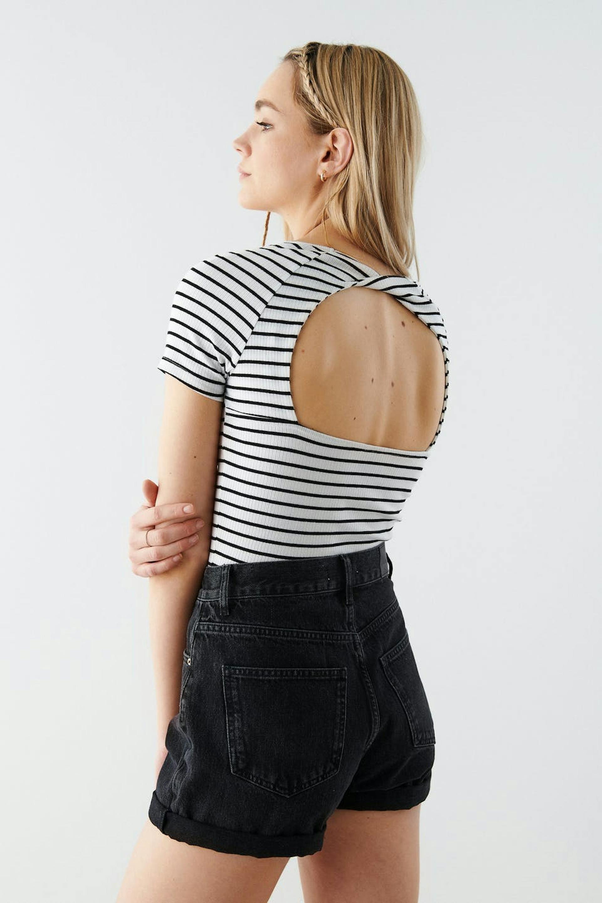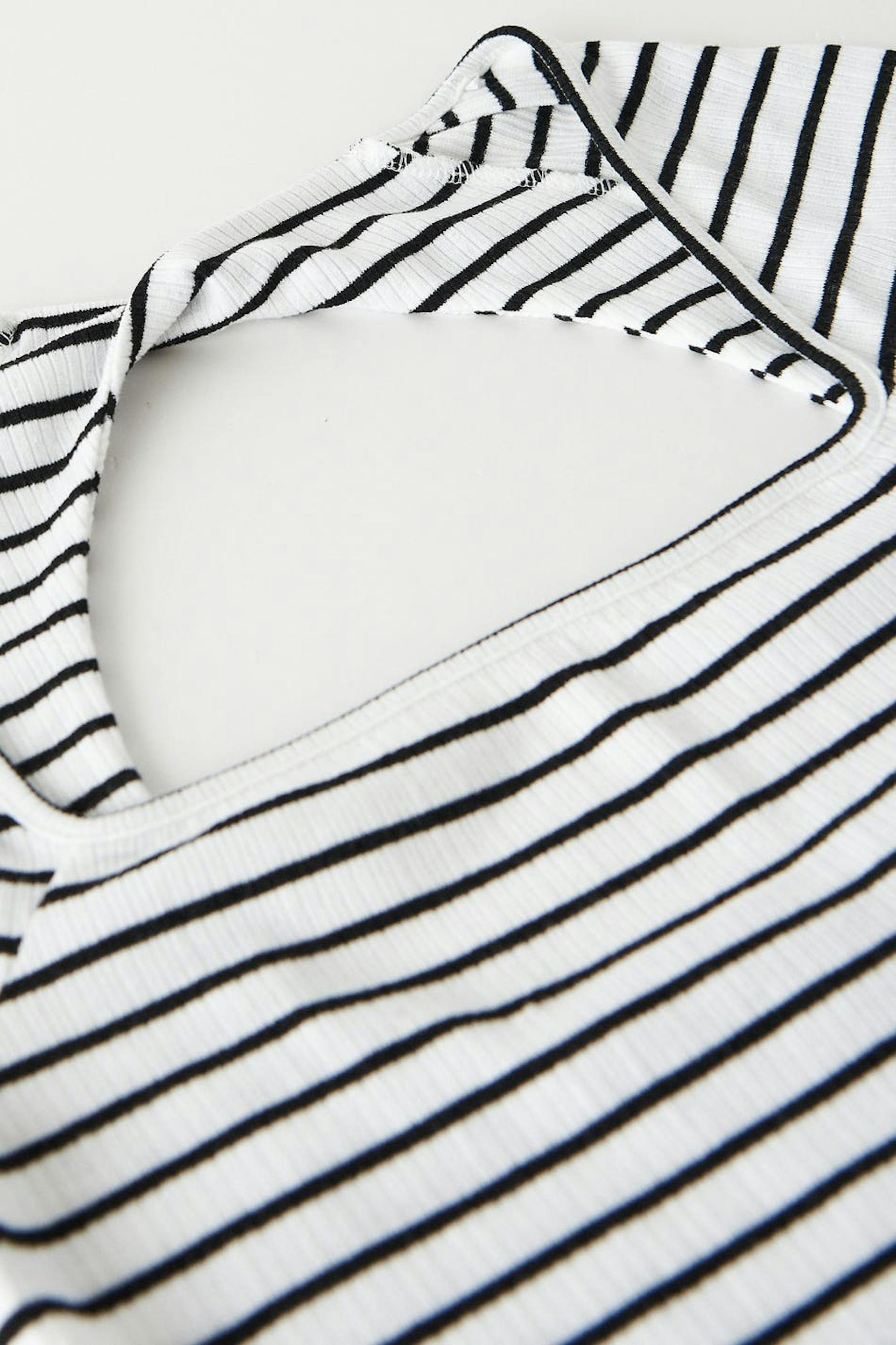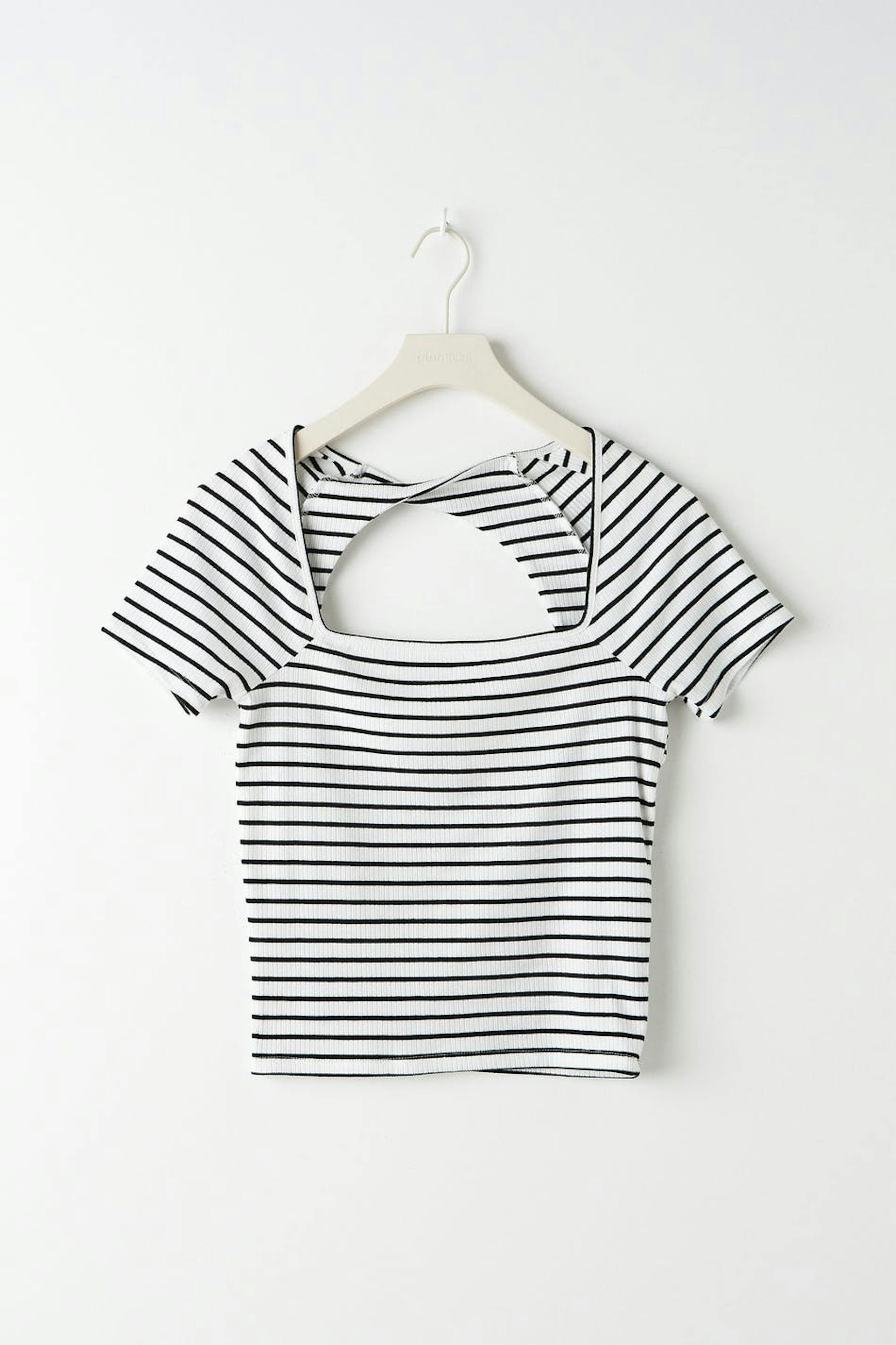 Gestreept topje van tricot met vierkante halslijn aan de voorkant. Het topje is wit, met korte mouwen en geribbeld. Het heeft blote rug ontwerp met een gedraaid detail.