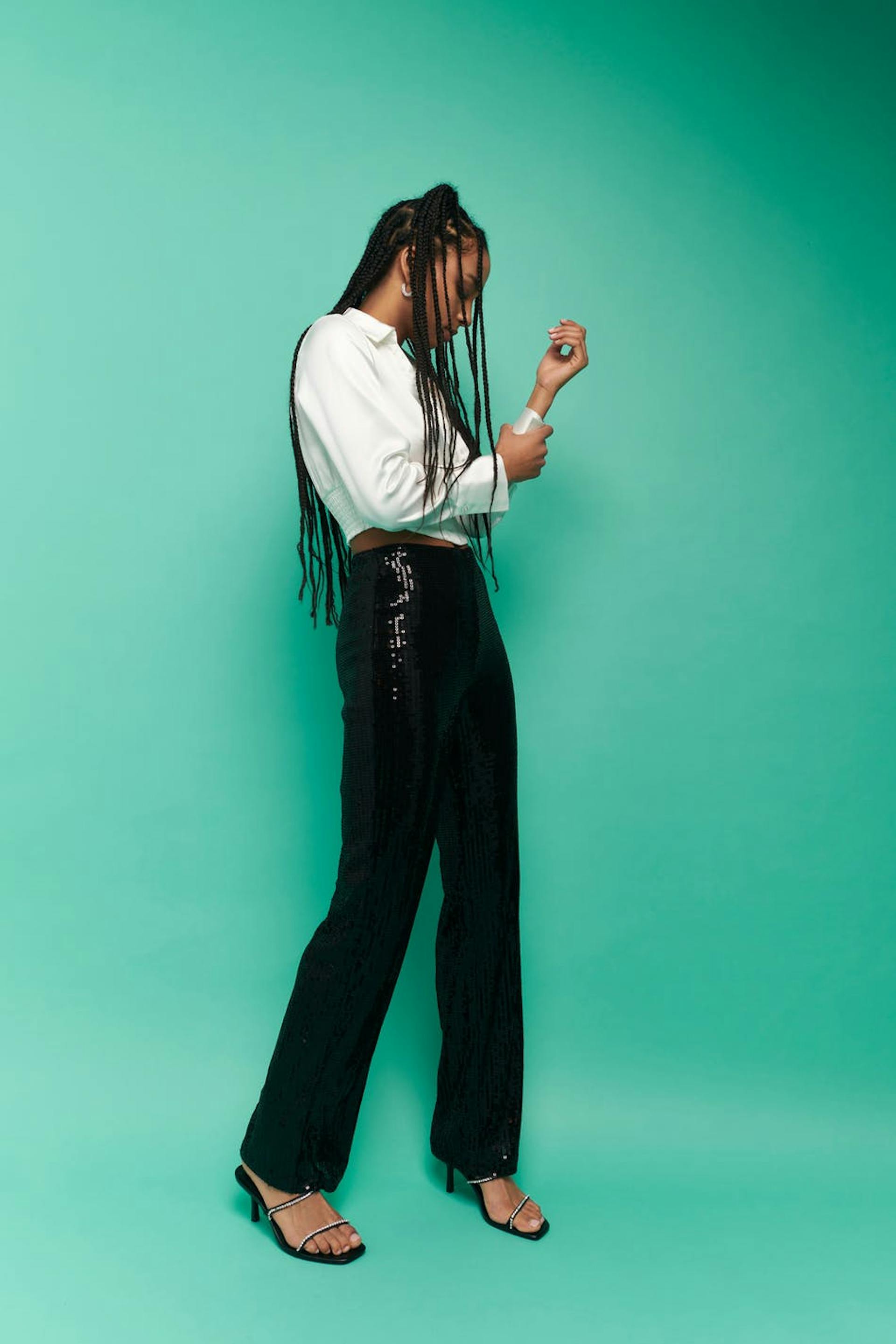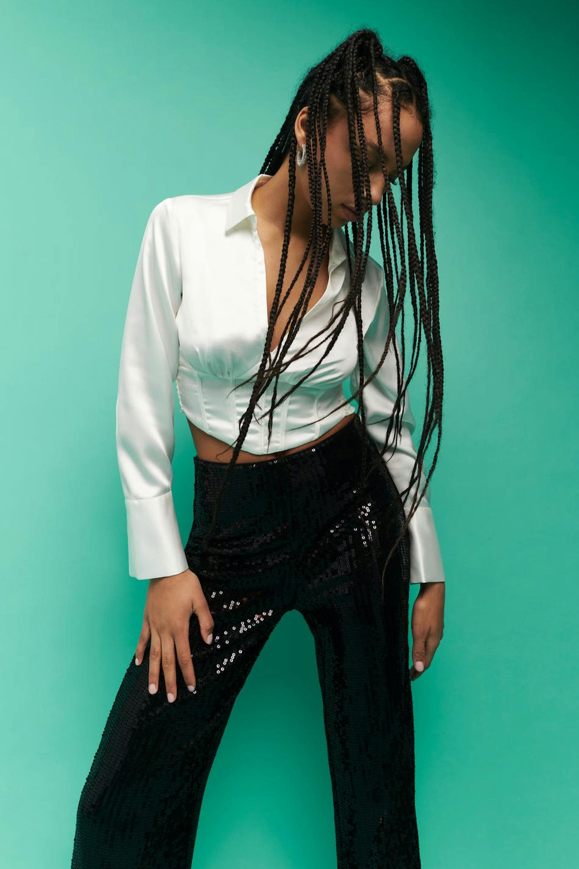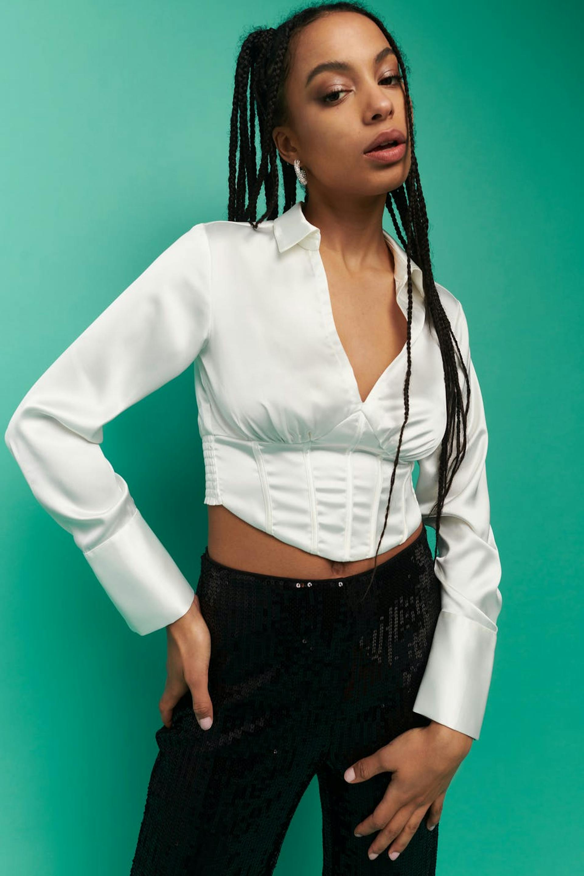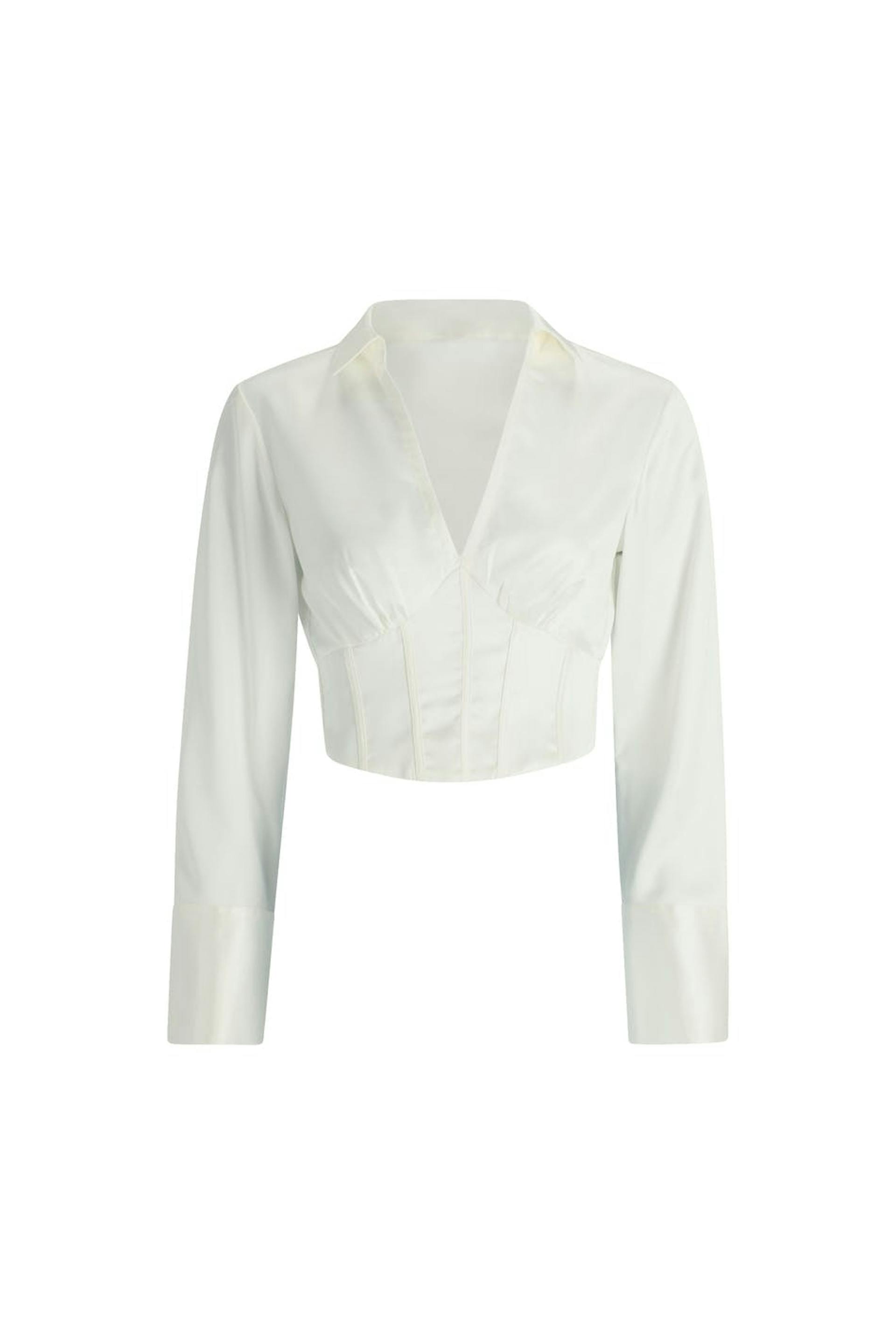 Korset topje met lange mouwen van satijn met diepuitgesneden halslijn. Het topje is wit en heeft kraag. Het heeft smokwerk op de rug, vergaringen onder de boezem en rechte mouw met knop en manchet.