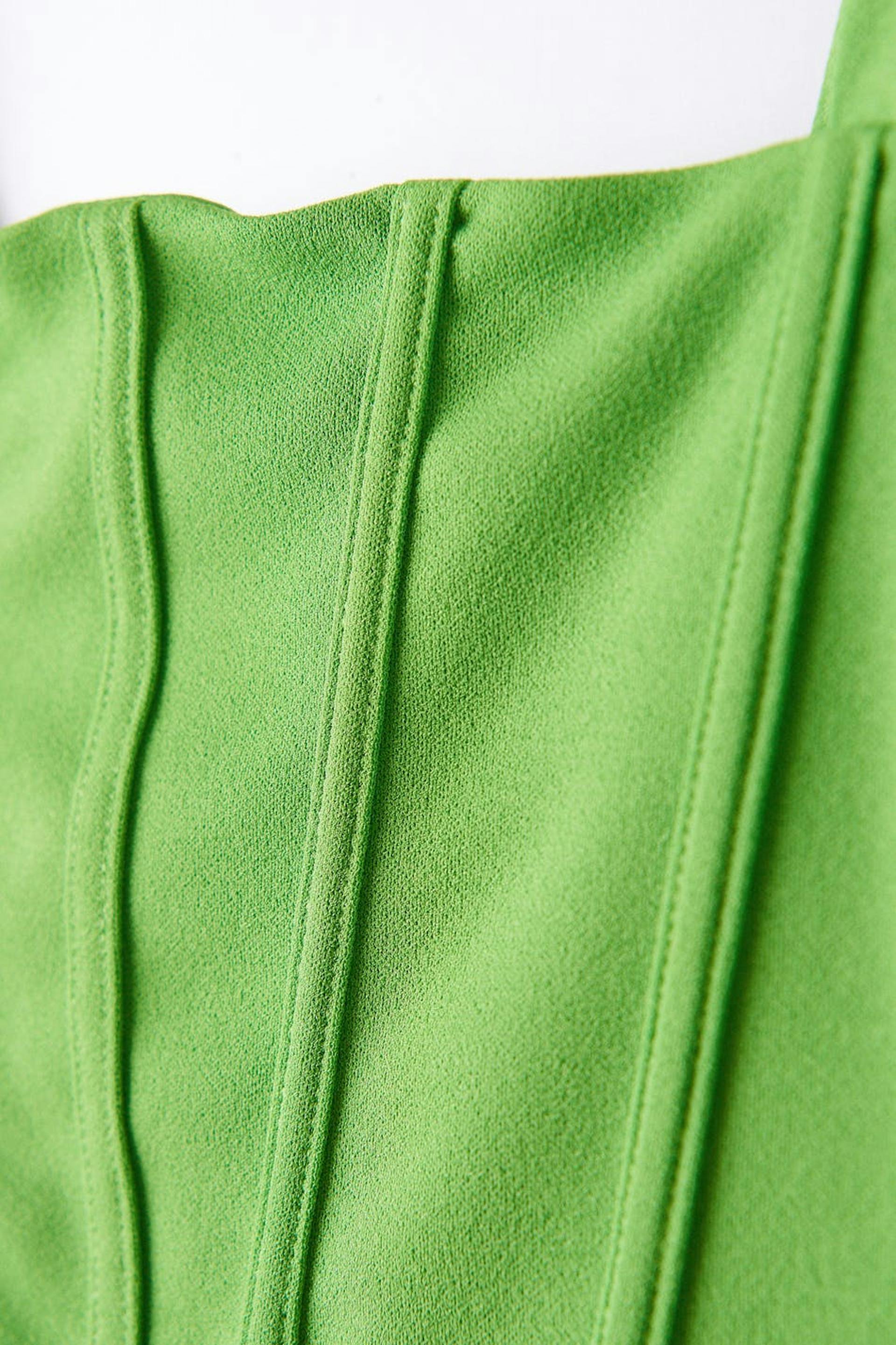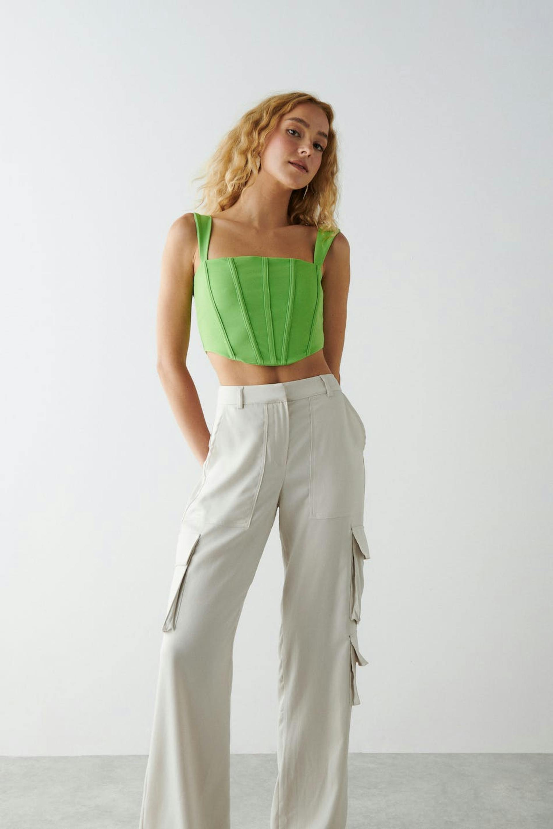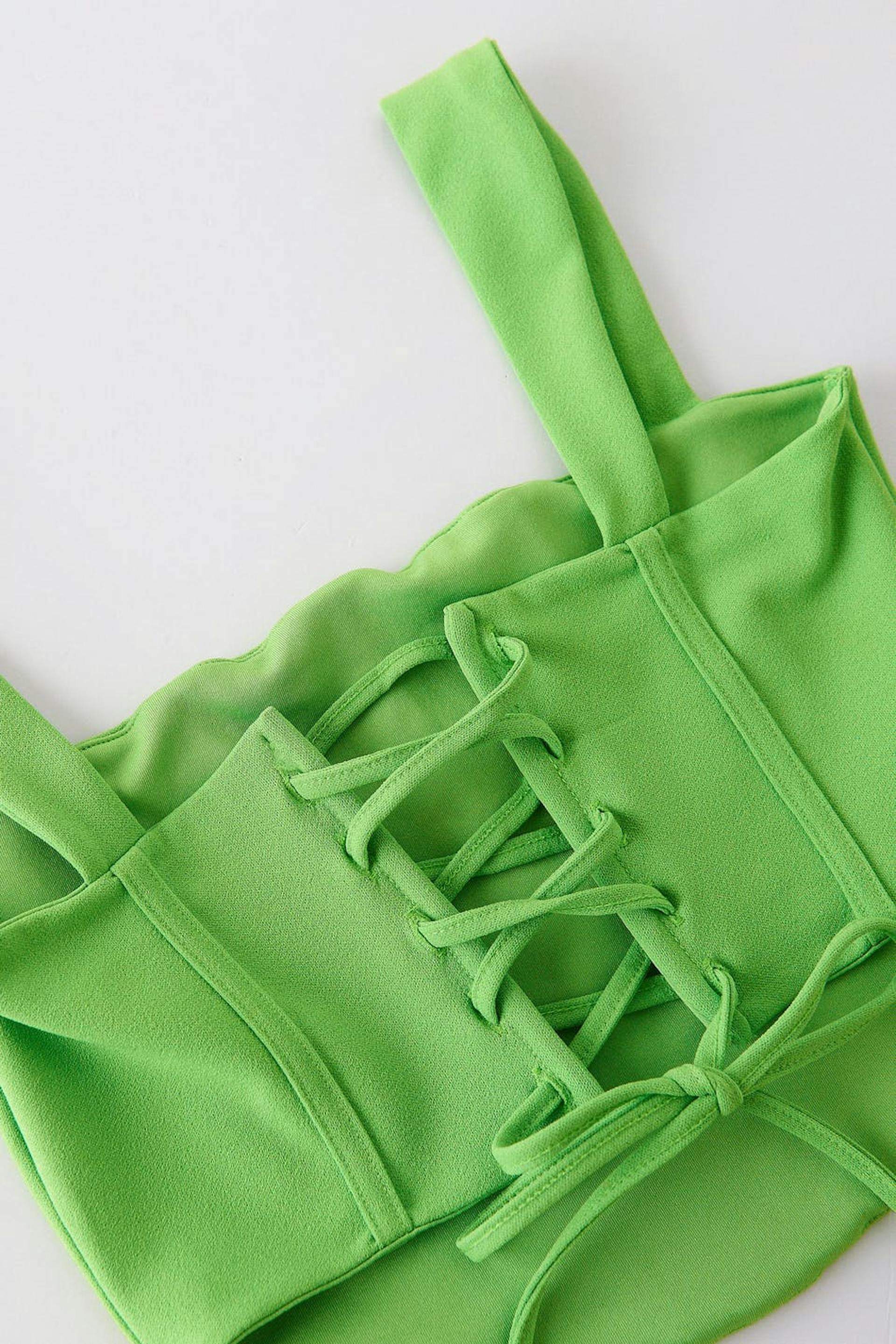 Korset topje met veter achter. Het topje is groen en heeft wijde schouderriemen. Het heeft een afgesneden lengte met een stretchstof en baleinen aan de voor- en achterzijde voor bijkomende ondersteuning.