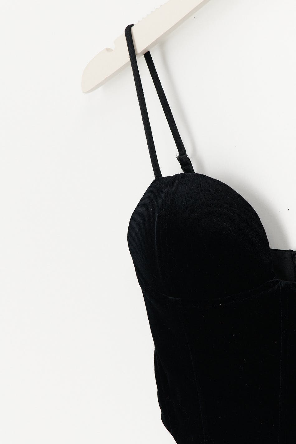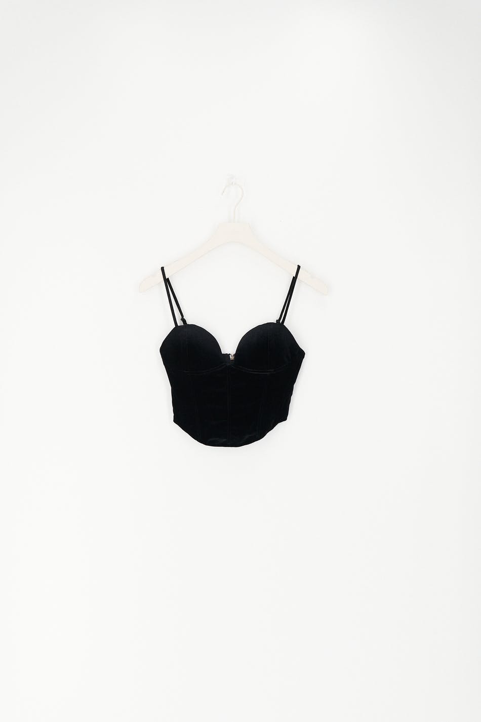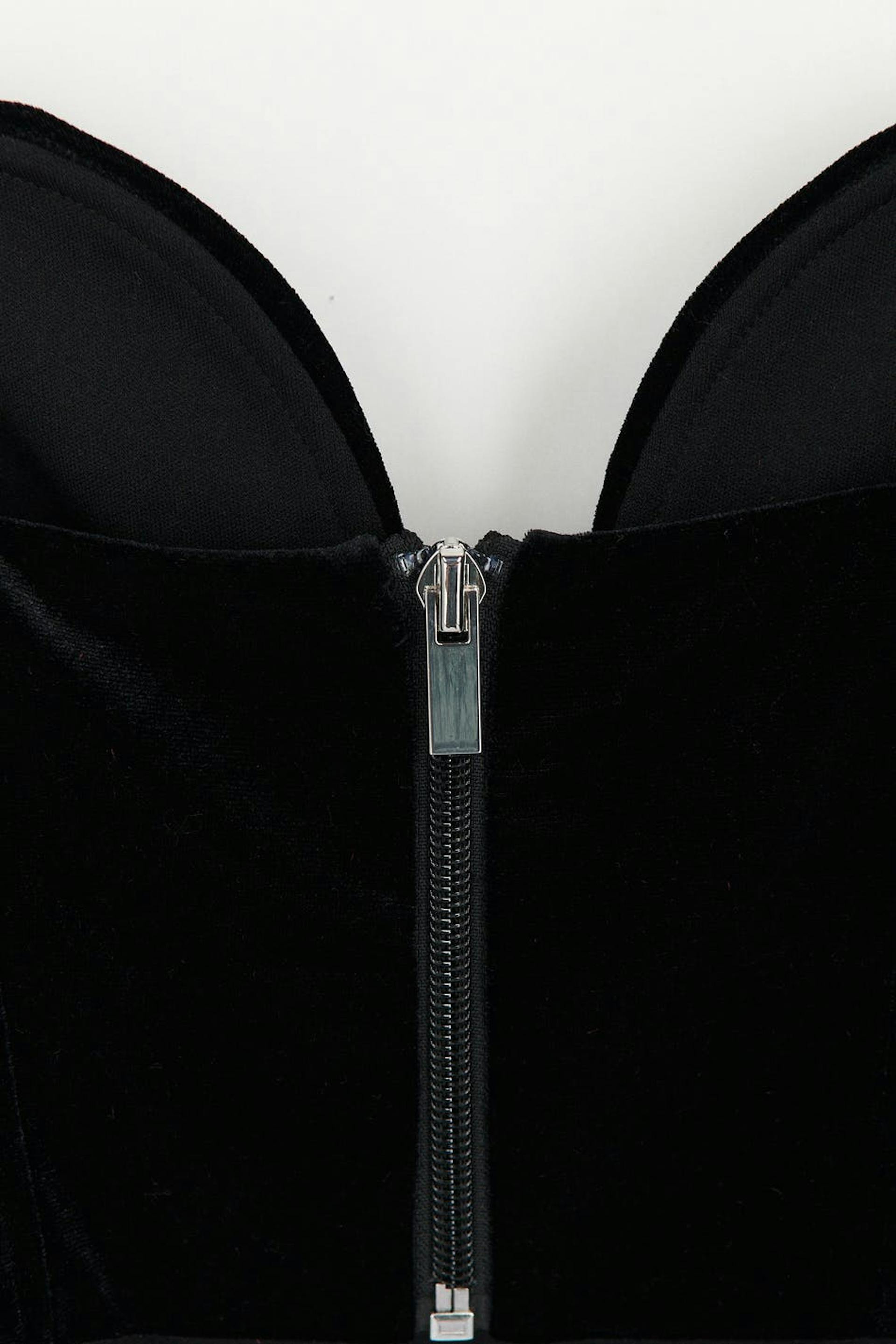 Bustier van velvet met gevoerde koppen. De bustier is zwart en heeft dunne en aanpasbare schouderriemen. Het heeft rits op de rug en baleinen aan de voorkant voor bijkomende ondersteuning.