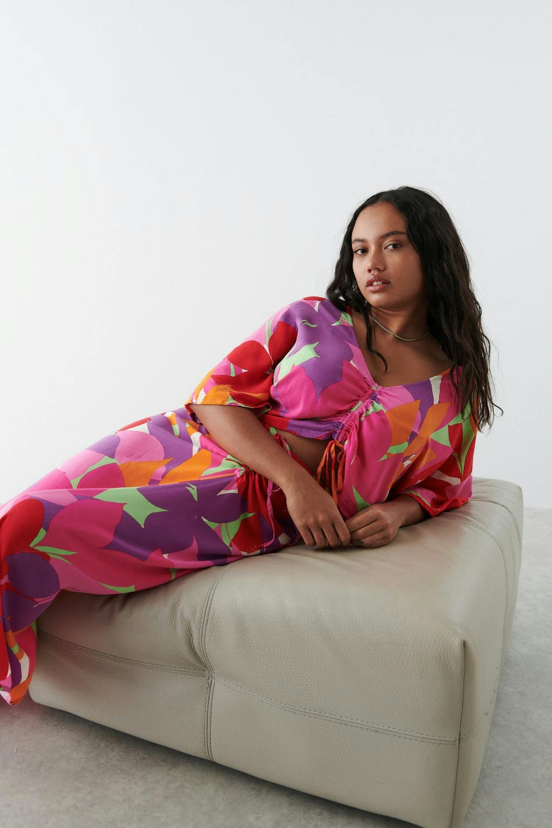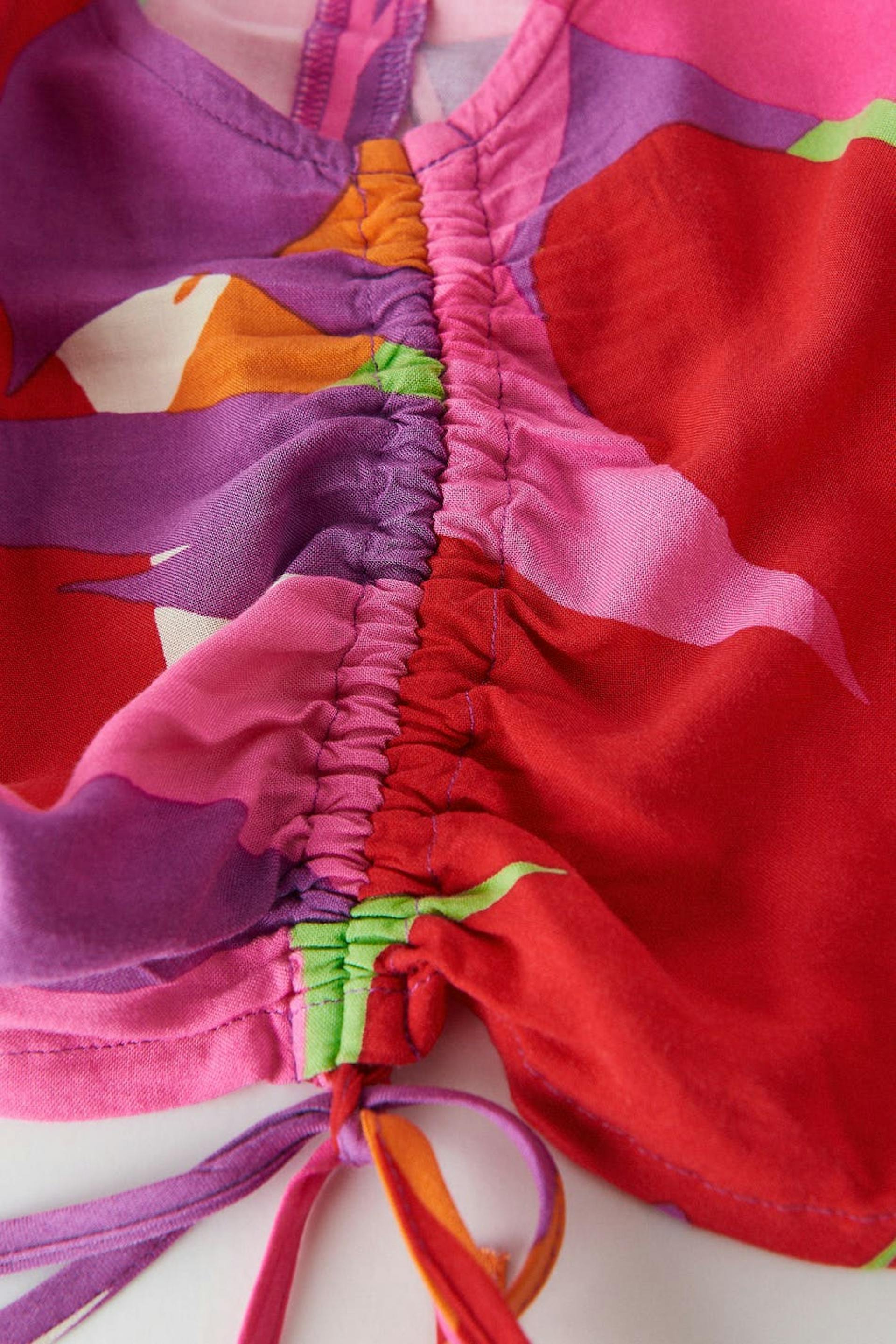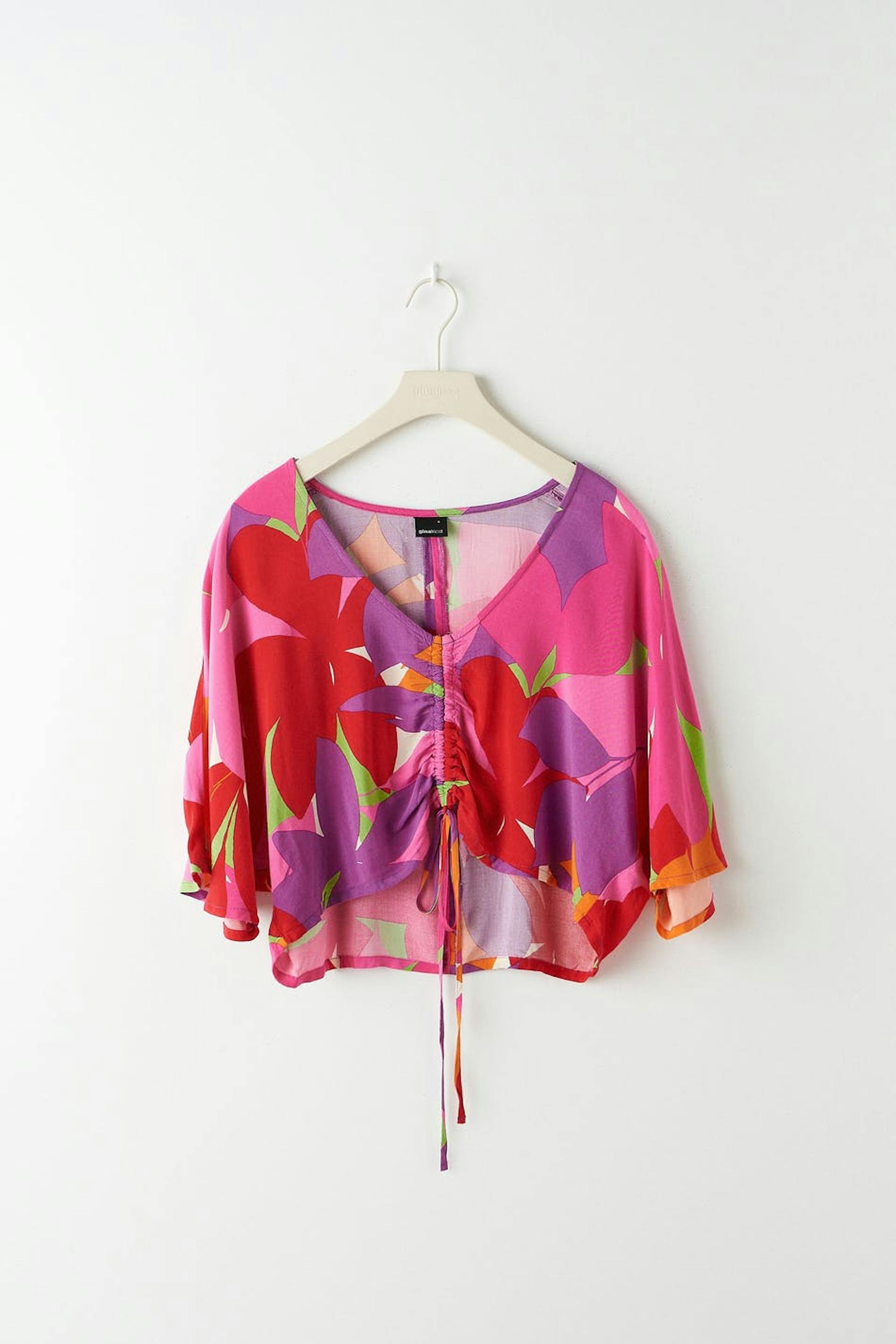 Bloes met patroon met verstelbaar trekkoord aan de voorkant. De bloes is rood, paars en afgesneden. Het heeft brede korte mouwen, hangende schouders en verzameld effect aan de voorkant.