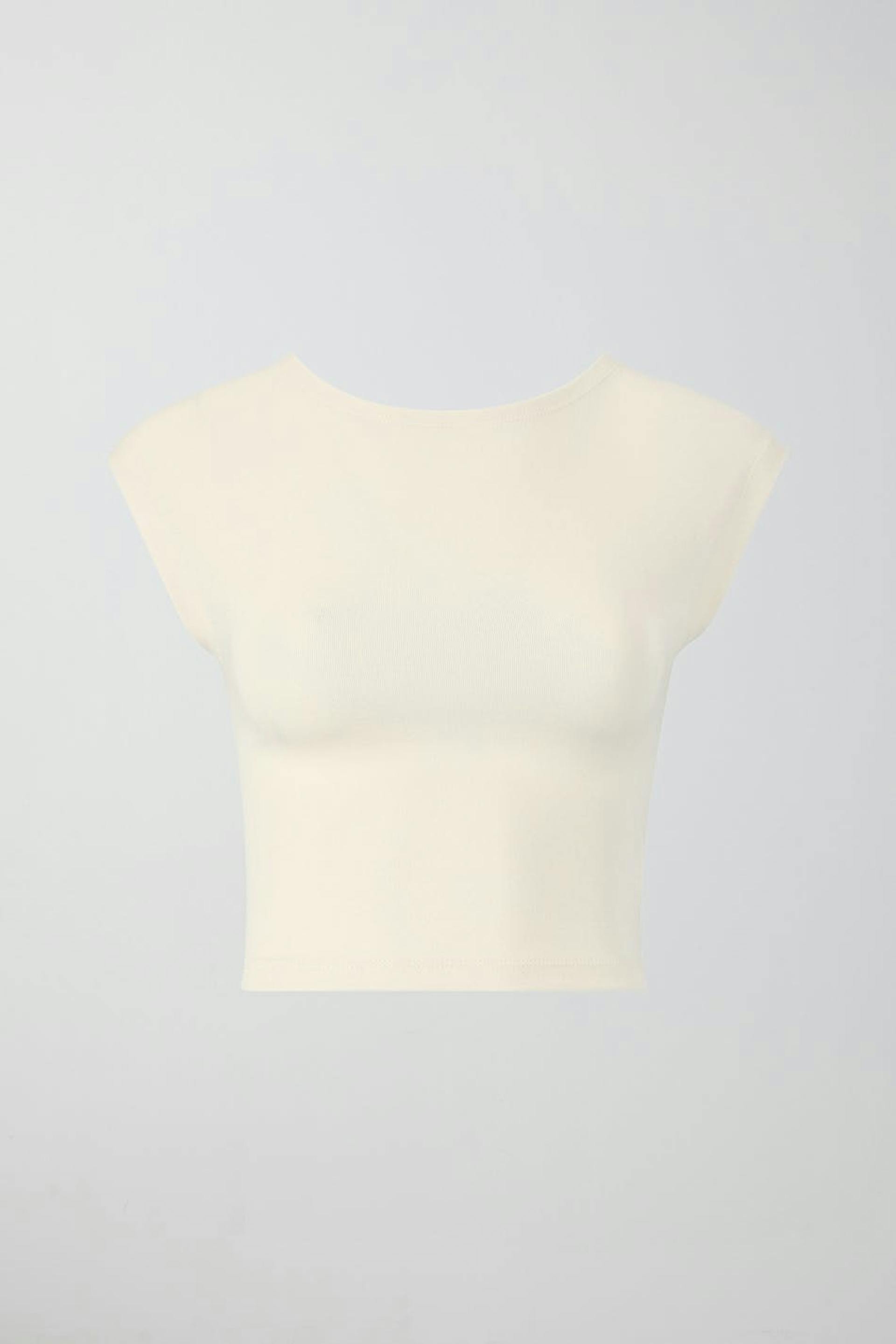 Topje met korte mouwen van tricot met nauwsluitende pasvorm. Het topje is beige en heeft ronde halslijn. Het heeft afgesneden lengte.