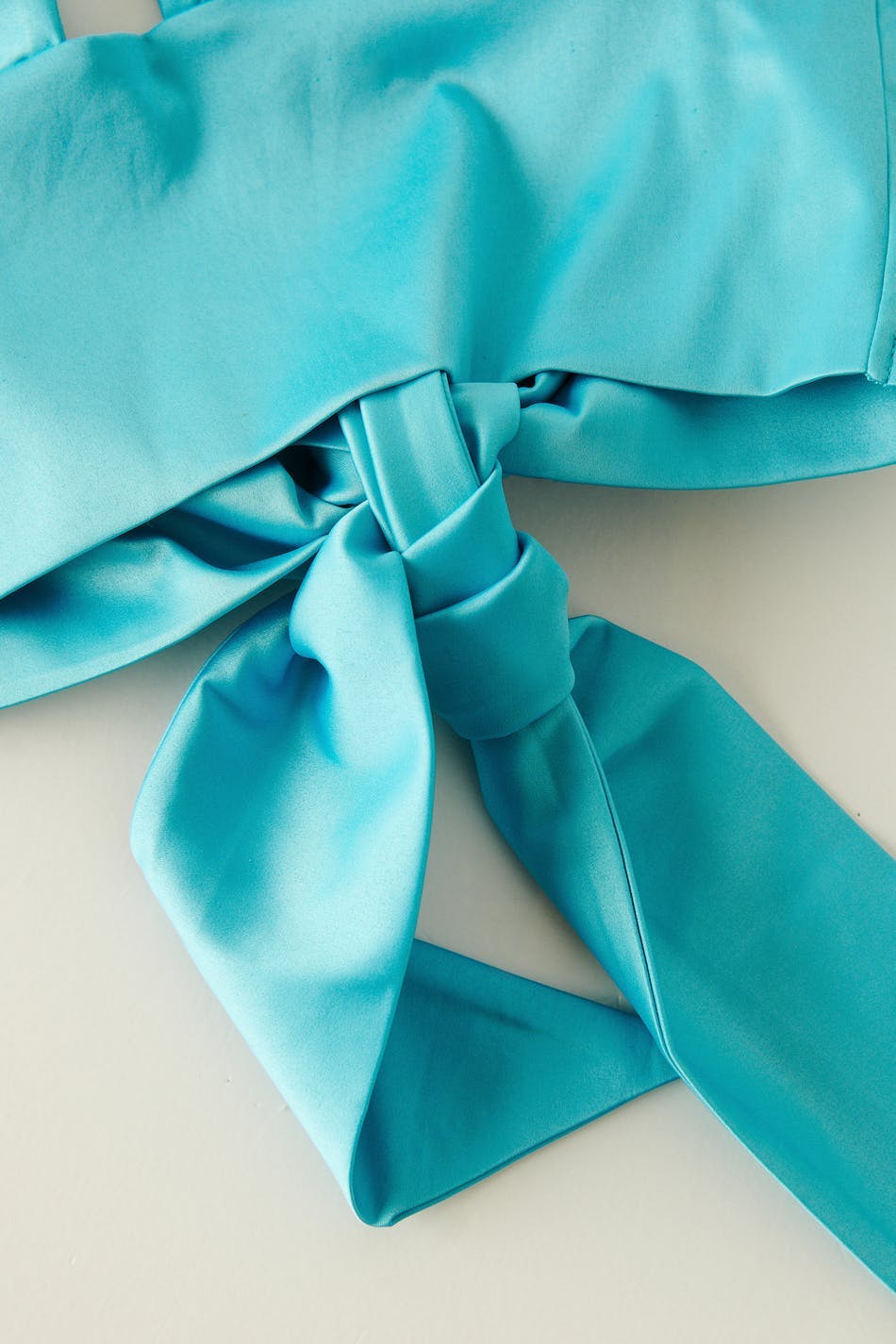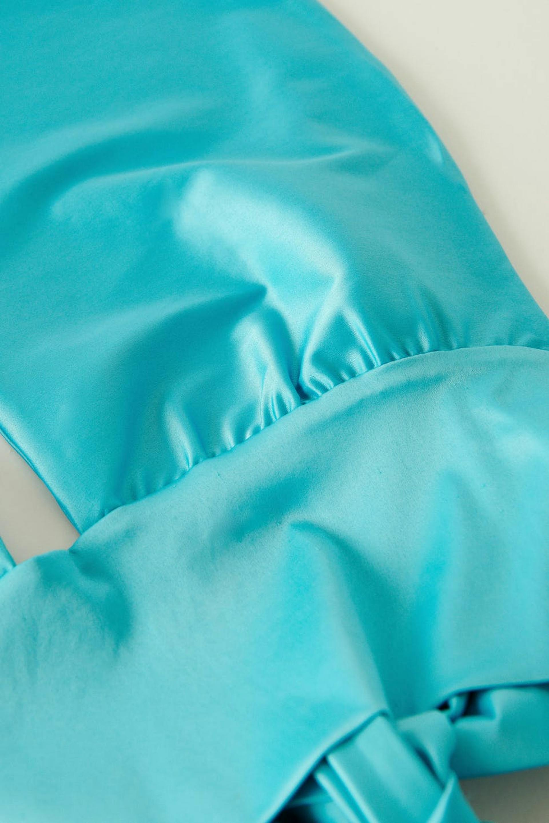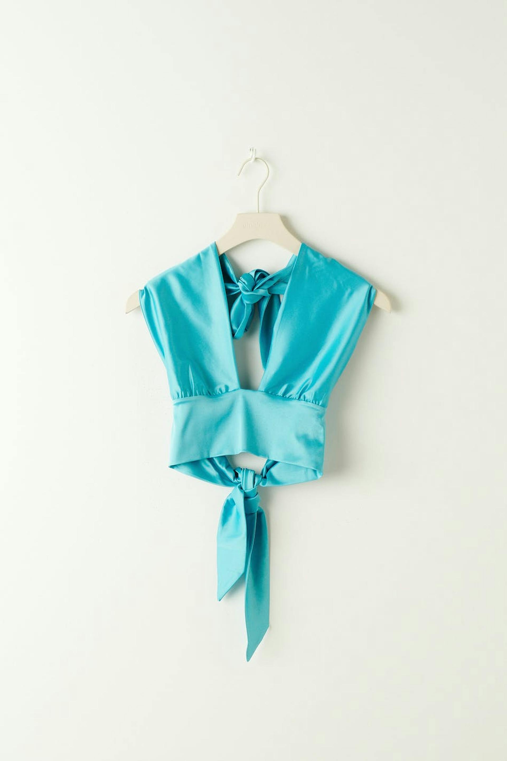 Haltertopje van satijn met open rug. Het topje is blauw en heeft een verzameld effect onder de boezem. Het heeft een wijde ceintuur met zelfbinder op de rug.
