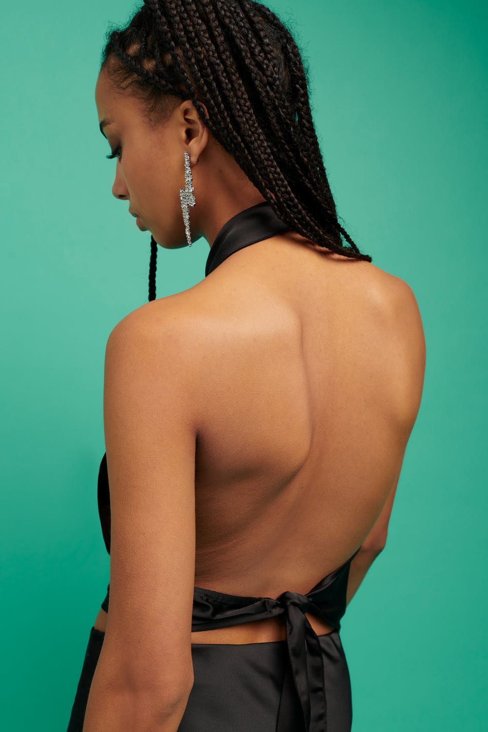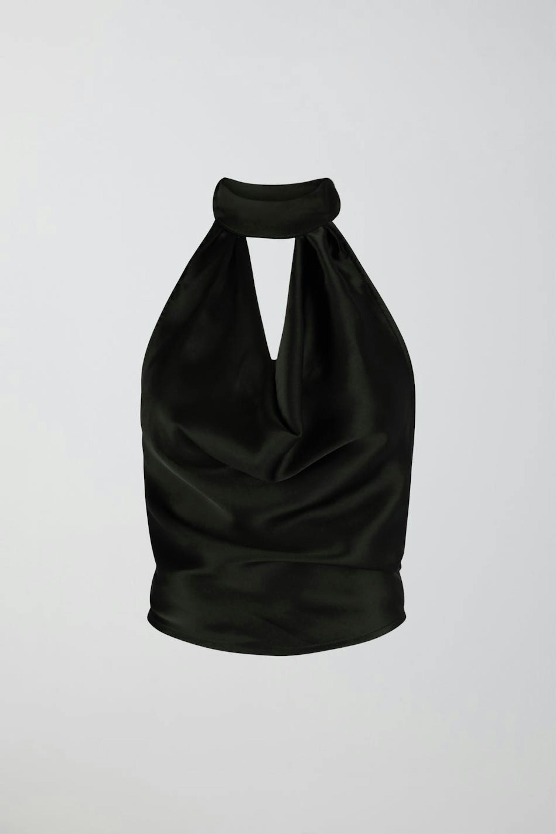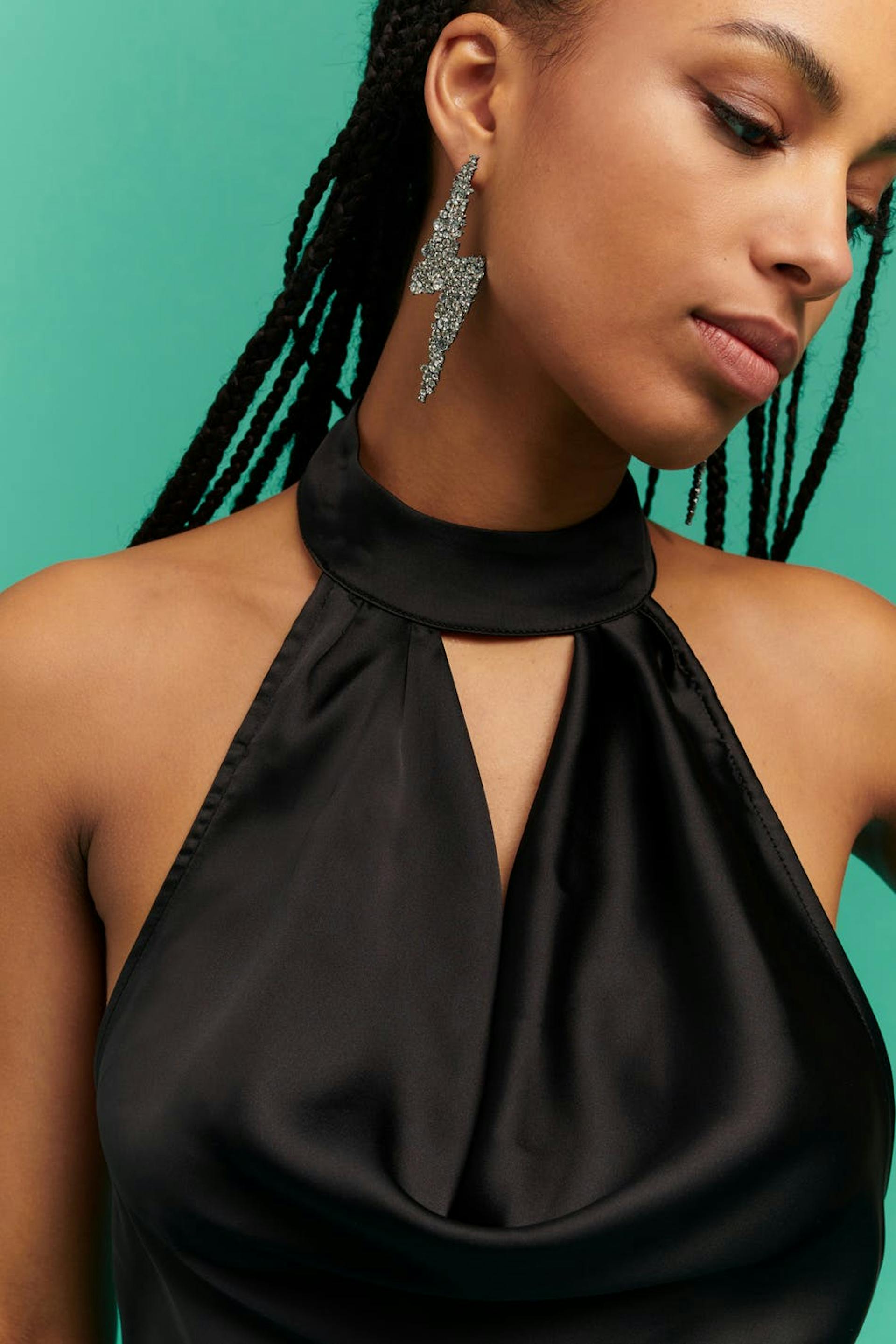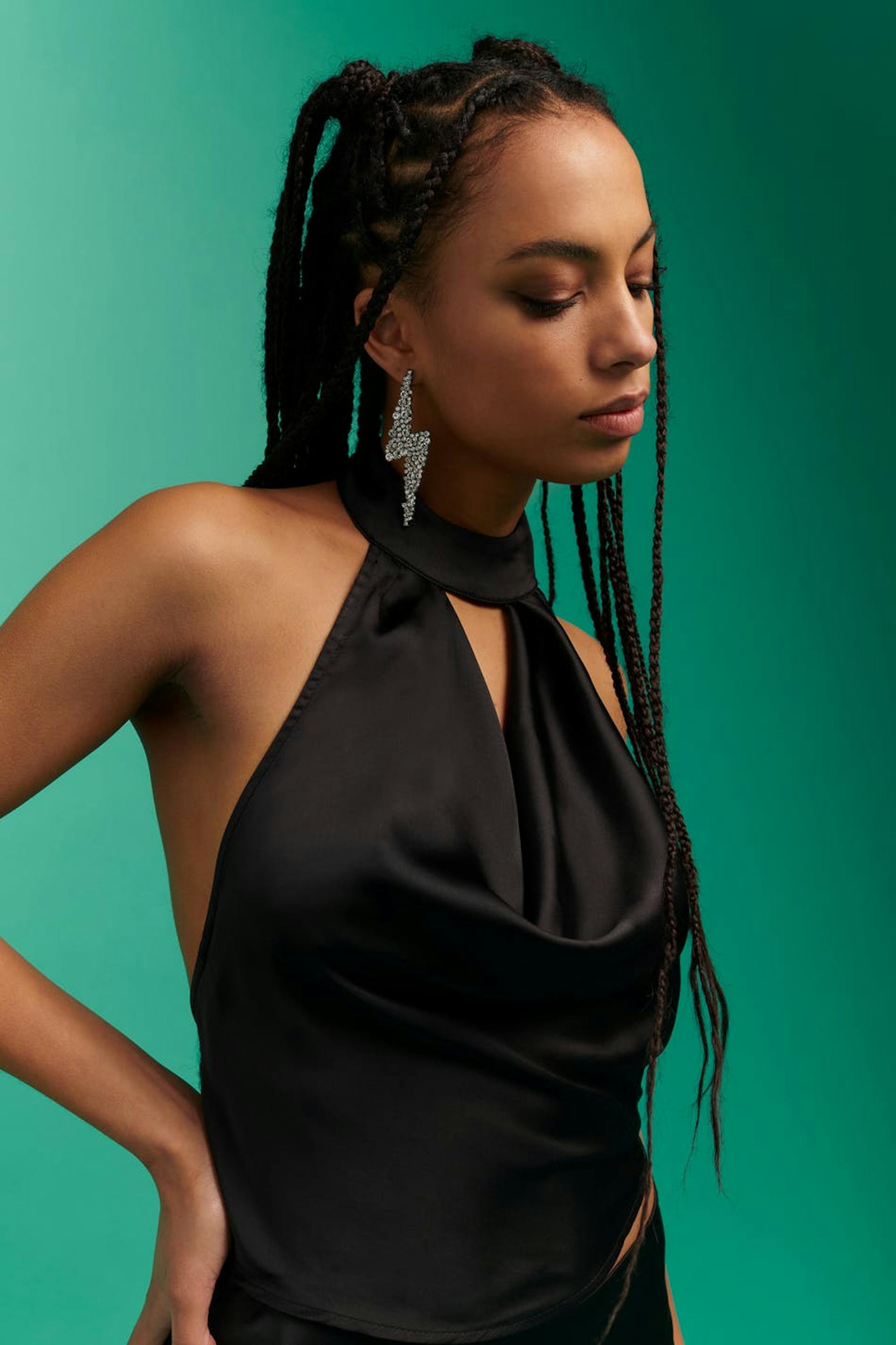 Gedrapeerd haltertopje van satijn met open rug. Het topje is perfect voor het feest, zwart en mouwloos. Het heeft een cut out detail aan de voorkant, knooppas aan de hals en zelfbinder op de rug.