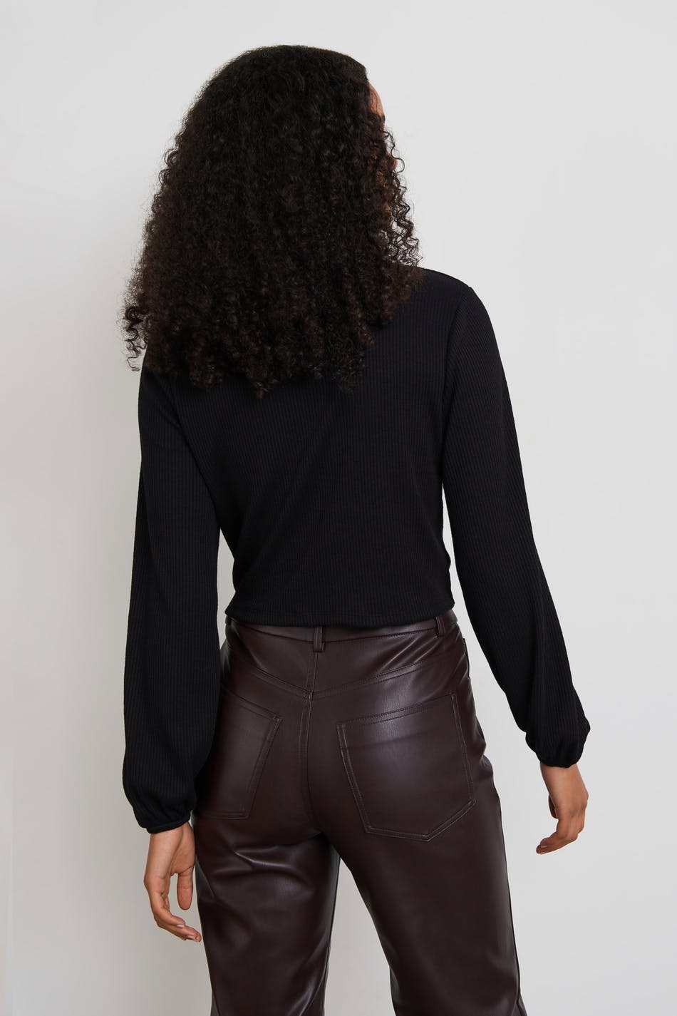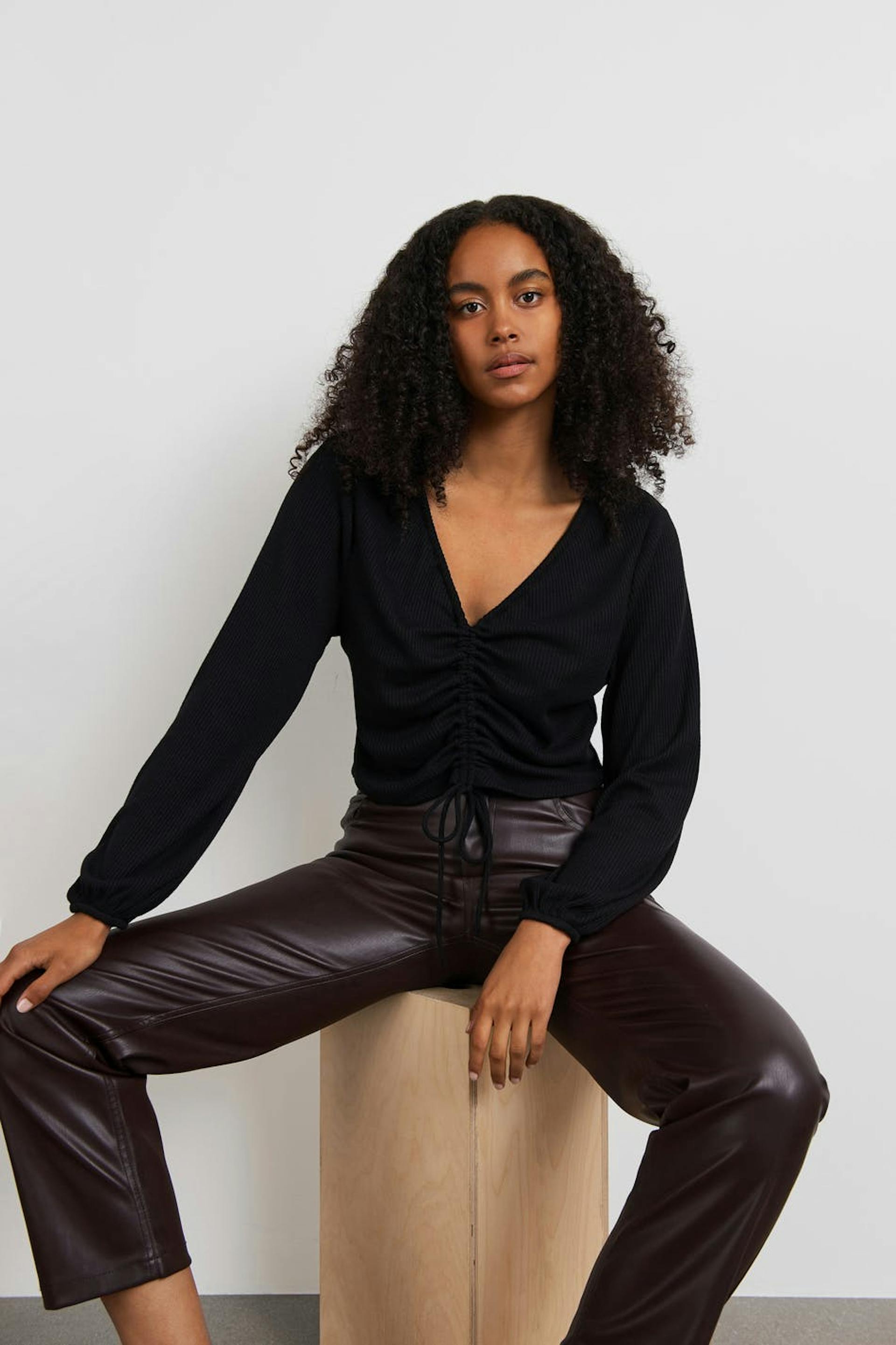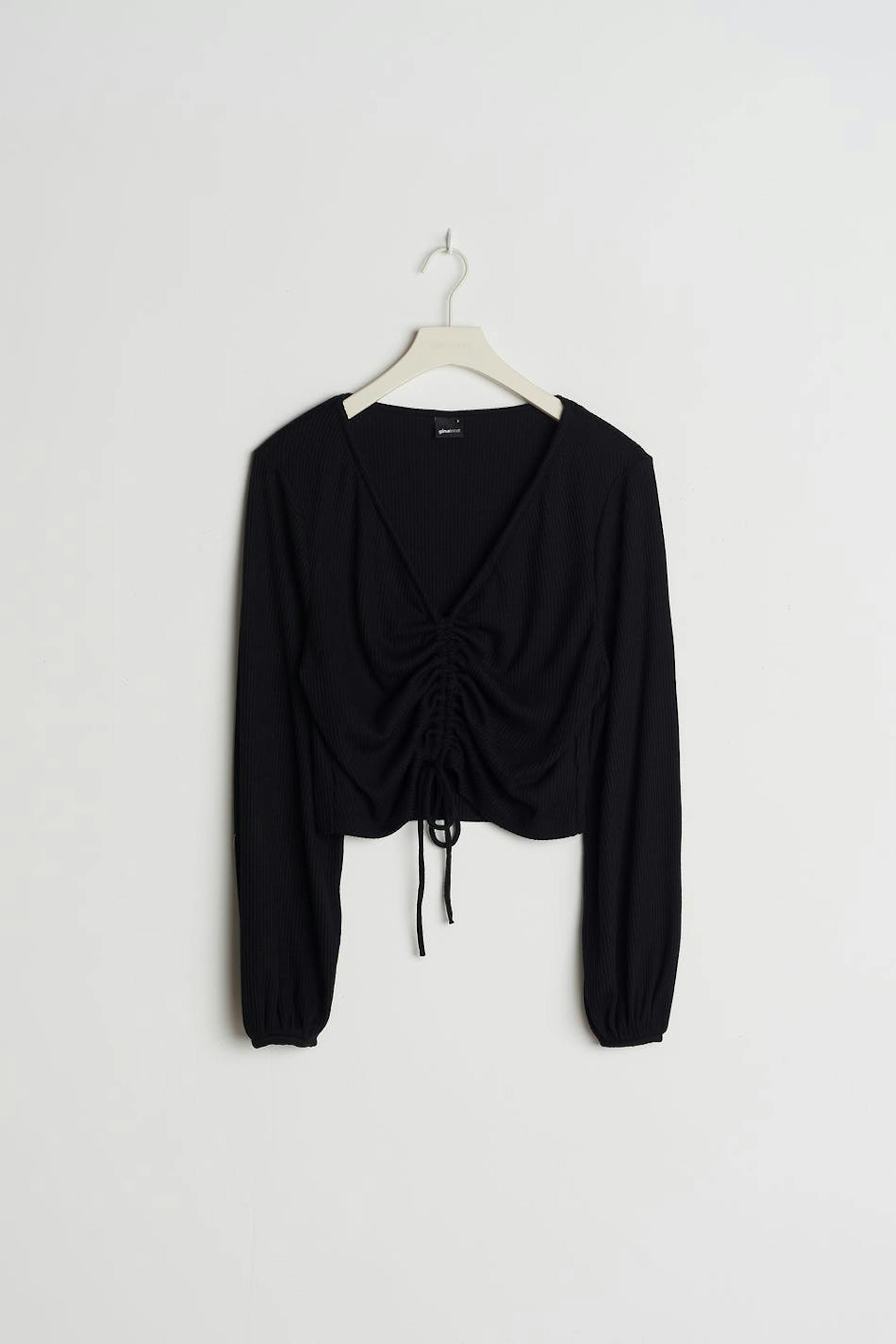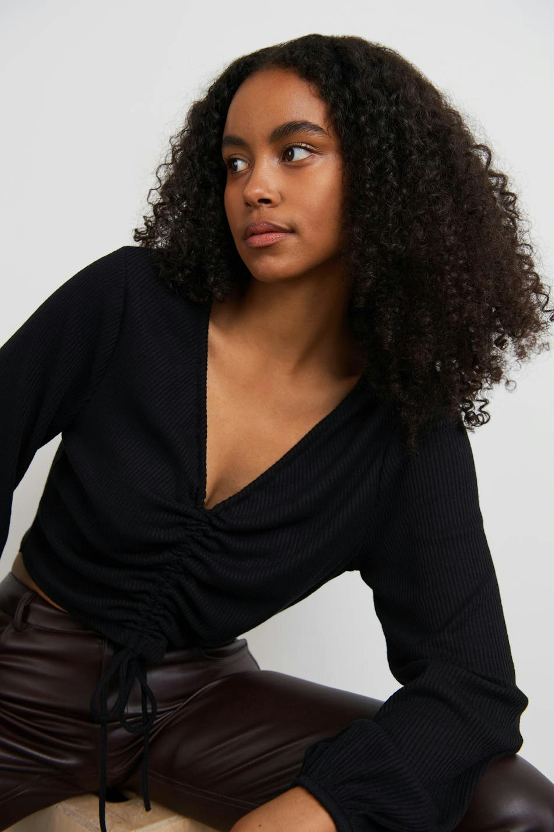 Geribbeld topje met een overmaatse pasvorm. Het topje is zwart, met lange mouwen en afgesneden. Het heeft een diepuitgesneden halslijn, verzamelde details aan de voorkant en een verstelbaar trekkoord met een zelfbinder in de onderste zoom.