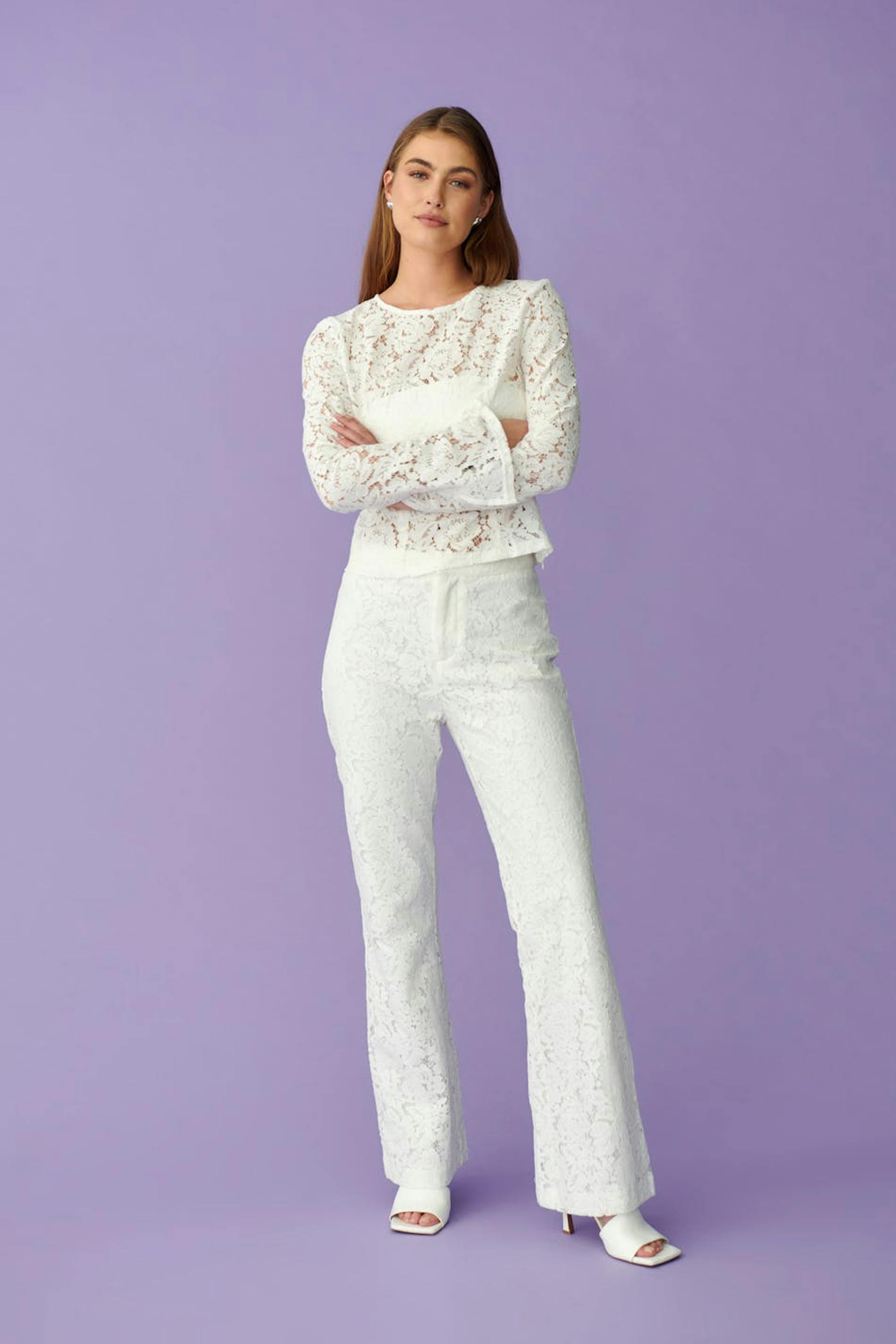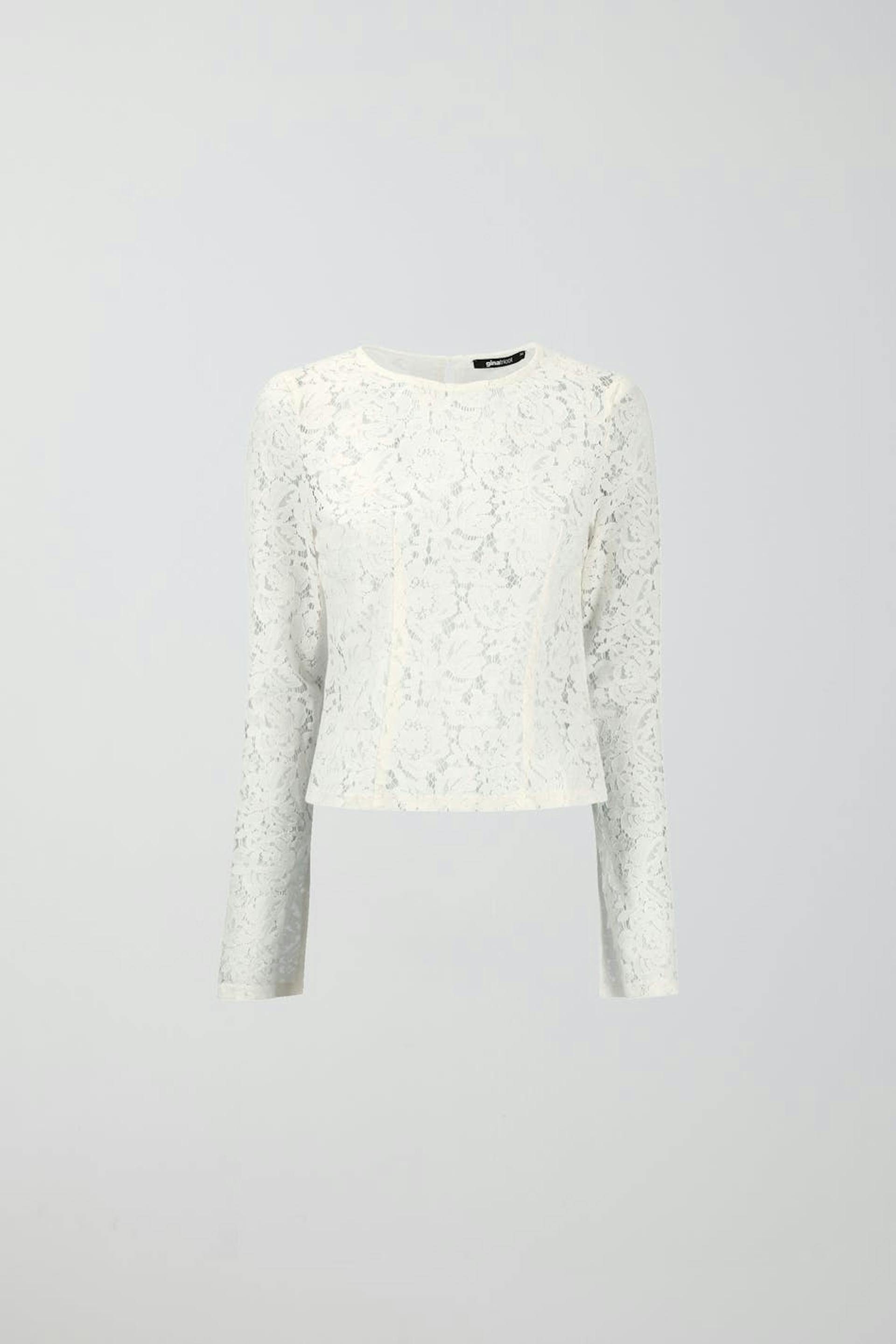 Kanten topje met lange mouwen met ronde halslijn. Het topje is wit en heeft decoratieve naden aan de voorkant.