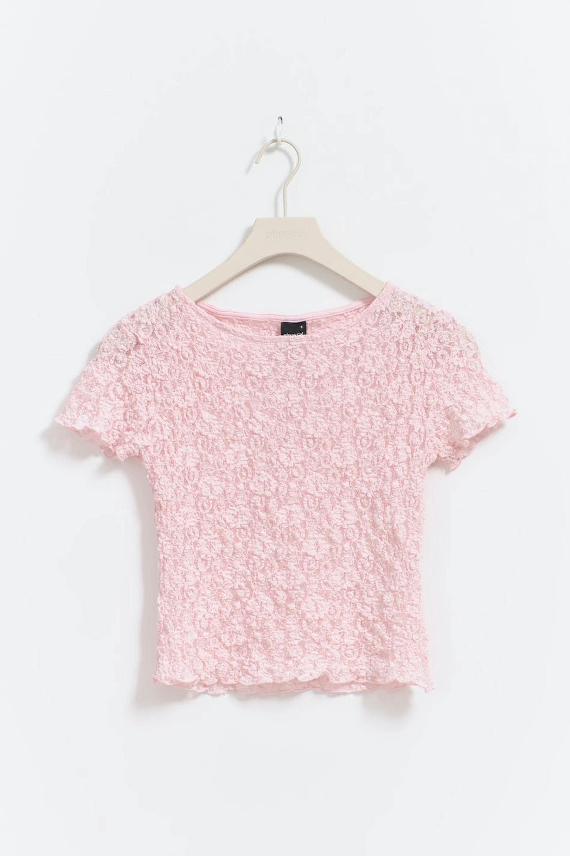 Kanten topje met korte mouwen met nauwsluitende pasvorm. Het topje is licht roze en roze en heeft getextureerde kwaliteit. Het heeft ronde halslijn en afgesneden lengte.