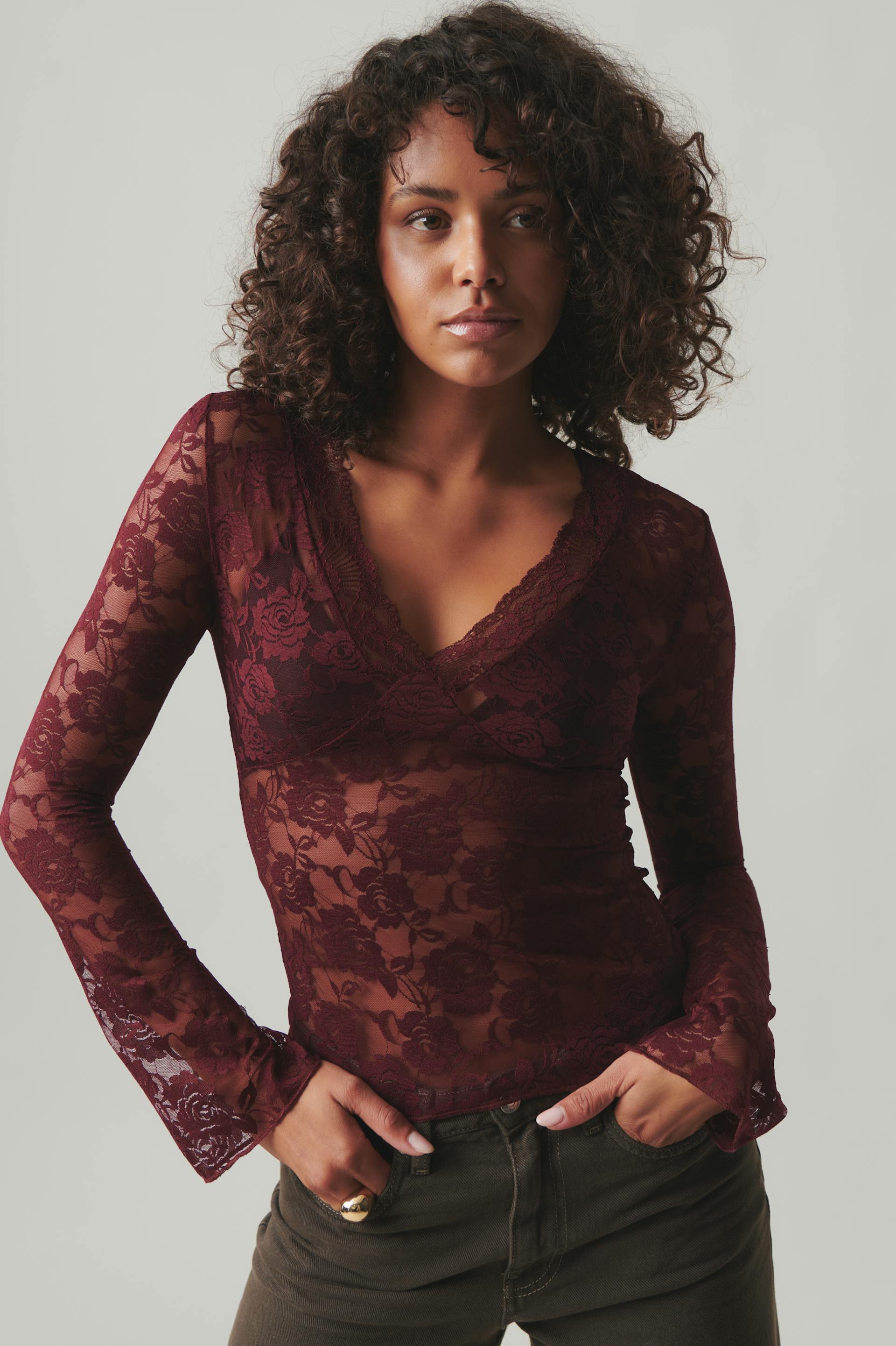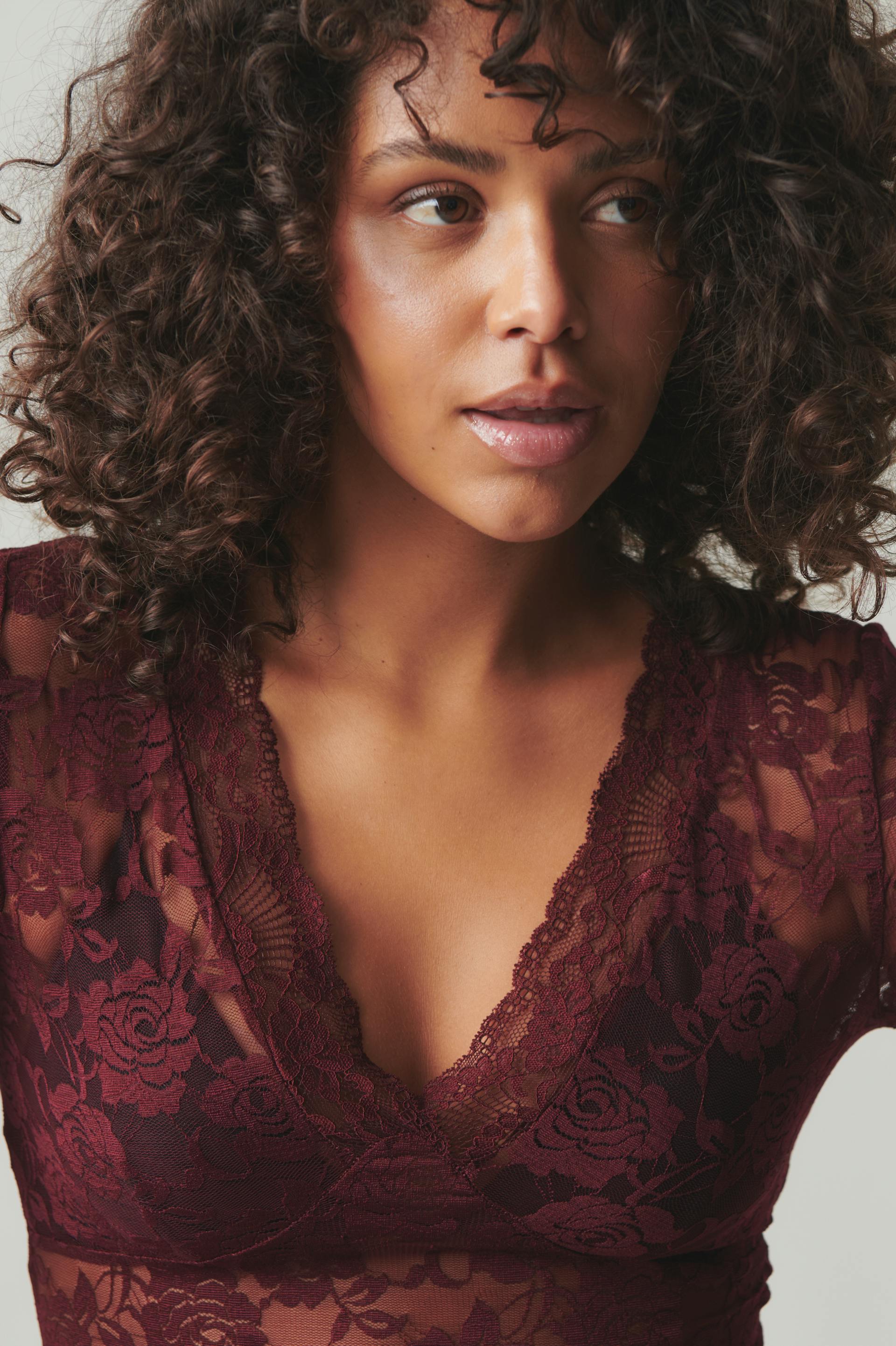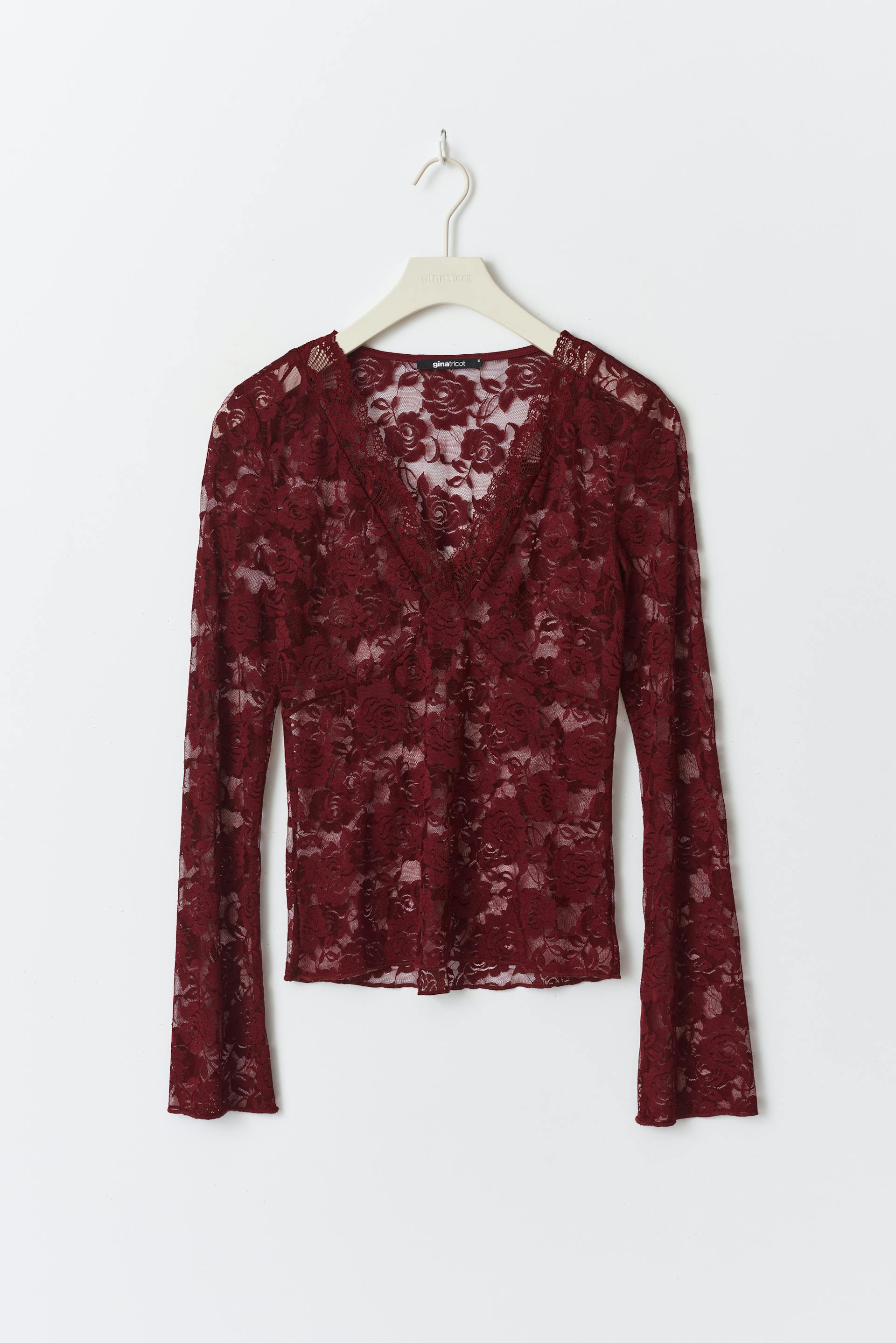 Kanten topje met lange mouwen met v-hals. Het topje is wijnrood en heeft bloemig patroon. Het heeft nauwsluitende pasvorm en normale lengte. Ongevoerd.